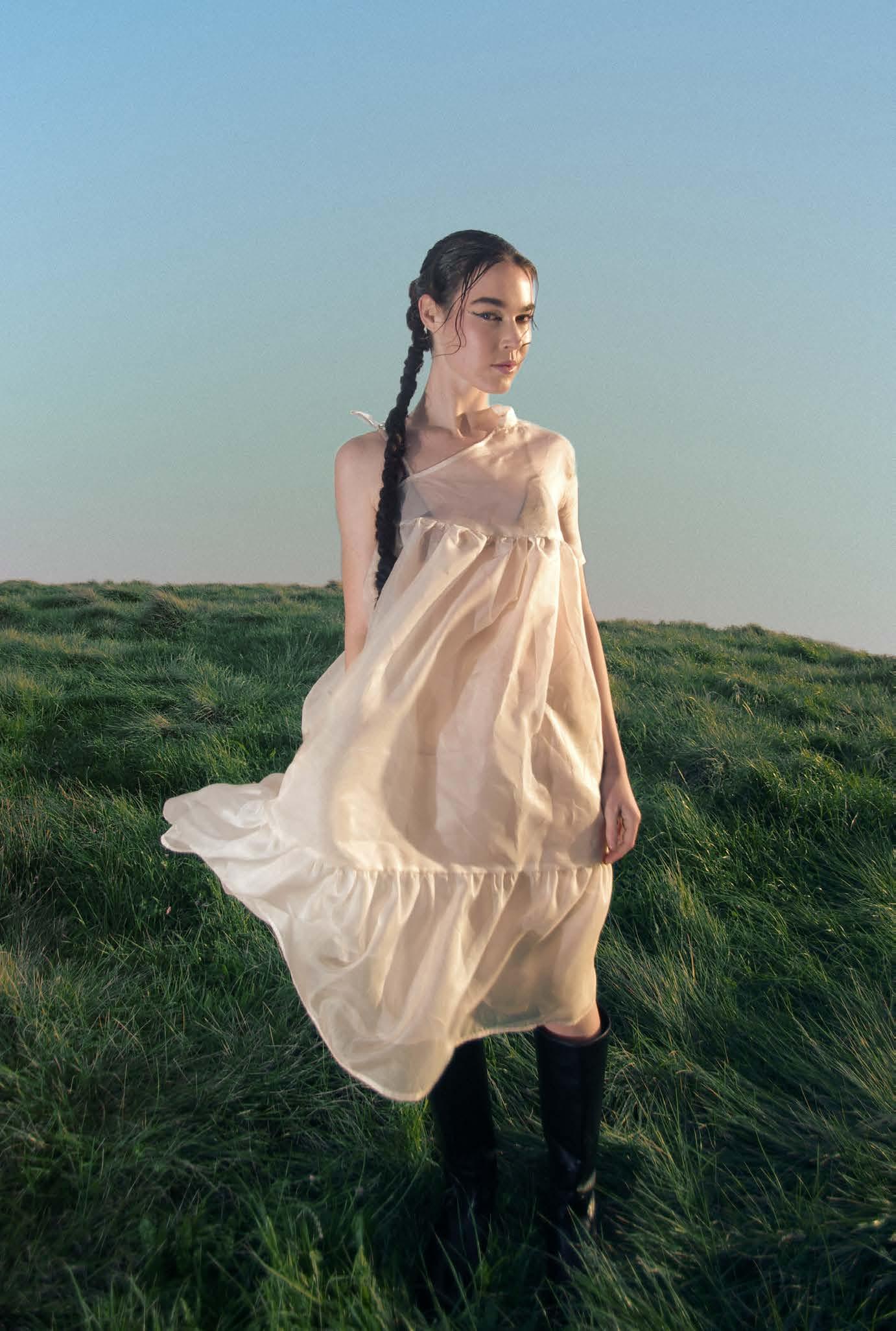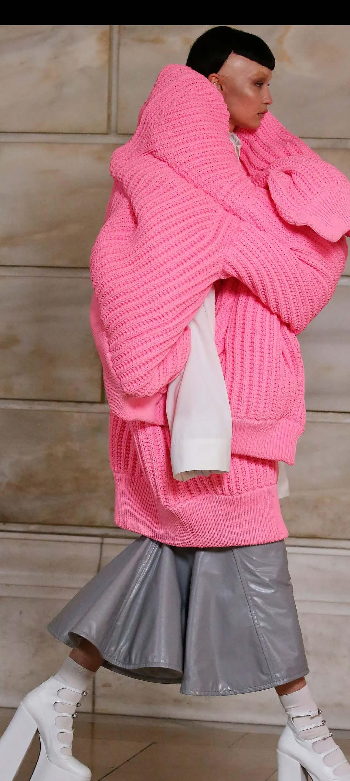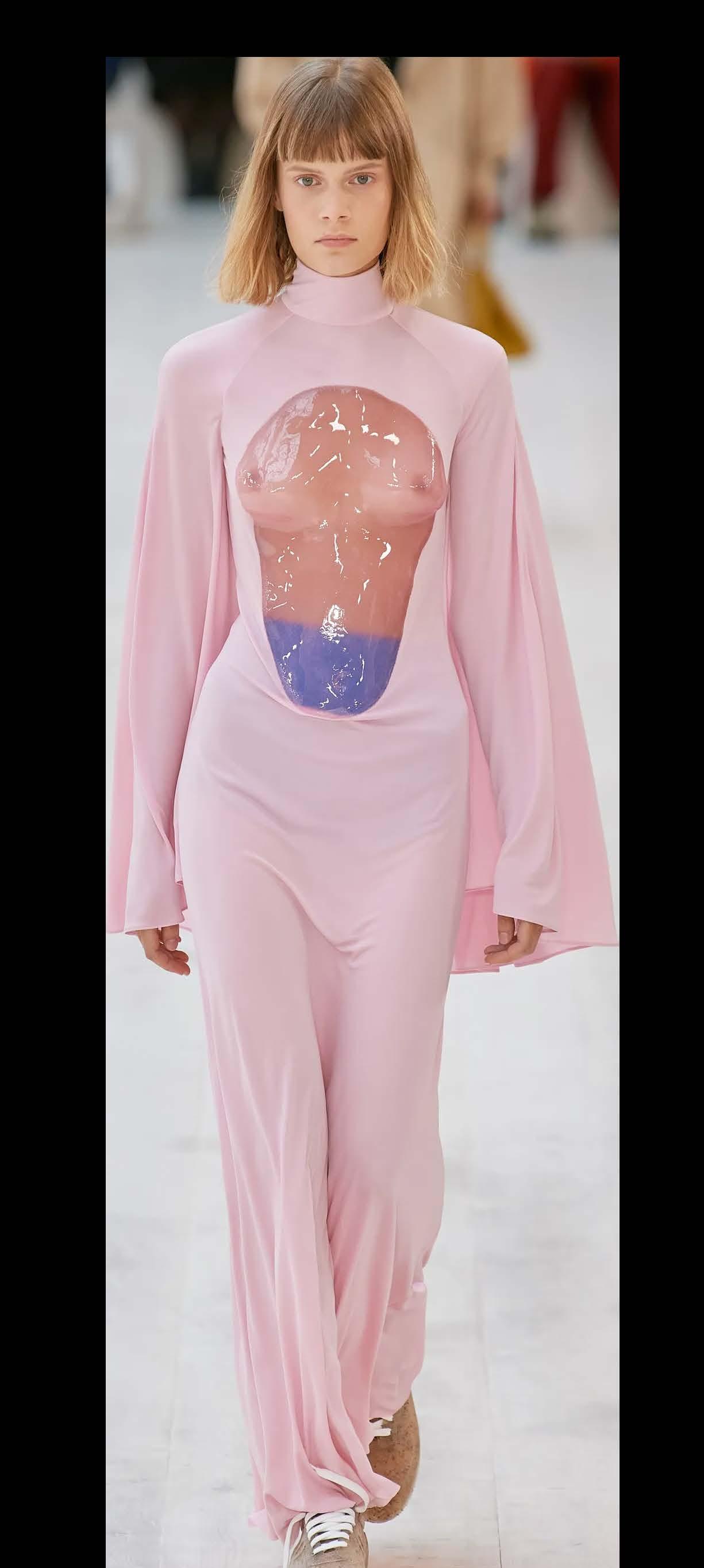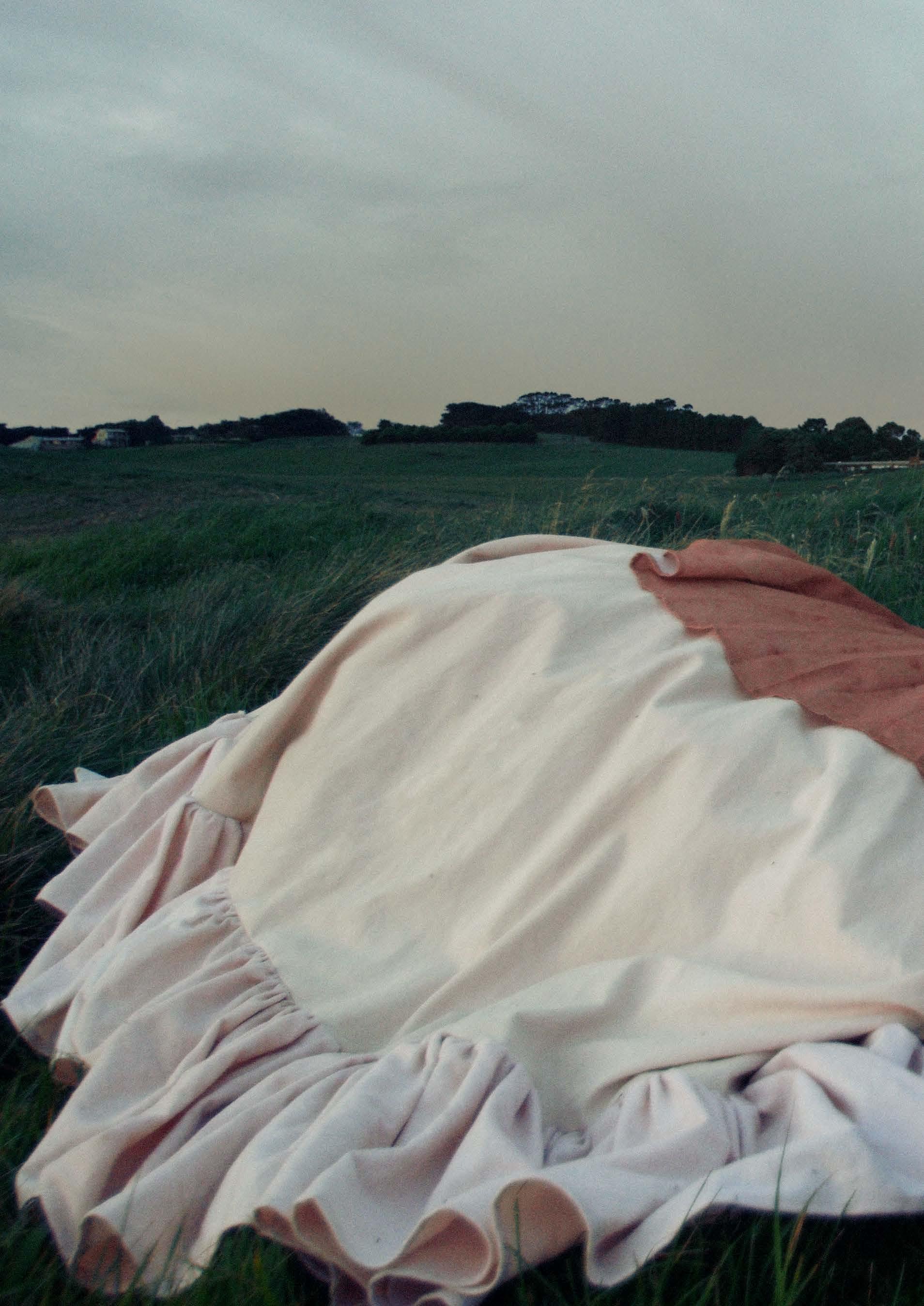 The colour palette is drawn from the hues of skin featuring muted analogous pink/red/orange tones with a discordal pale mint. Texture is explored visually through the prints of skin onto fabric but also physically through the pleats which come out from underneath the other garments.