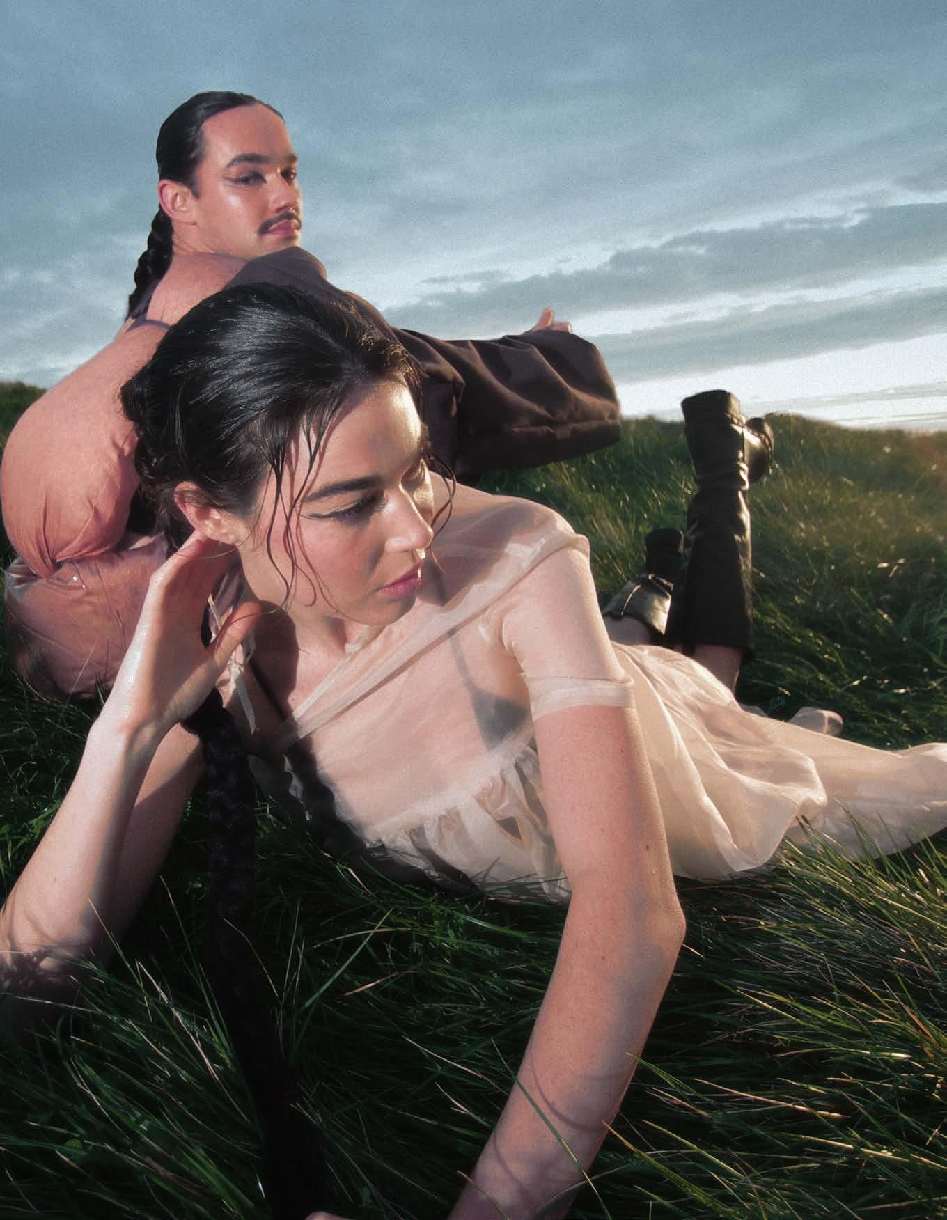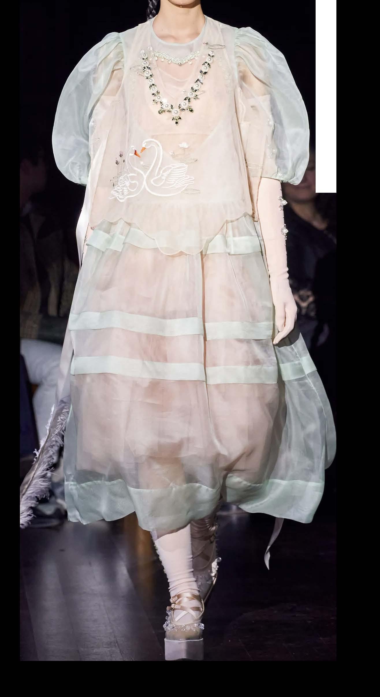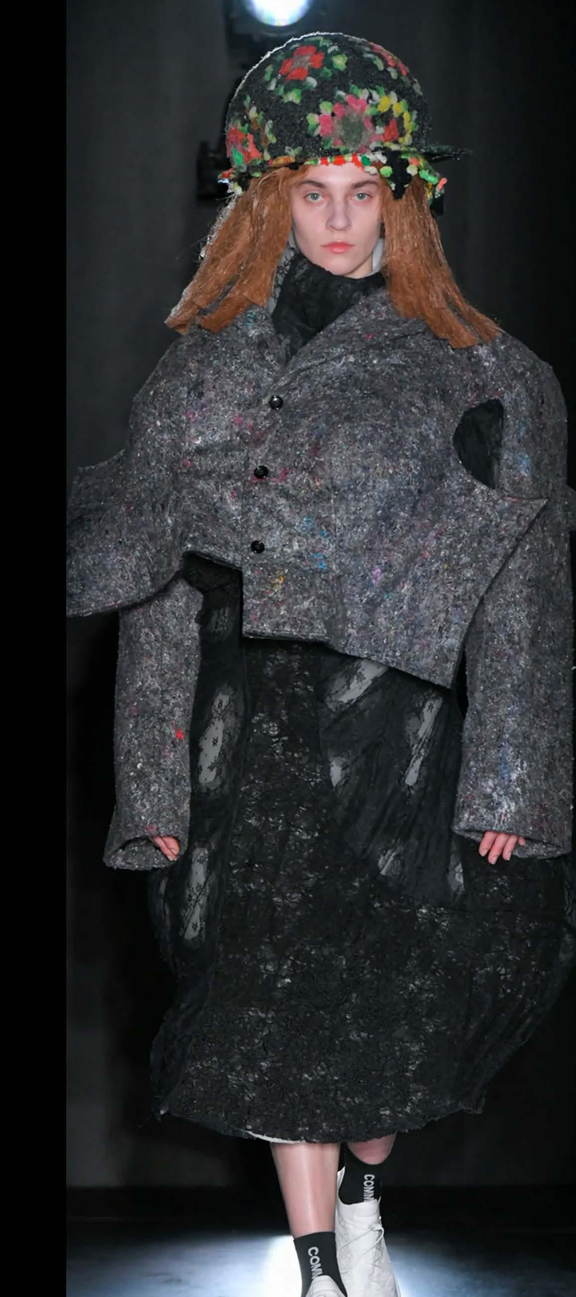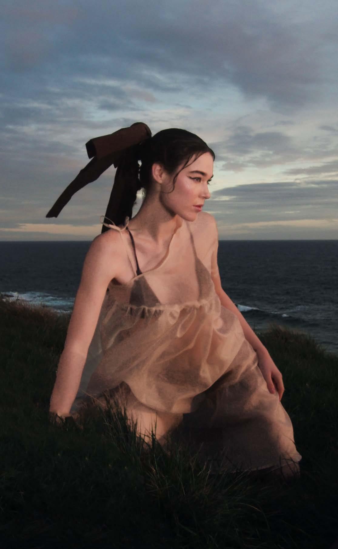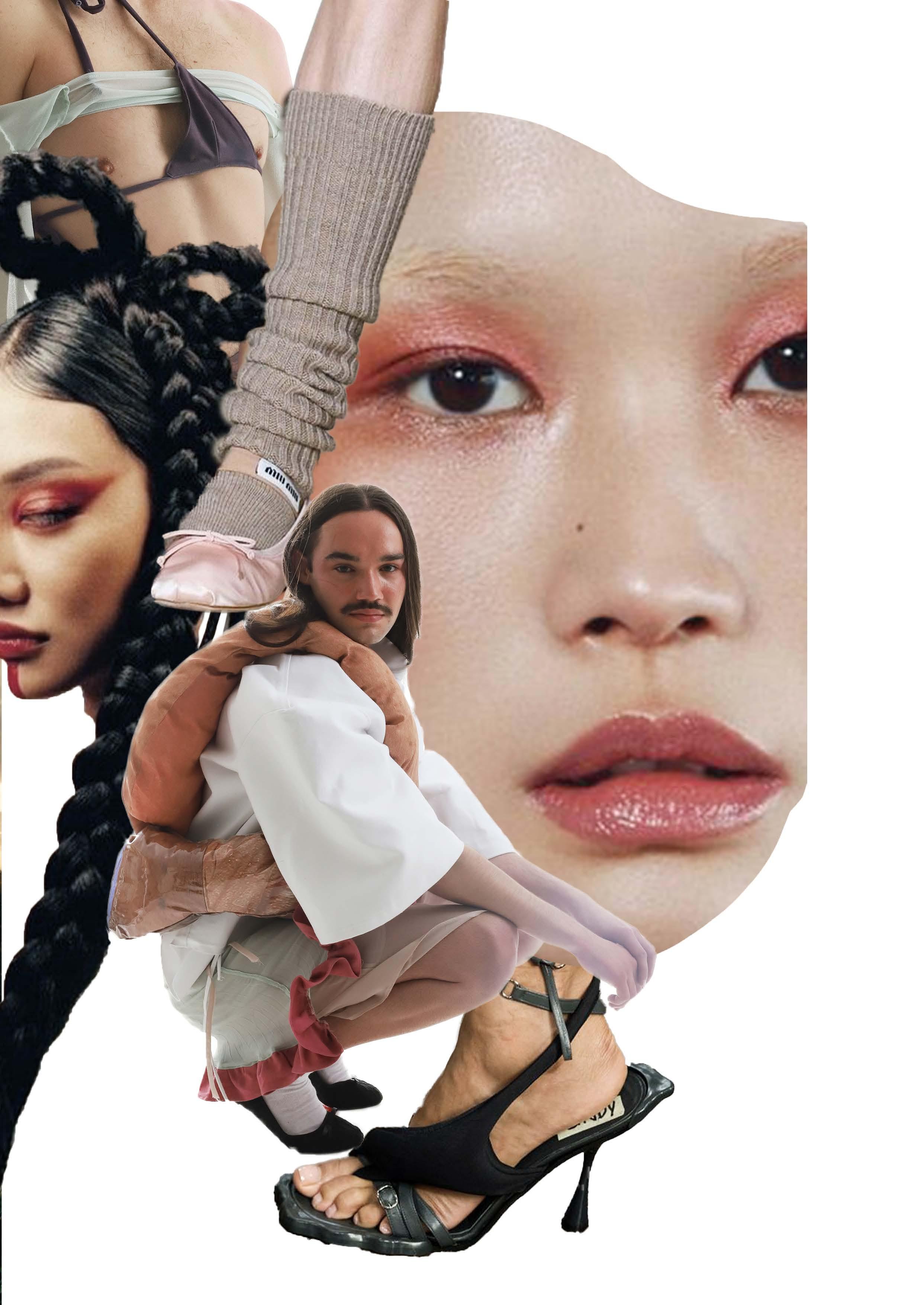 The colour palette is drawn from the hues of skin featuring muted analogous pink/red/orange tones with a discordal pale mint. Texture is explored visually through the prints of skin onto fabric but also physically through the pleats which come out from underneath the other garments.