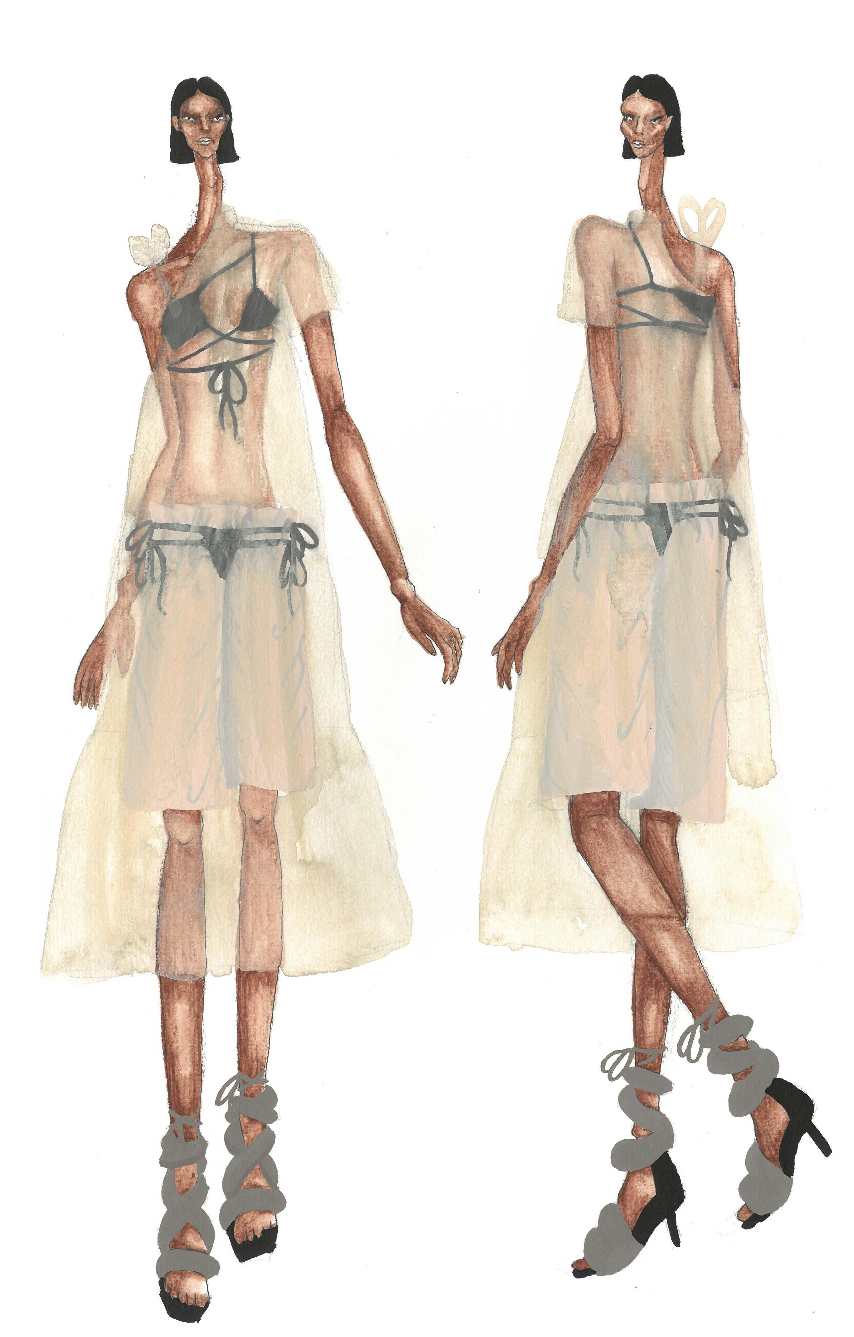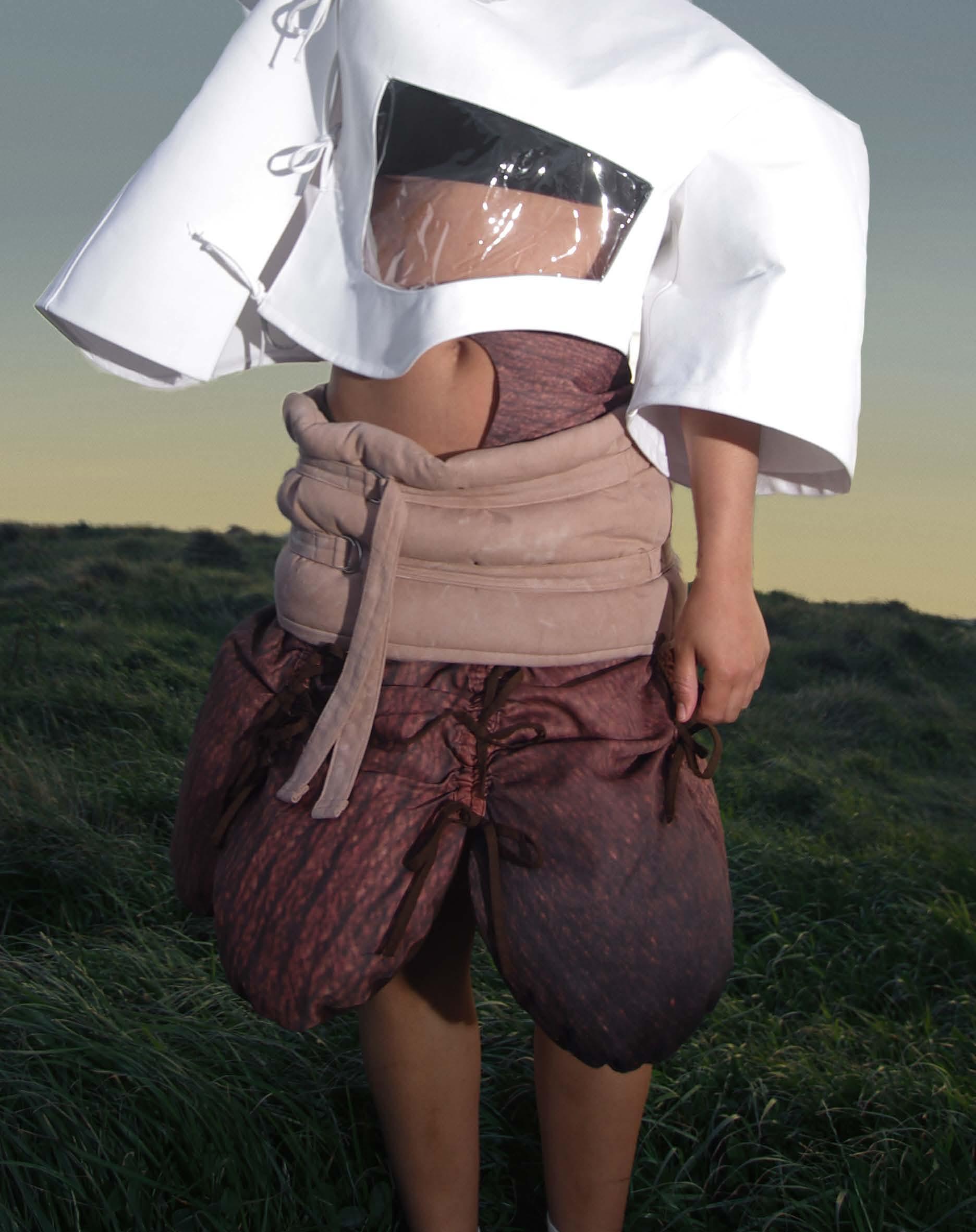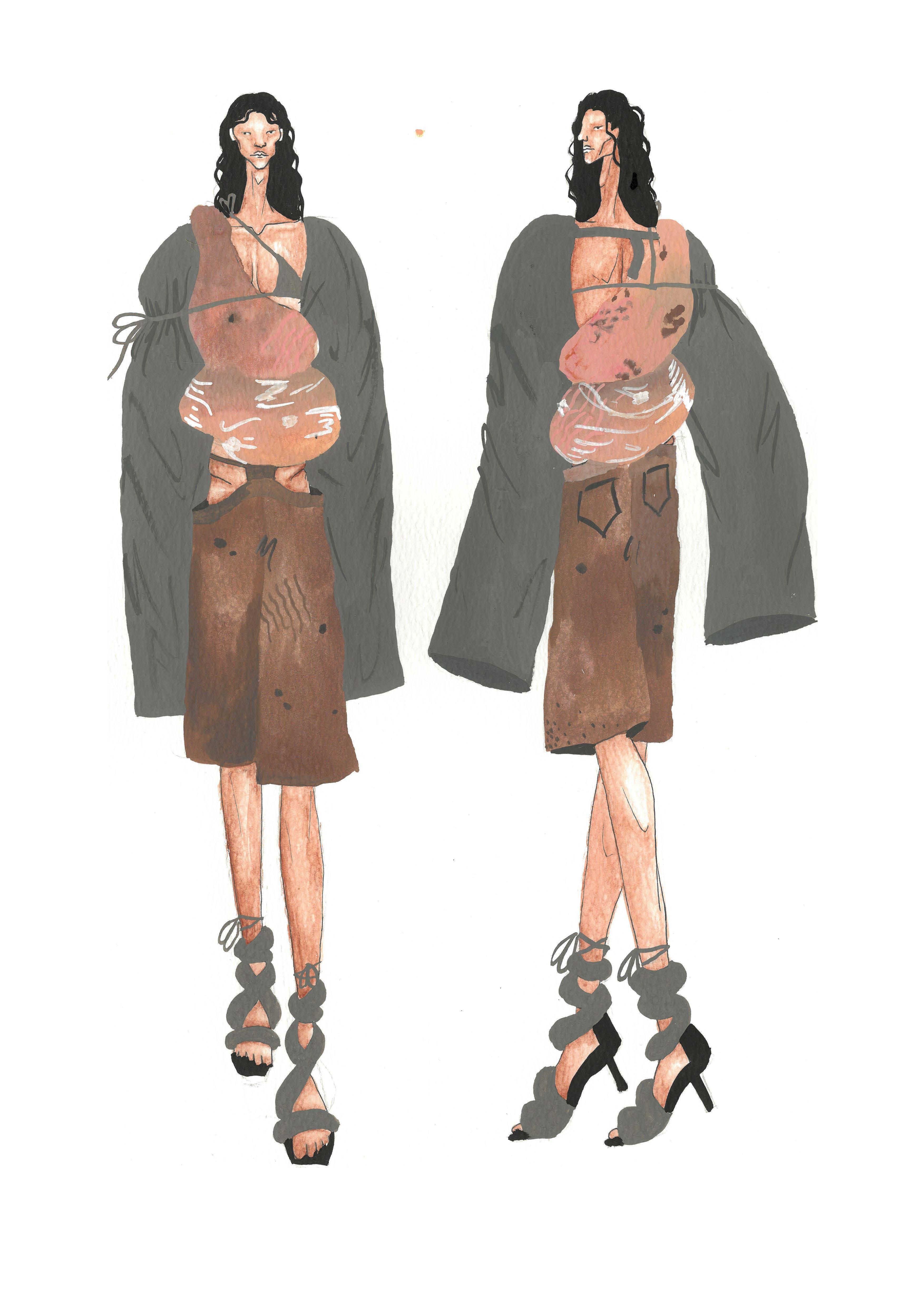 This collection aims to celebrate the different textures, colours and shapes of skin in an imagined near future world. The human body will not only be highlighted and revealed, but disfigured and caricatured through the use of silhouette and layering. The fabric will explore skin textures through visual photographic prints of different body parts, and tactile fabrication. The emphasis of natural colours and the natural body will be contrasted with the idea of transhumanism and how biology will merge with the artificial. Will human skin possibly evolve to become part plastic to prevent aging? Or will bodies be appreciated as a temporary part of life?