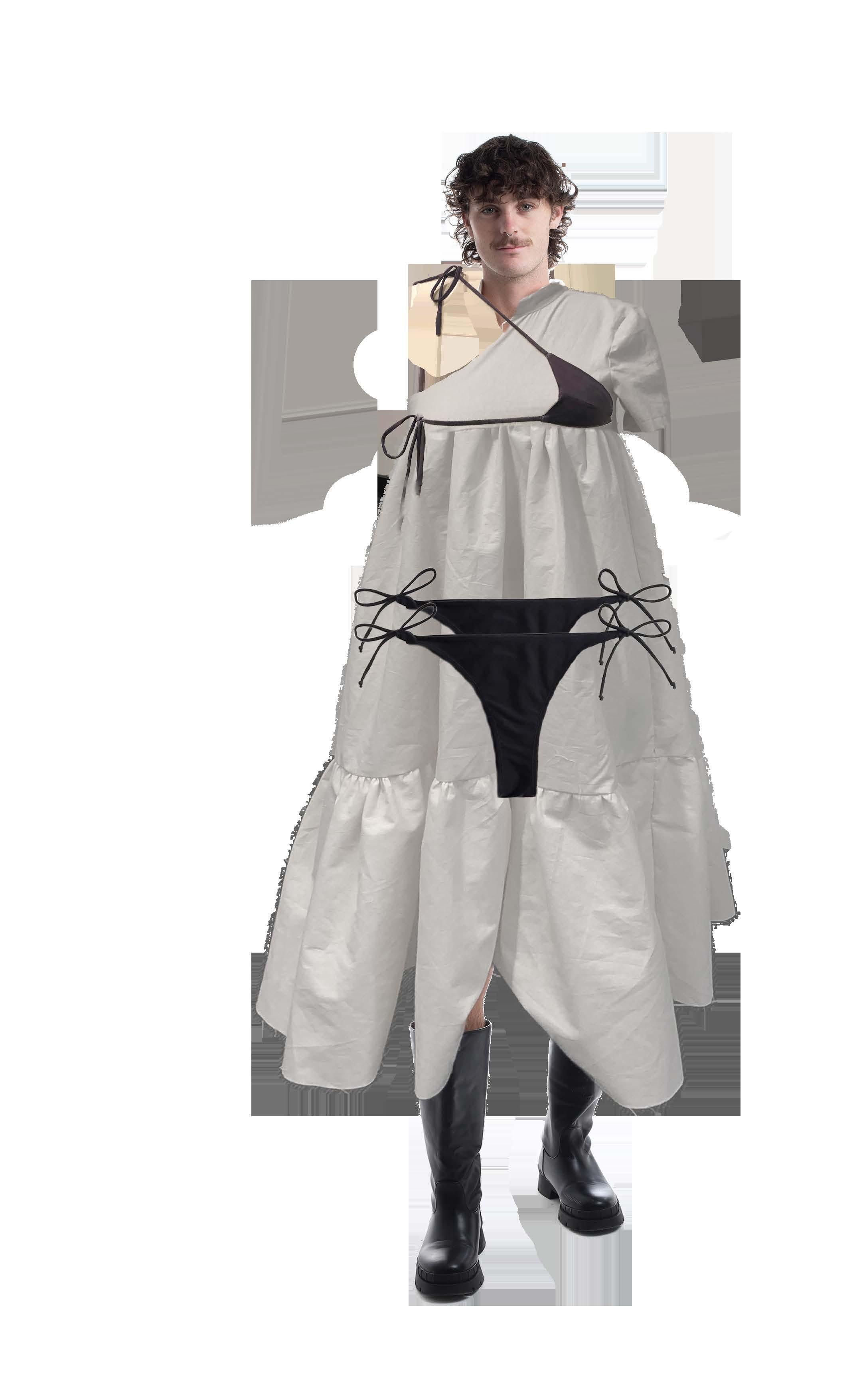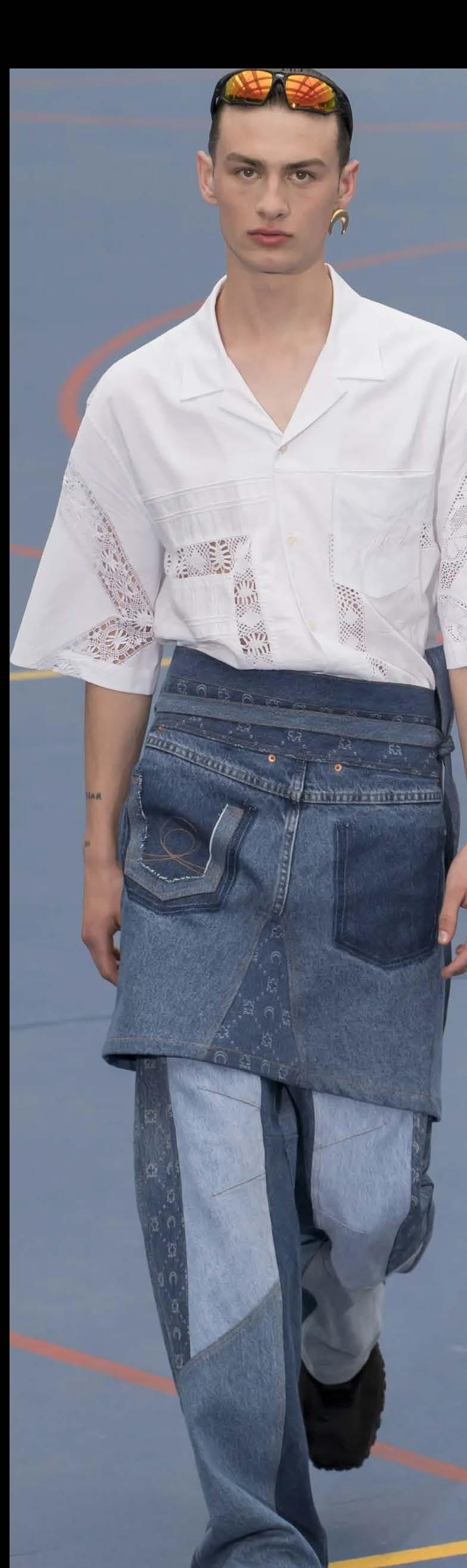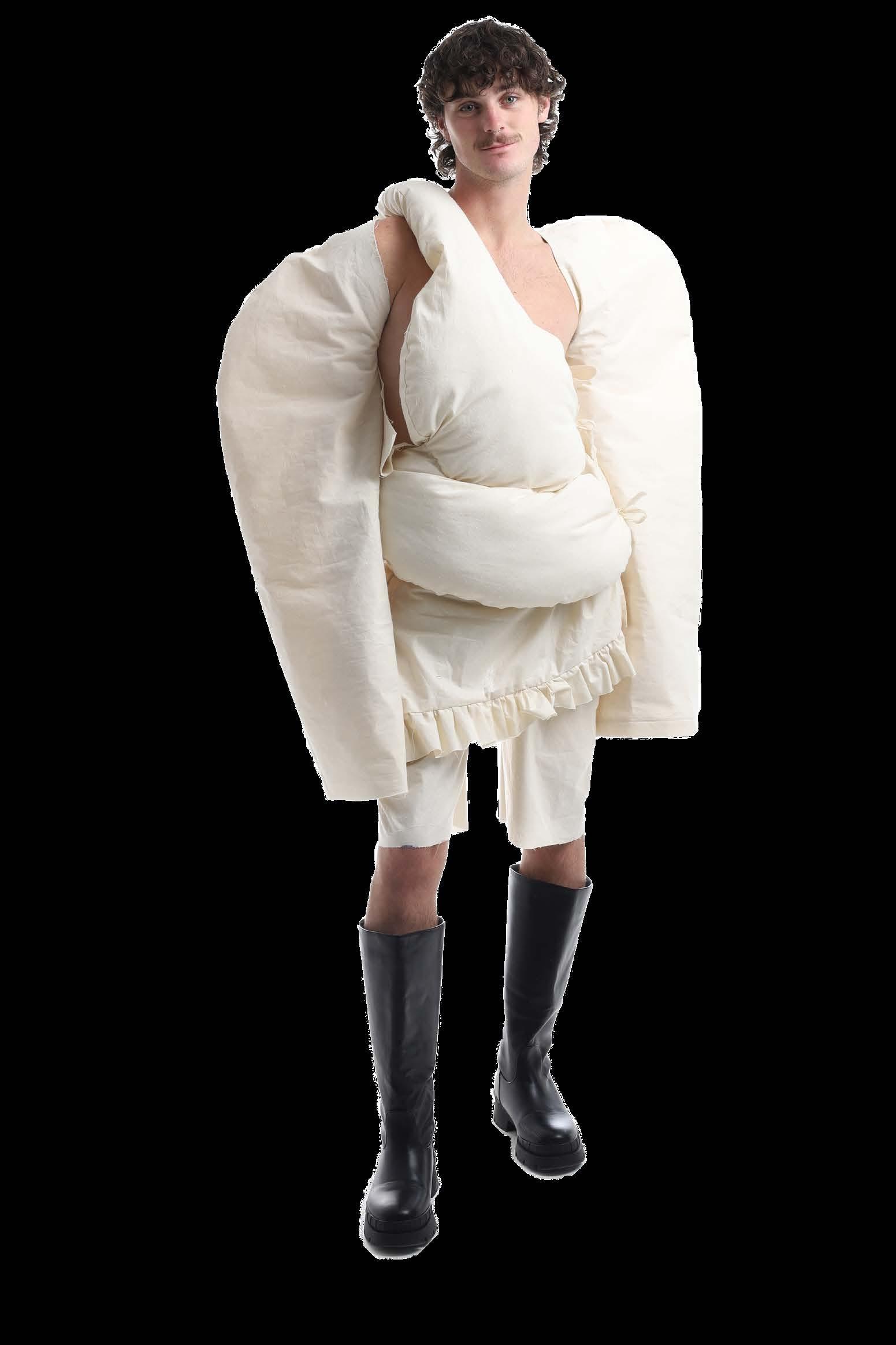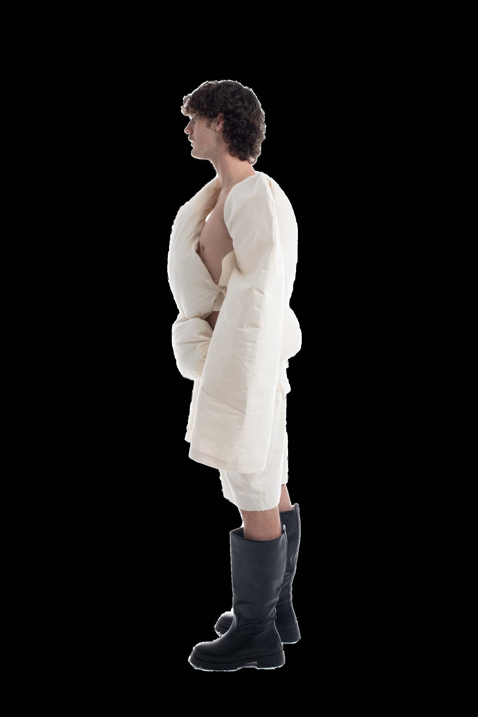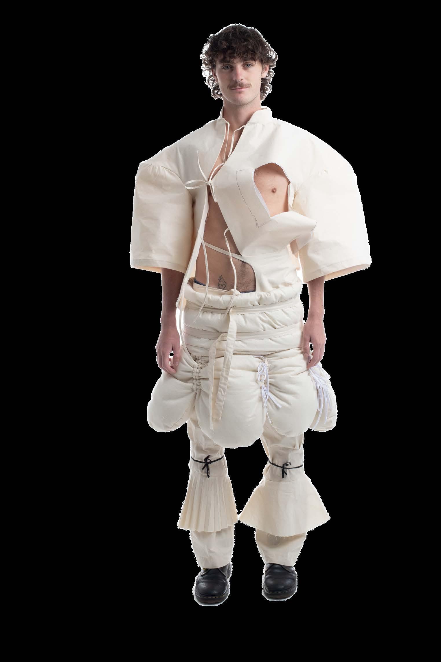In order to achieve a diversity in sizing, the garments will be all over oversized and adjustable. This means the fastenings being used are adjustable strings and straps opposed to buttons and zips which are rigid. This allows for garments to have lots of ease on different body types however can still be made to fit perfectly. This also improves the longevity of the garment as it can grow with the user, like a body. sequently acquires a new charm. In a utopian world, all skin is celebrated and imperfections of the body are embraced.