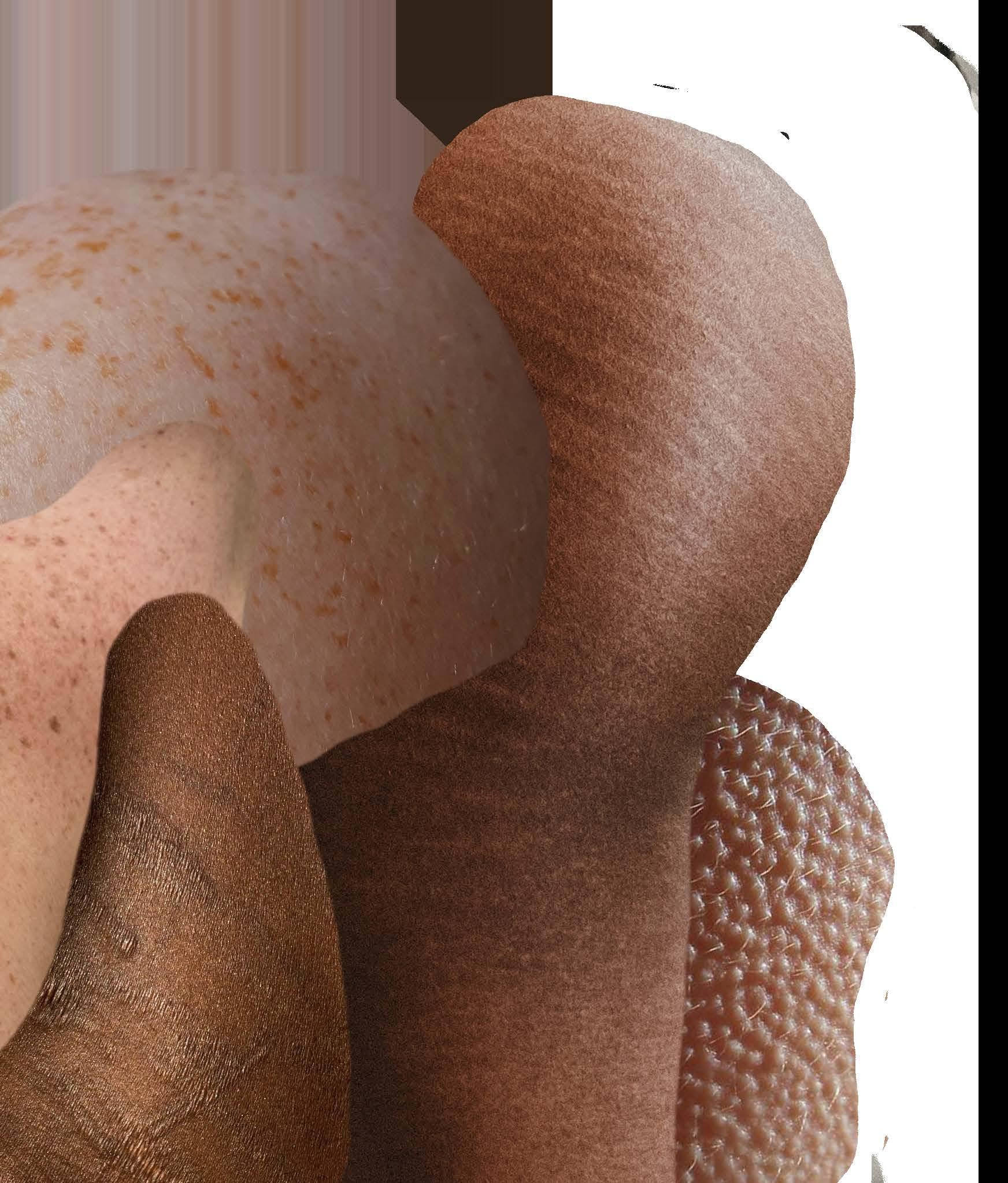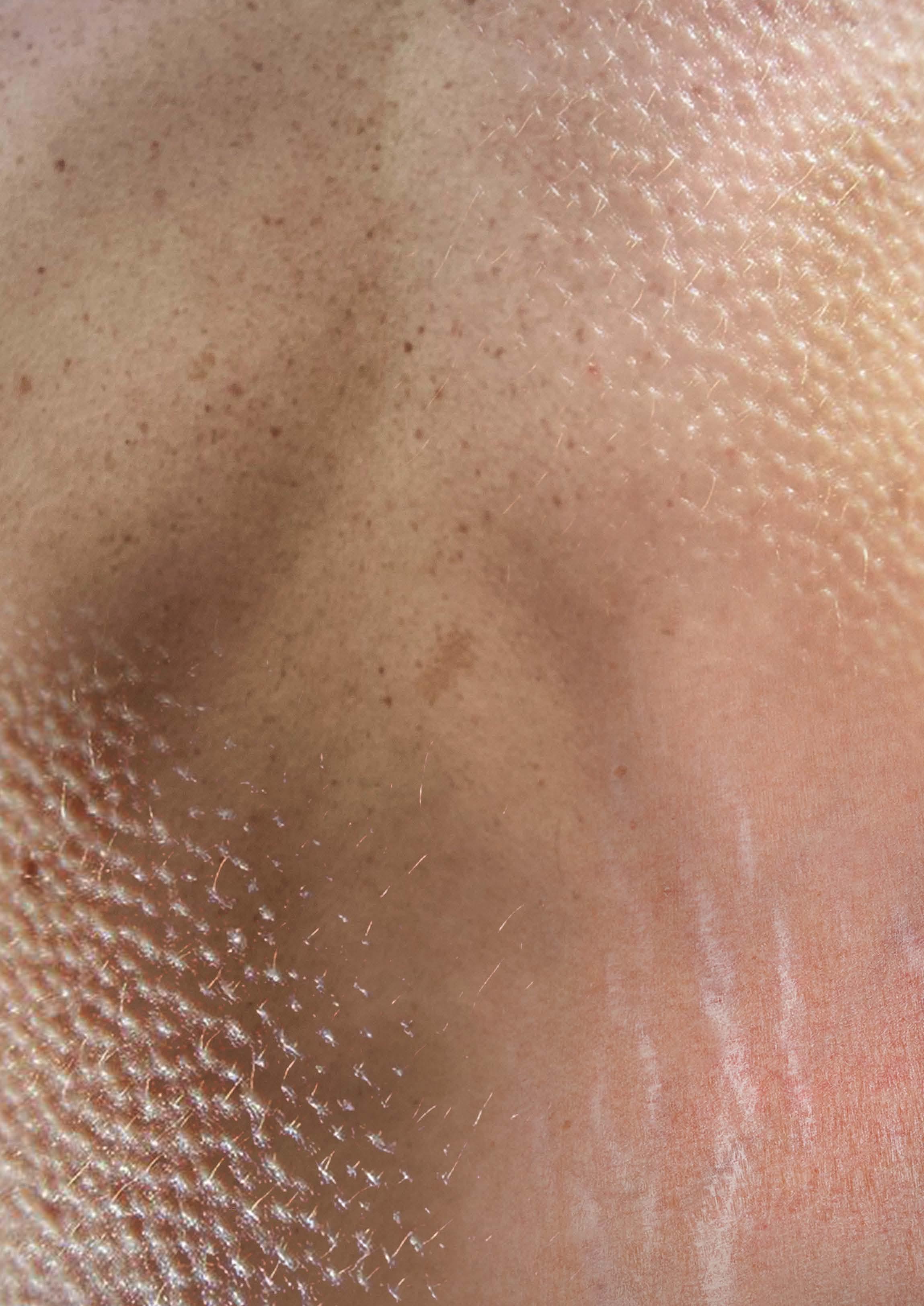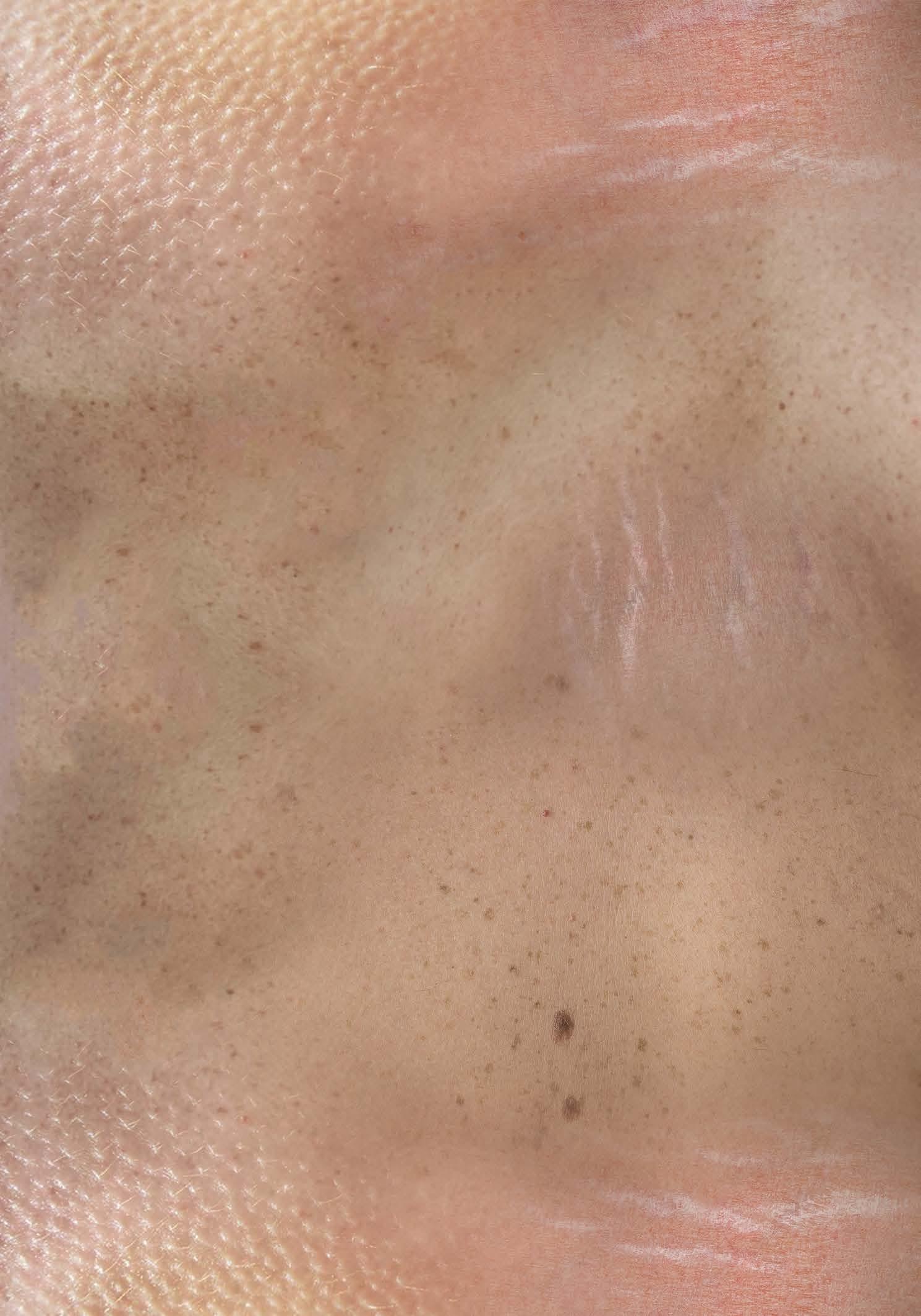 are not normally highlighted in beauty standards or deemed socially appearling such as skin rolls, stretch marks, scars, goosebump textures, pores and skin tags. These prints also bring out hues and undertones of skin such as the pinks and golden browns.