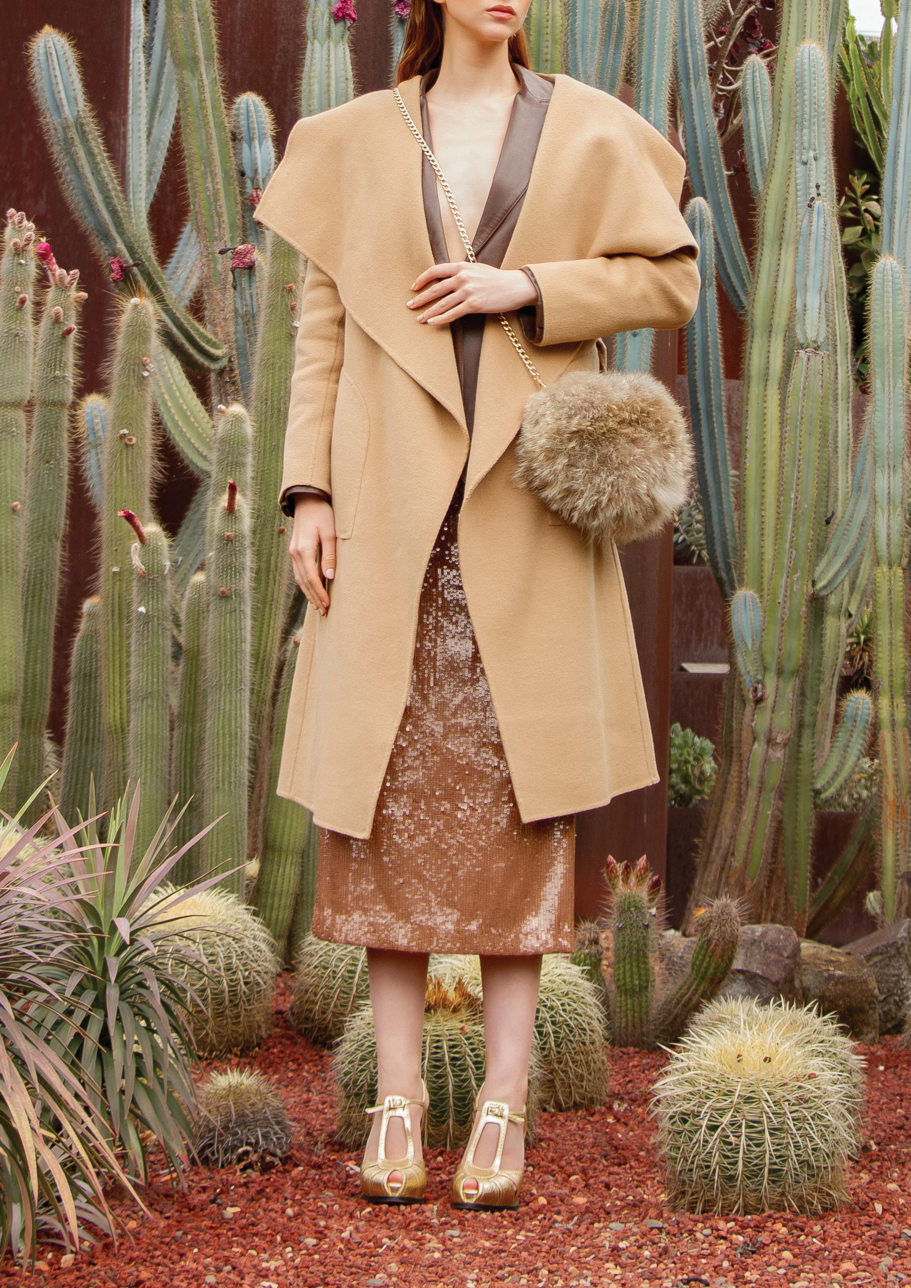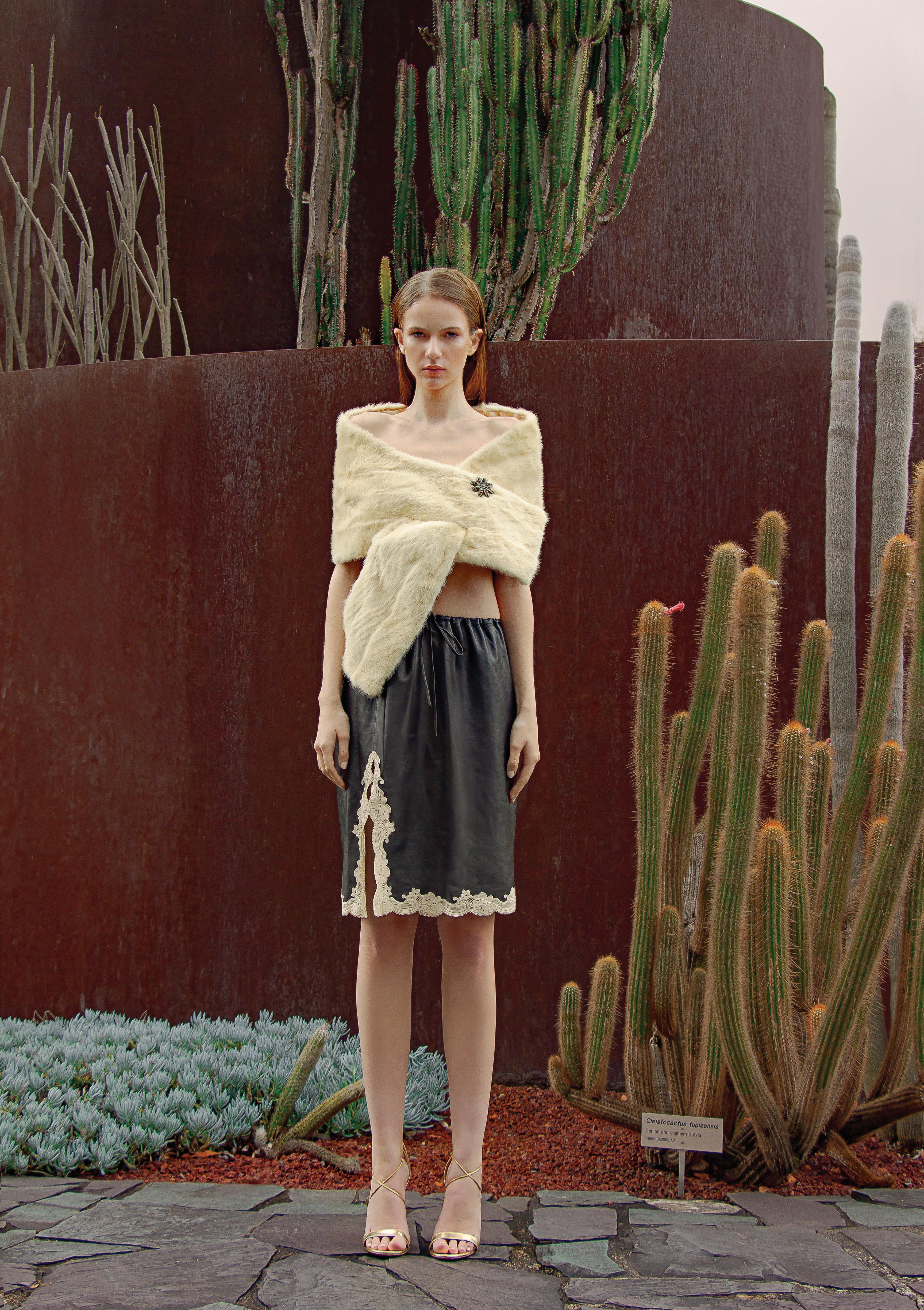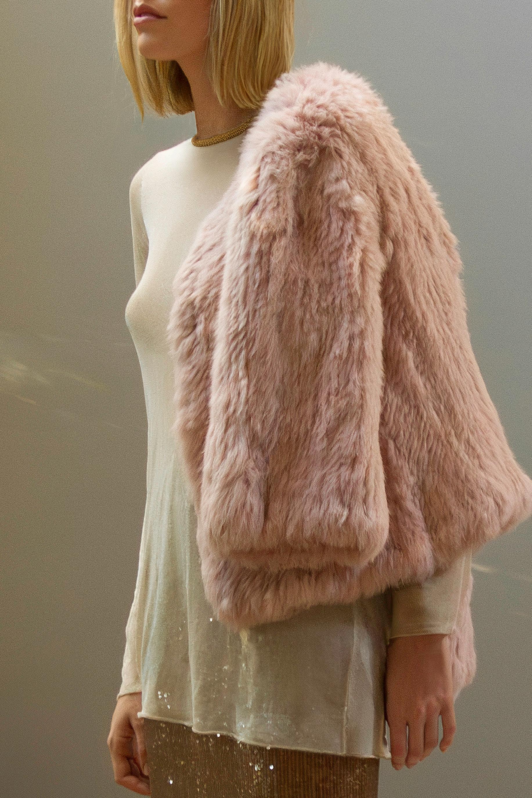 Above: Unreal Fur Saint Tropz Long-Sleeve Jacket. Opposite: Frey Sculptural Table.