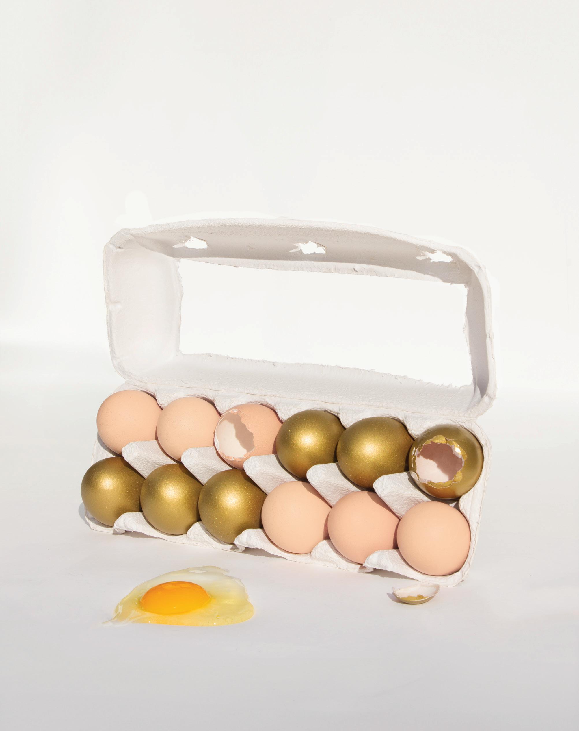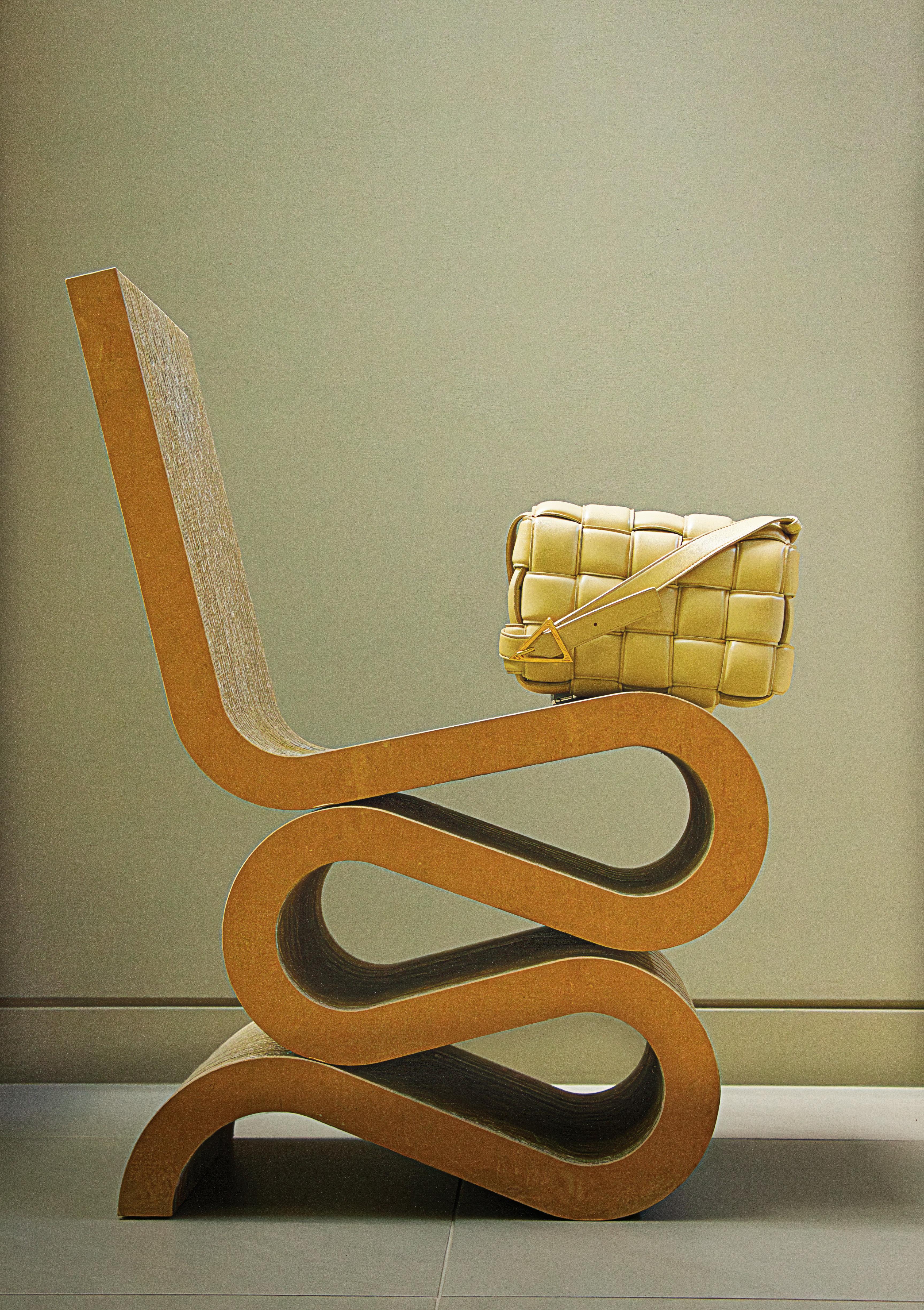 Opposite: Vitra Wiggle Side Chair and Bottega Veneta’s Padded Cassette Shoulder Bag.