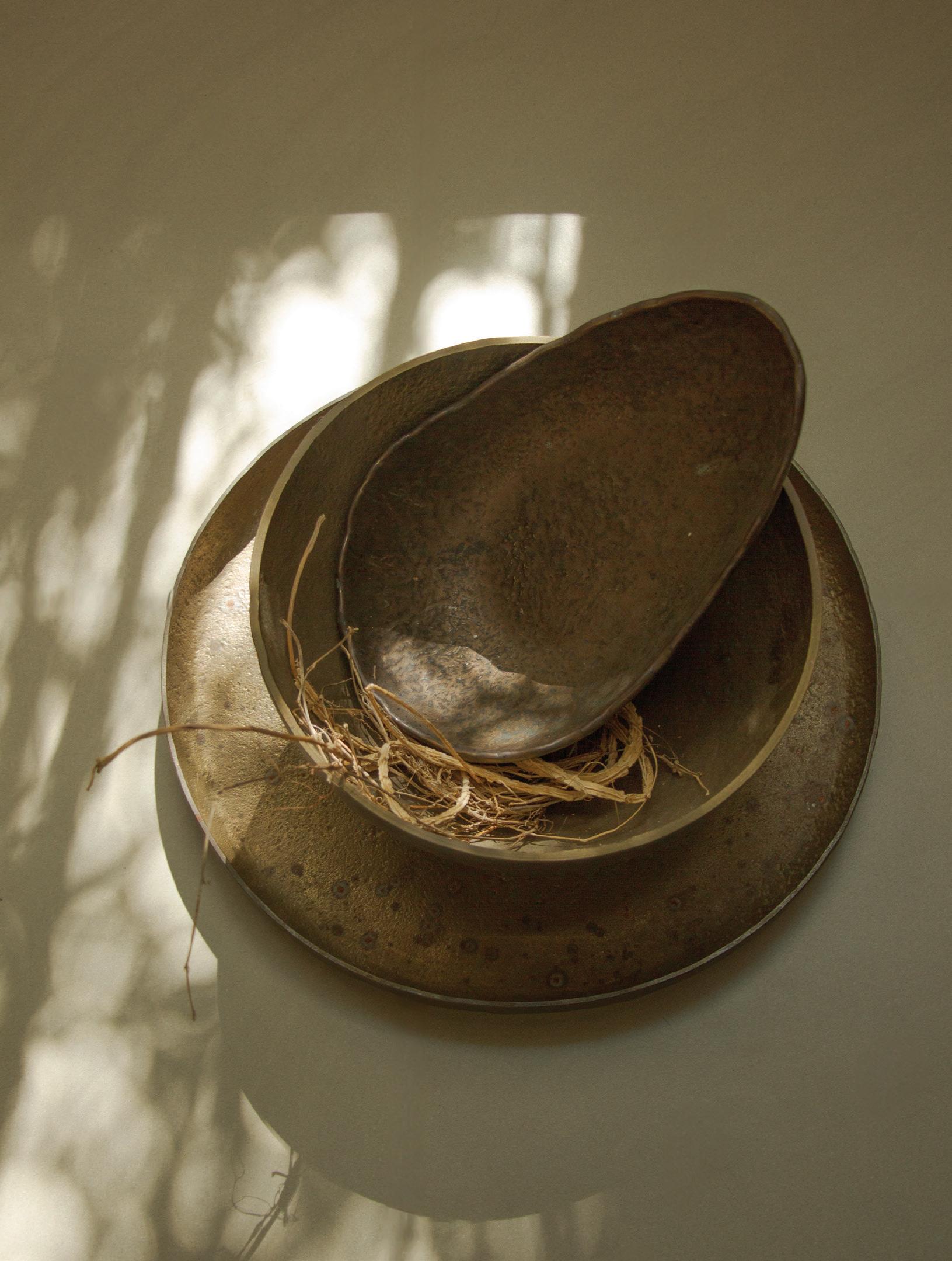Above: Handmade Brass Vessels. Opposite: Yves Saint Laurent Claude Crystal Sandals.
