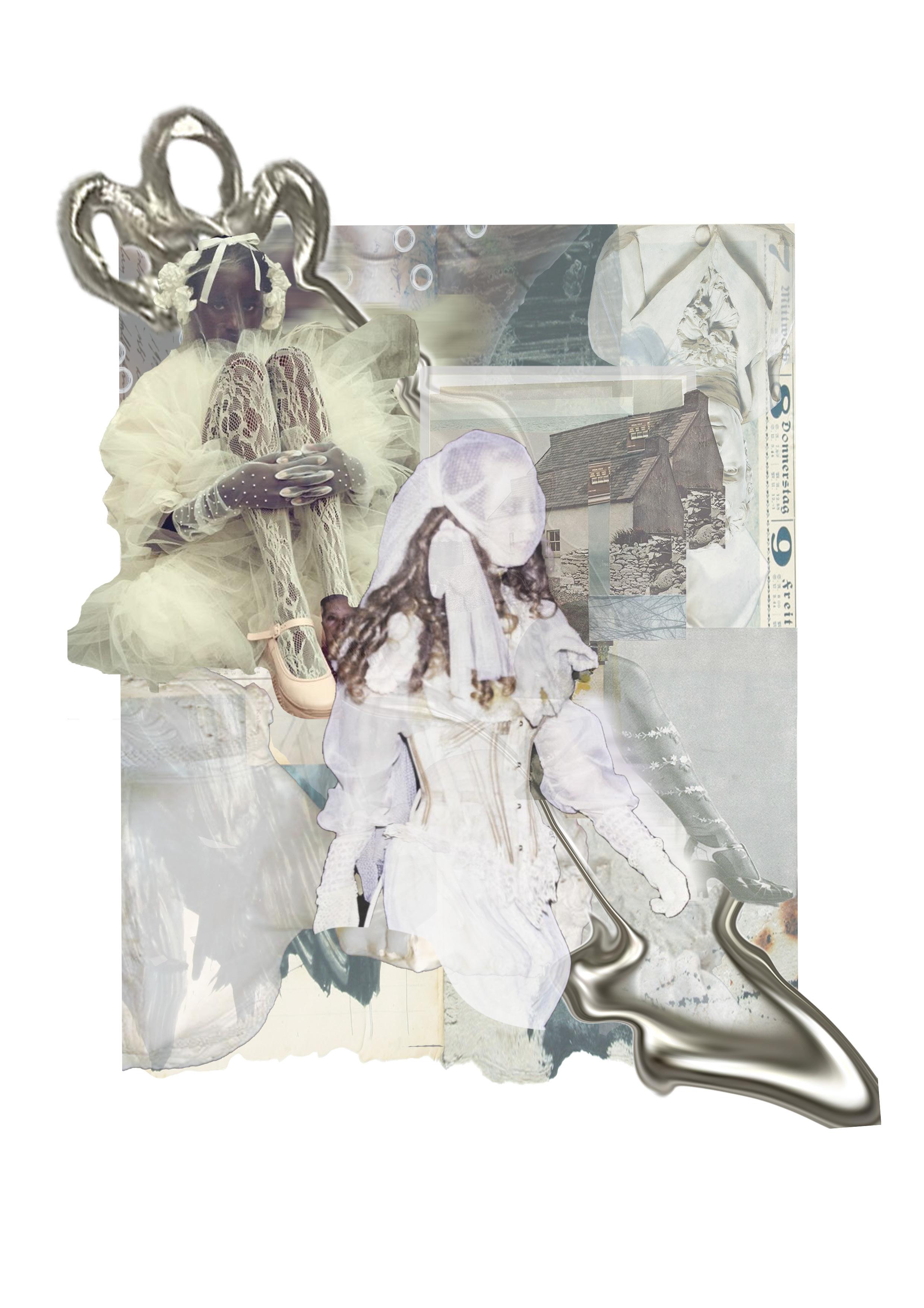 Each look includes a modernised version of hook and eyes, in which piece is hand made from recycled metals. Majority of the lace is also ‘up-cycled’ from old wedding dresses.In doing so, ultimately contribut ing to a slow and ethical design process, where old garments pave the way for new ones, further promoting a sustainable future in design. This colection features colours in order to restrain from over-powering the de tailed design and aspects of the garments. This collection also features juxtaposing fabrications, for example each body inlcludes a thick drill , contrasted with the soft and deli cate lace. As well as a beautiful and detailed pleated cotton that falls delicately onto the curves of the body. Each body also utilises a poly-mesh in some way to create flexibility and comfort for each garment. All differing fabrica tions that come together to create a unified body.
