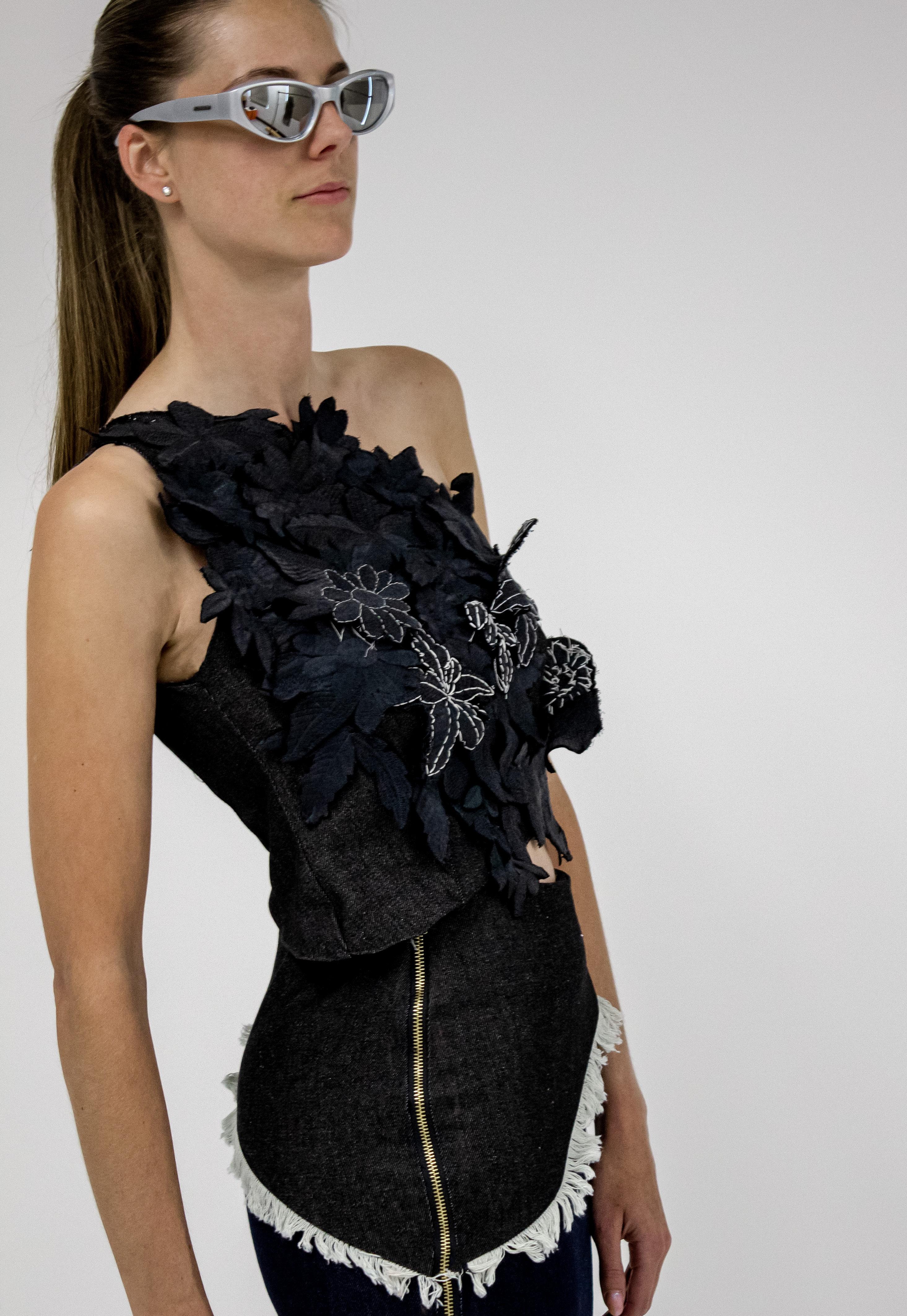 For me, the true essence of this look lies in its metaphors. The embroidered flowers are tender symbols of closeness, but the pleating and distressing tell a deeper story: the warped fabric mirrors the way life distresses us, leaving marks that never quite smooth out. These traces are not flaws, but reminders that wear—whether in fabric or in life—shapes us into something more intricate, more layered, and ultimately stronger. I am drawn to textiles because they hold these stories so visibly; every fold, fray, and stitch becomes a testament to intimacy, resilience, and the beauty of being touched by time.