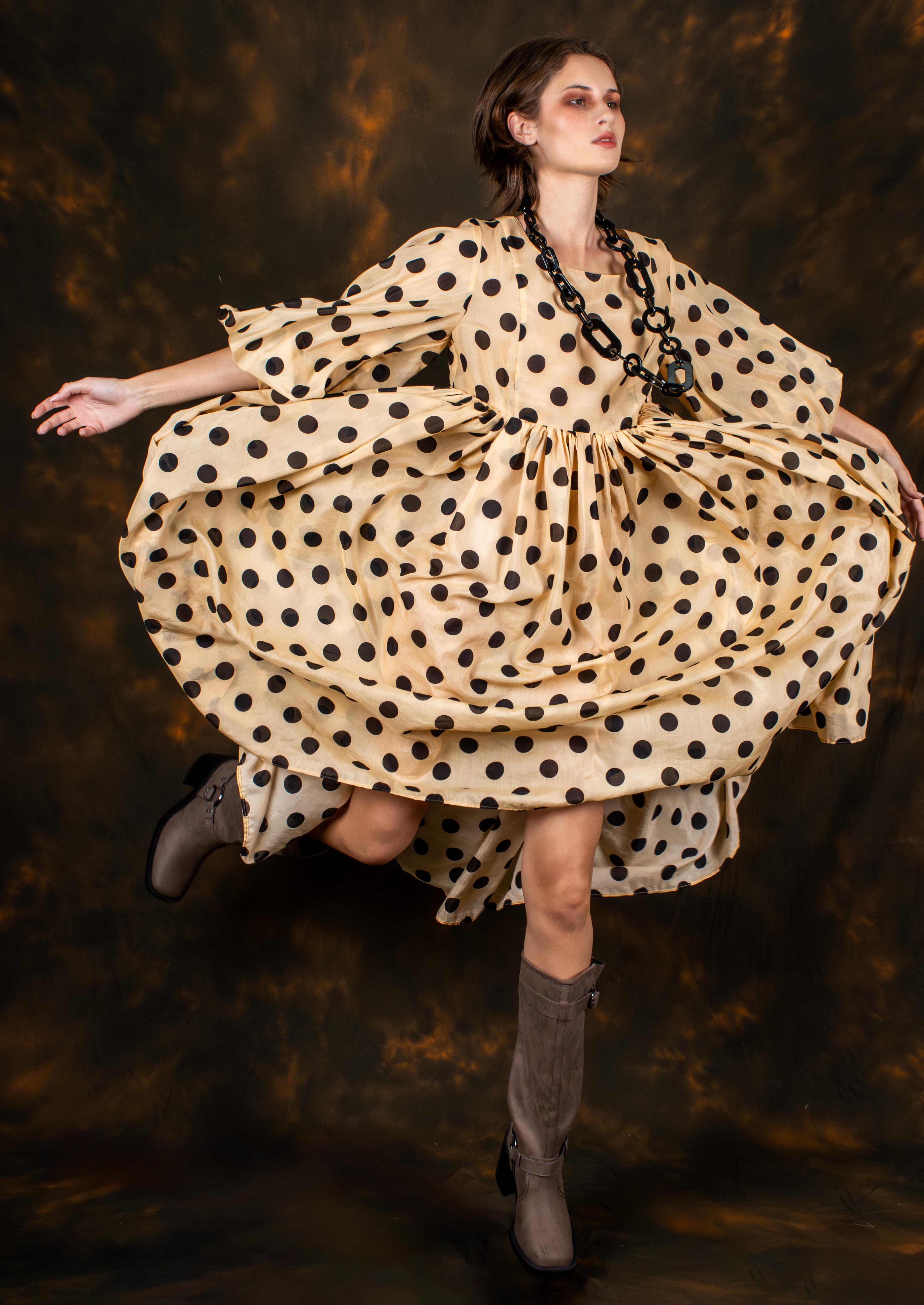 LOOK 6. SURPLUS SILK AND NYLON POLKA DOT EMPIRE LINE DRESS WITH BILLOW SLEEVES AND SKIRT.