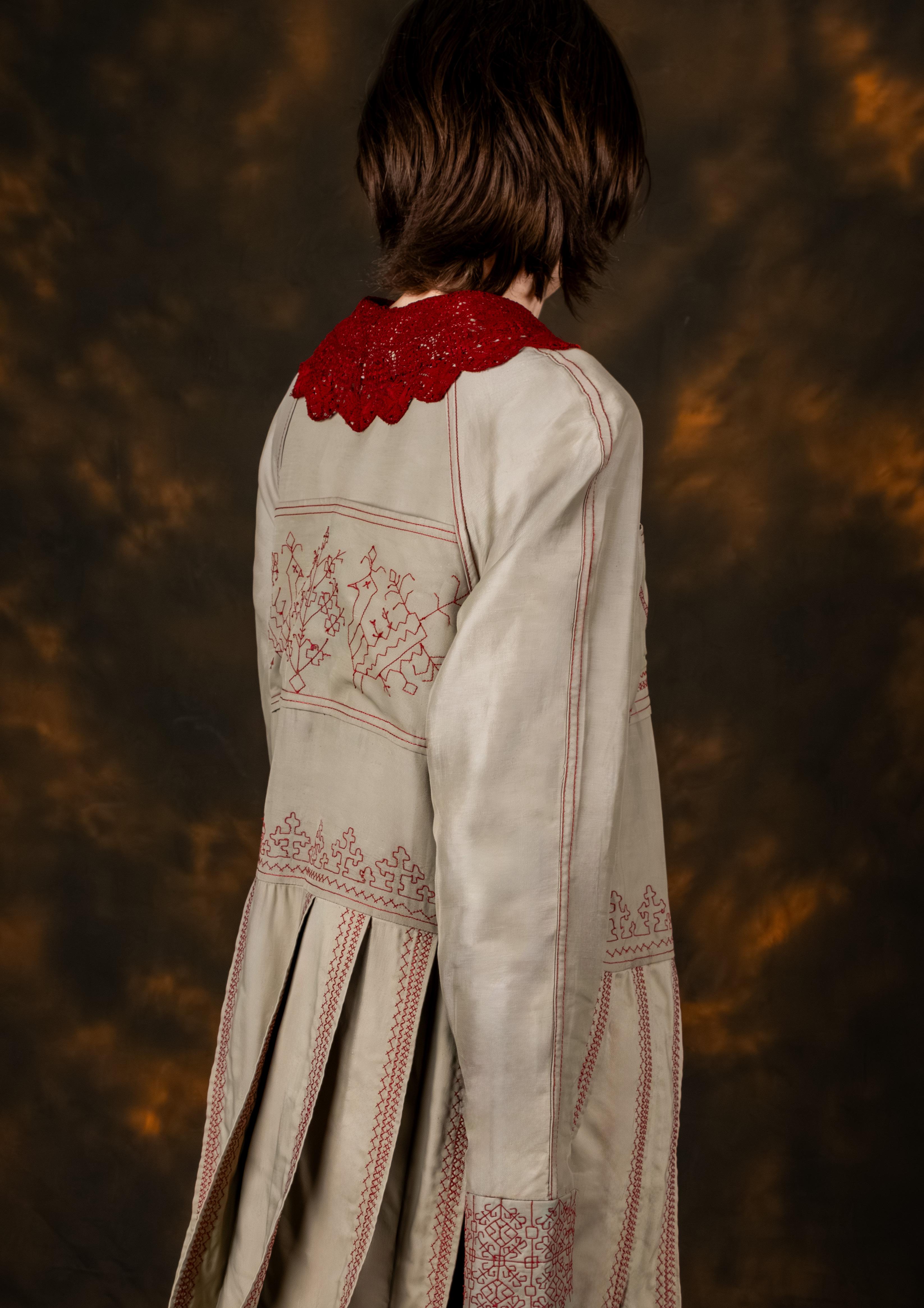 LOOK 4. SCARLETT EMBROIDERED COTTON GABERDINE TRENCH DRESS WITH MALTESE LACE COLLAR.