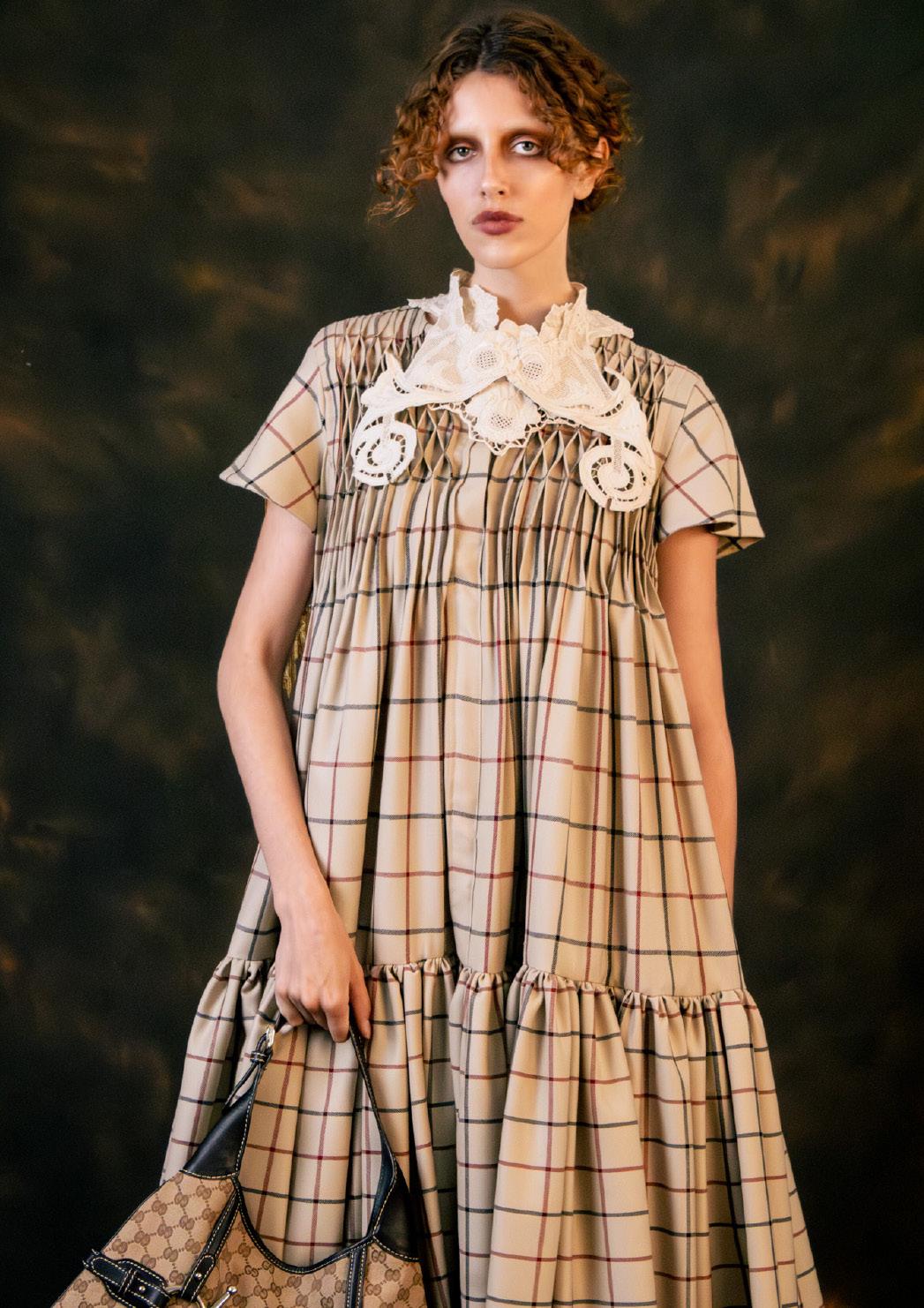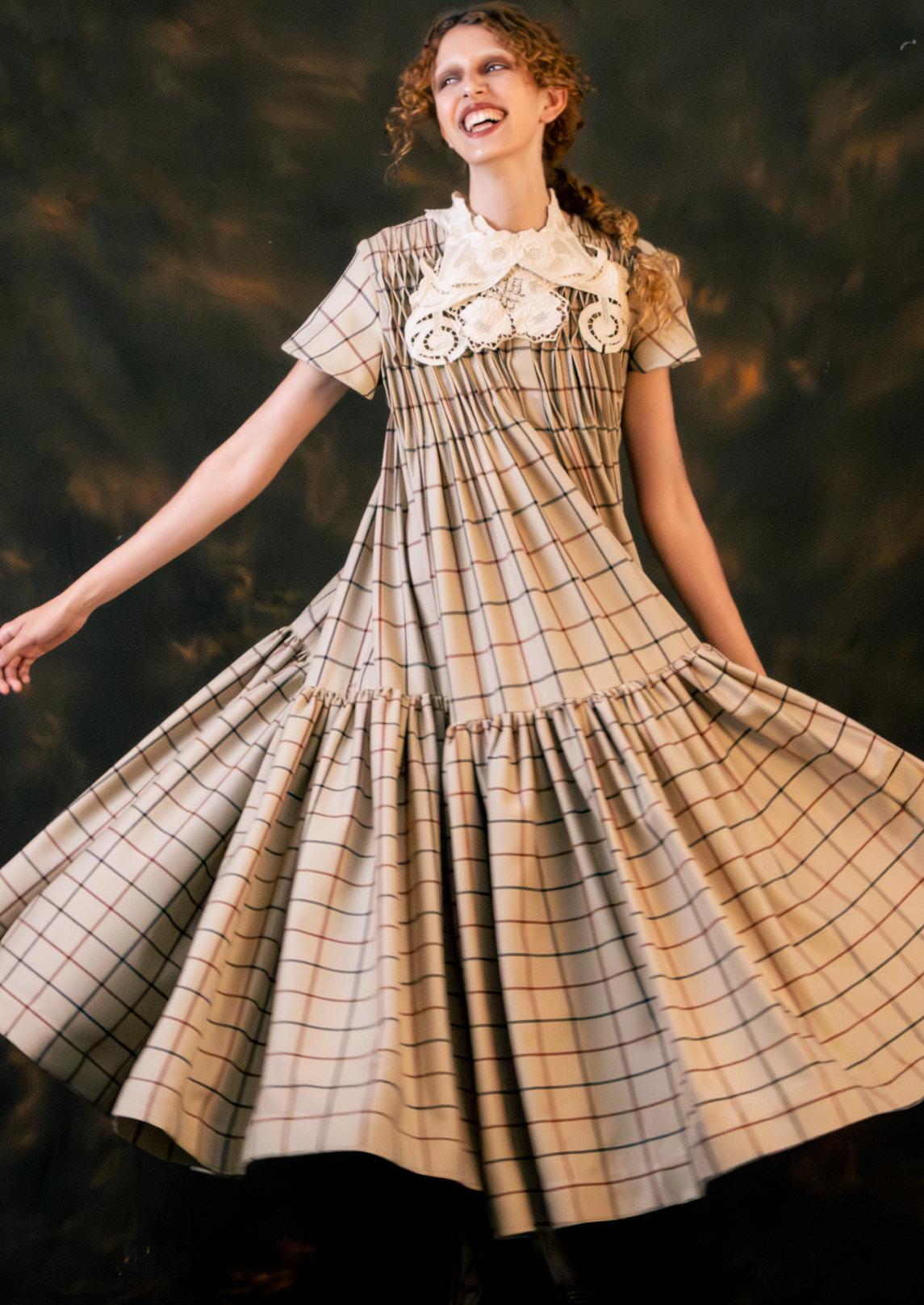LOOK 3. SHEPARD CHECK SMOCKED WOOLLINEN BLEND JACKET WITH LACE DETAILING. LACE AND SMOCKED COTTON SHIRT DRESS. WOOL PINSTRIPE TROUSERS.