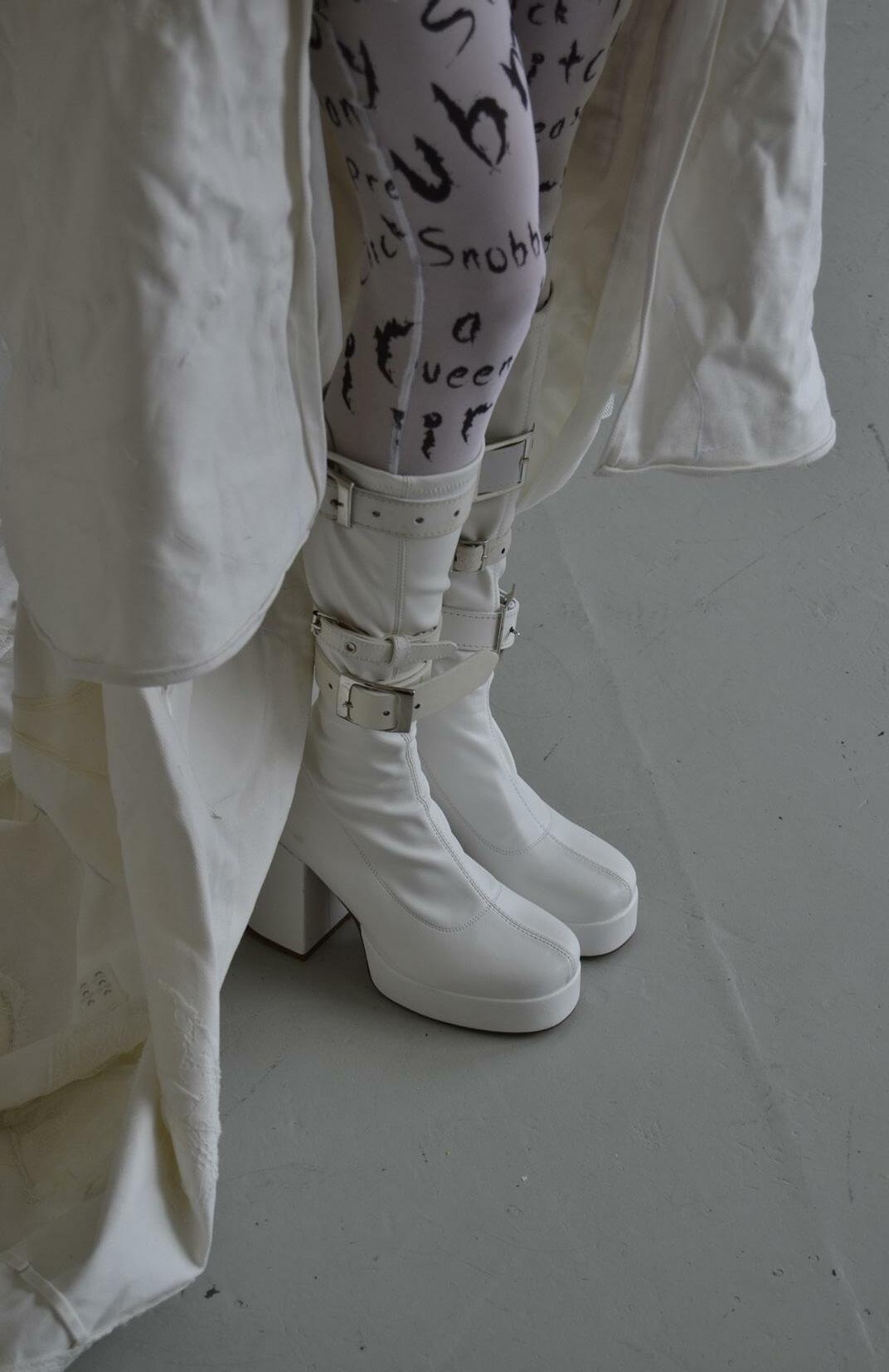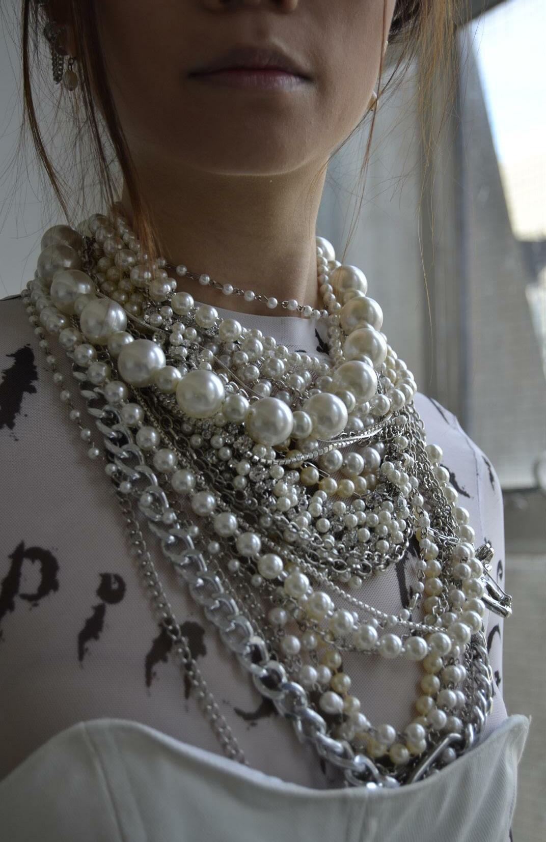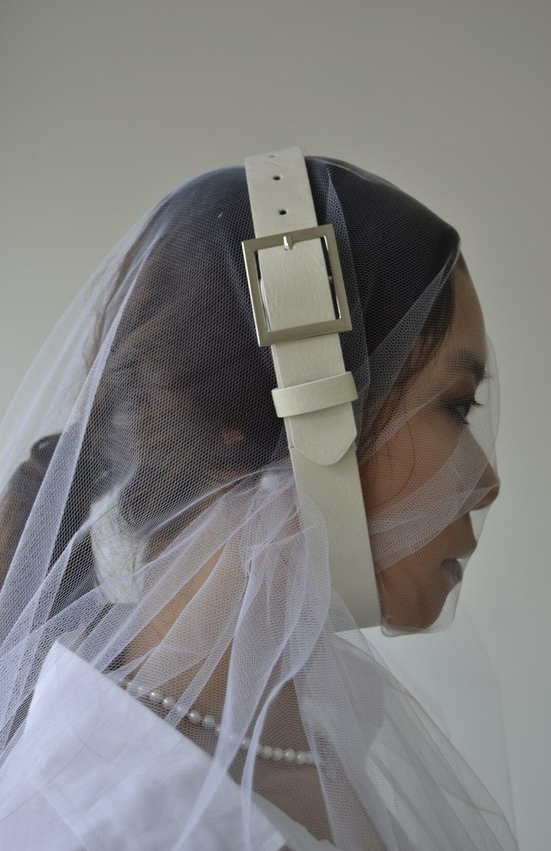 women hear every day. The content and typography of the print aim to emphasise the ugly oppression that women face daily in a patriarchal society. Additionally, thrifted bras were recycled to create an original texture for this collection. During Second Wave Feminism, bras be came a tangible symbol of the abstract nature of female oppression as they were seen as a physical restriction of the female body for the male gaze. To create the original texture for this collection, donated white lace bras were literally deconstructed in order to figuratively dismantle feminine oppression. Denim was featured heavily in this collection due to its strong ties to the punk aesthetic but also for its stark contrast to traditional bridal fabrics such as lace, tulle and satin which are often soft and flowy compared to the thick rigidness that denim provides. Other popular punk characteristics were also adopt ed including chains, belts and lace ups to highlight the constraints that women experience in a patriarchal society. The colour palette for this collection was also heavily inspired by its concept. As the tradi tional colour of brides for its connotations of purity and innocence, white features heavily. By creating unconventional punk-inspired wed ding dresses, these connotations are contradicted thus highlighting the duplicity of feminine gender construction. Black, the antithesis of white, was also used as in the context of feminine wedding wear, it further highlights the opposing nature of feminine stereotypes.