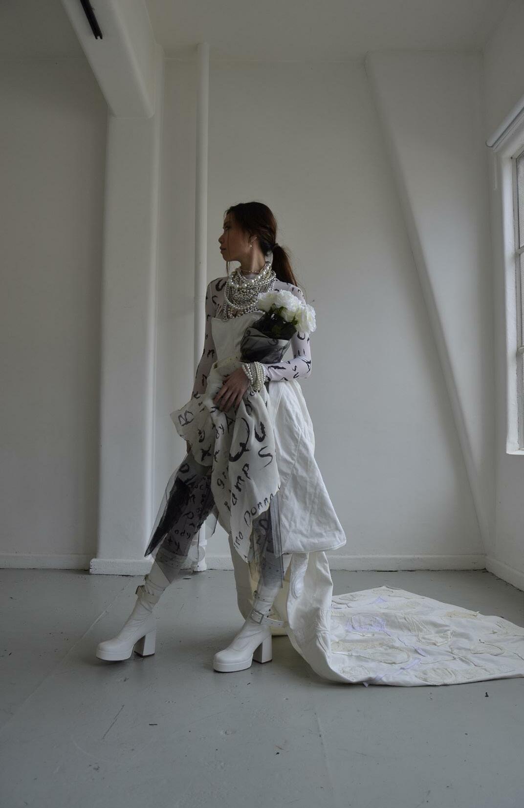 This collection aims to use punk aesthetics to expose society’s treat ment of women through the archetype of a wedding dress. By repur posing lingerie items that have had contradicting meanings of purity and immorality throughout history such as white lace bras, corsets and body-hugging silhouettes, the hypocrisy of gender expectations and double standards is exposed. The traditional wedding dress silhouette has been deconstructed in each body to highlight how society’s ex pectations of women are limiting. An original font has been designed for this collection which utilizes traditional chaotic punk typography aesthetics. This font has been used to create the original print for this collection which utilises common misogynistic words and phrases that
