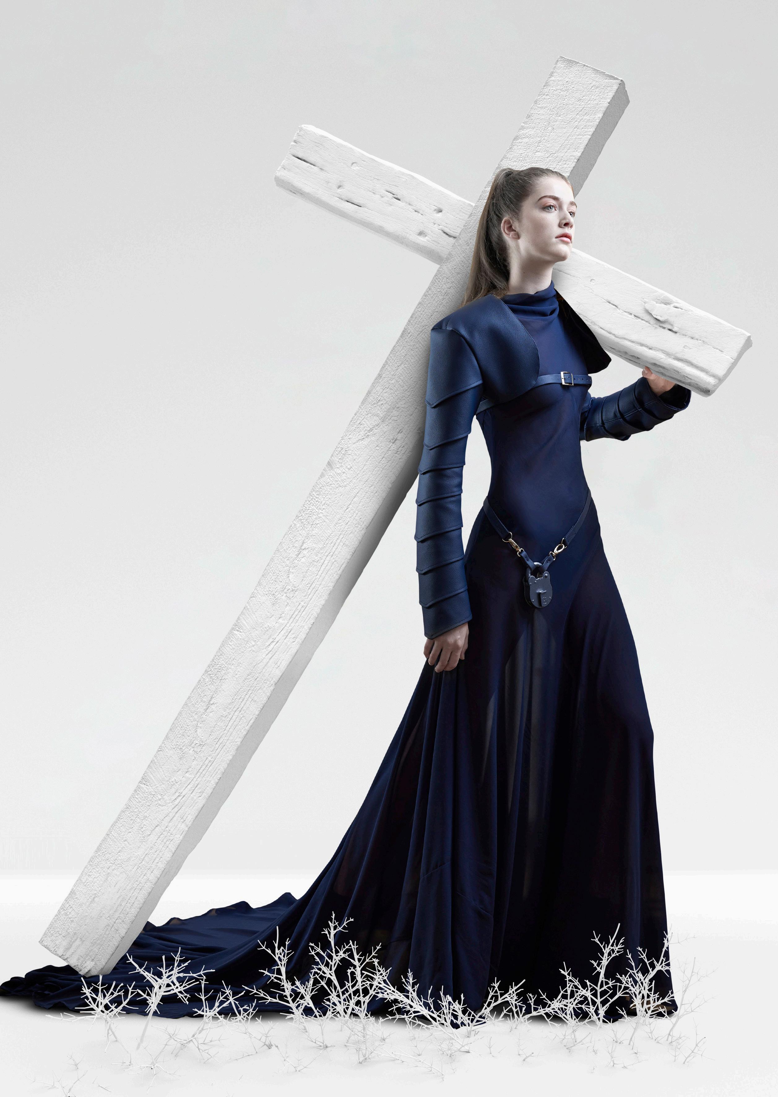 The outfit for pride has hardware elements of silver chains hanging from the dark blue corset. The dramatic hip structure was developed with wire in the corset and a cage underneath to give stability and strength. A chiffon bodice and scarf have also been used to give a romantic appeal to the outfit, inspired by mother Mary’s scarf.