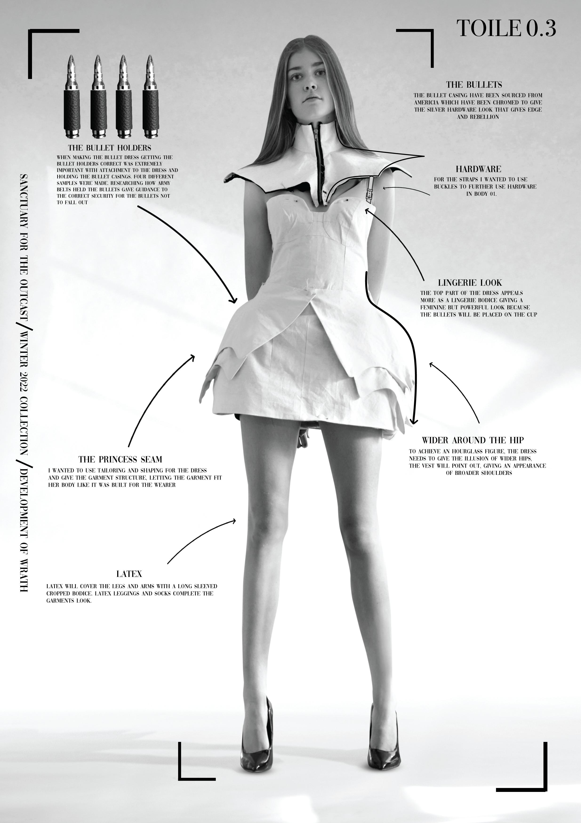 While creating this collection, I was inspired by Alexander McQueen’s fall 1998 collection titled Joan. I was intrigued by the colour palette and the designs insinuating towards violence and bloodshed, references to the medieval time, which was also an inspiration for my collection, and the design process. Silver was used consistently throughout Alexander McQueen’s collection, which was an inspiration behind the first garment I designed, the bullet dress, which soon spread to the rest of the garments, having one type of hardware used for each body.