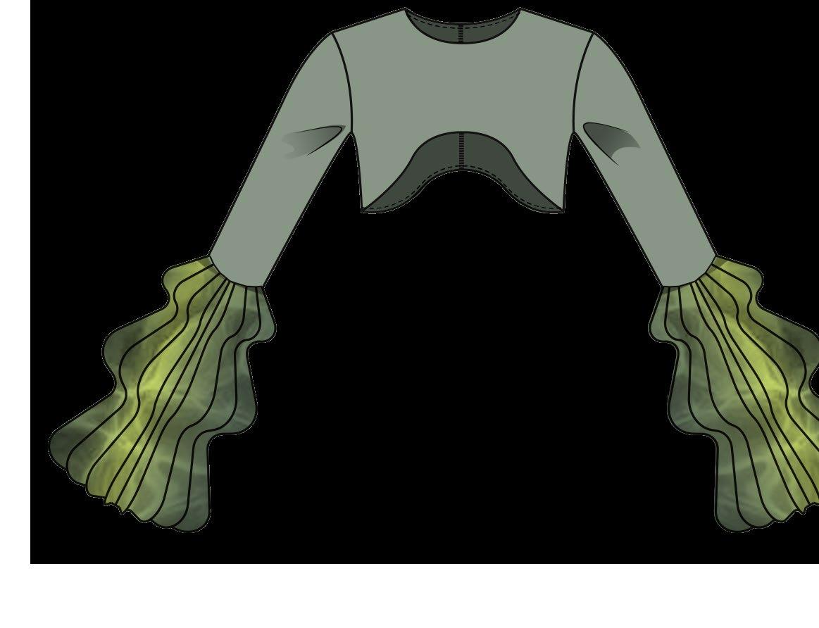 The LICHEN look features an A-line mini dress with vertically layered organza detailing. Organza shapes were cut on bias and sewn layer by layer to each sleeve and hem of the garment. As a result, a mesmerising texture shifts between gold and green as it moves in motion with the body, reminiscent of textures similar to mushroom veins or feathers of an exotic bird. The asymmetrical hem of the dress supports the illusion of movement and a 3D shape wrapped around the body.