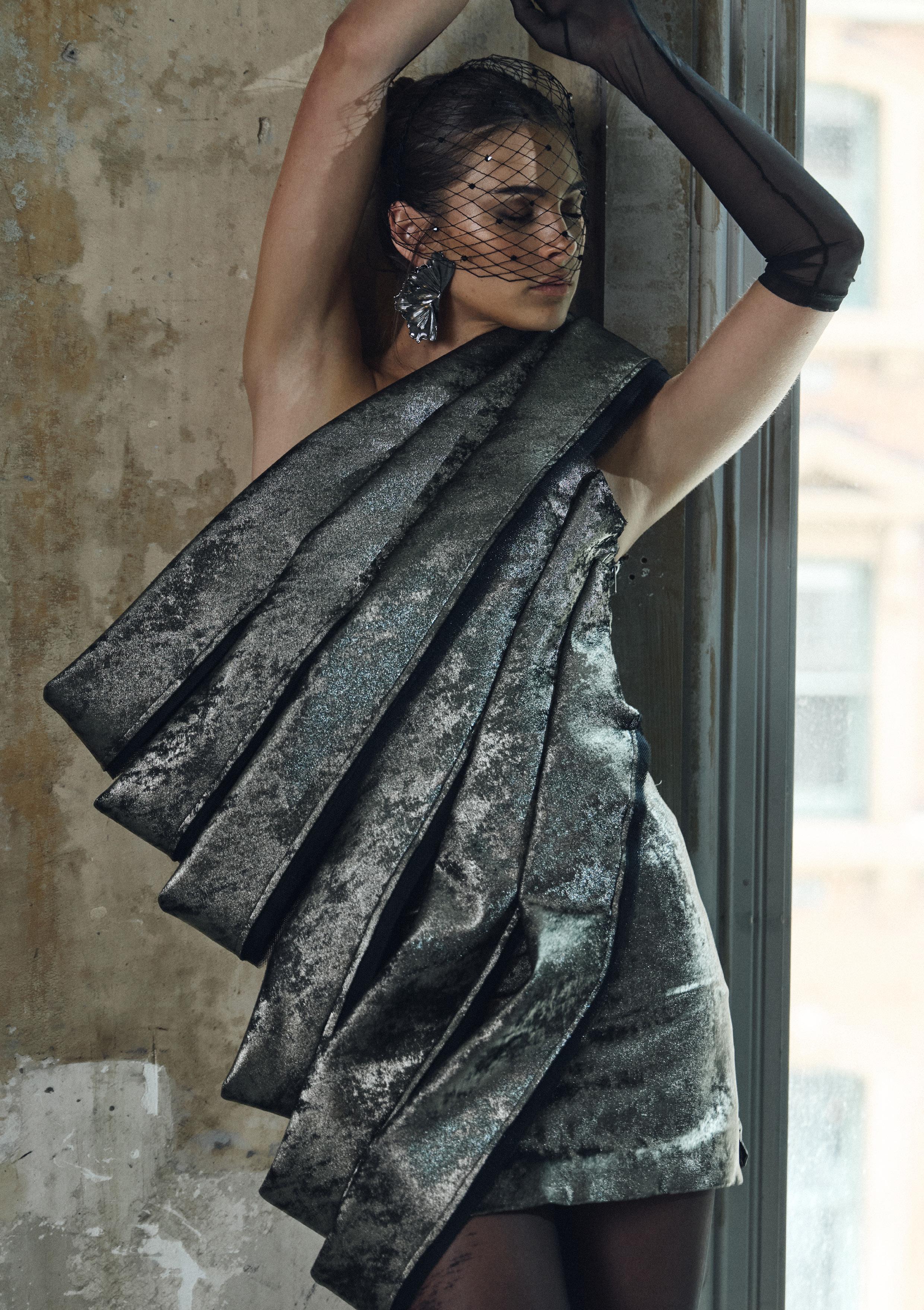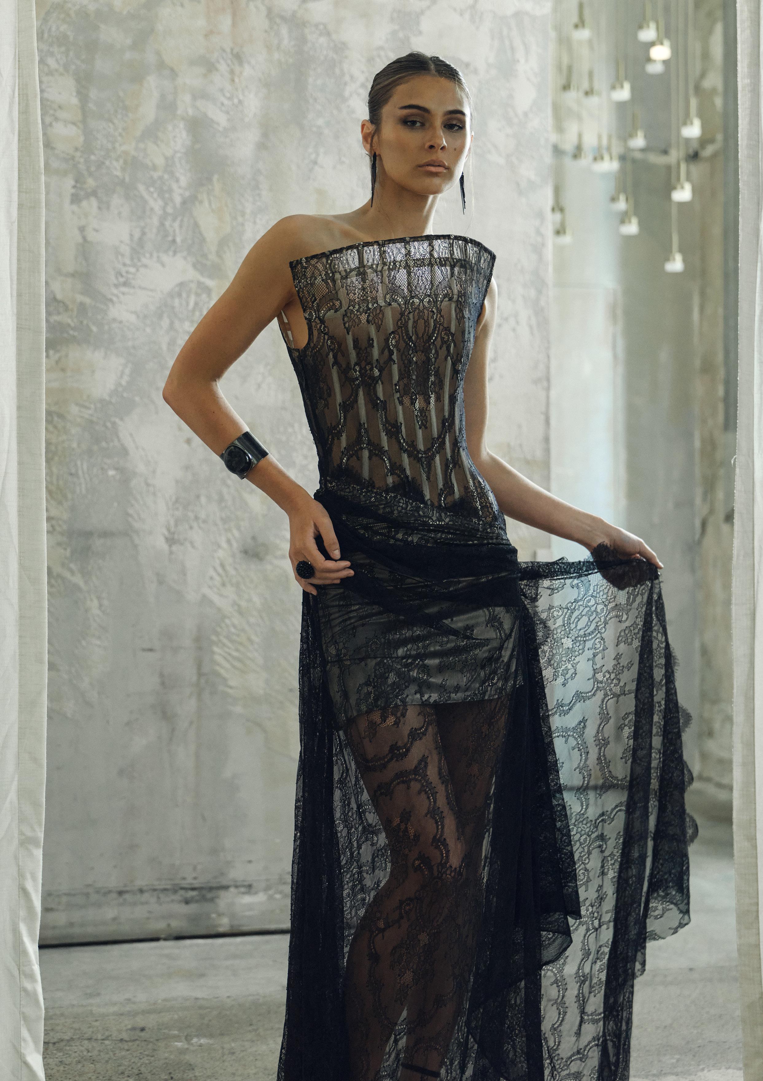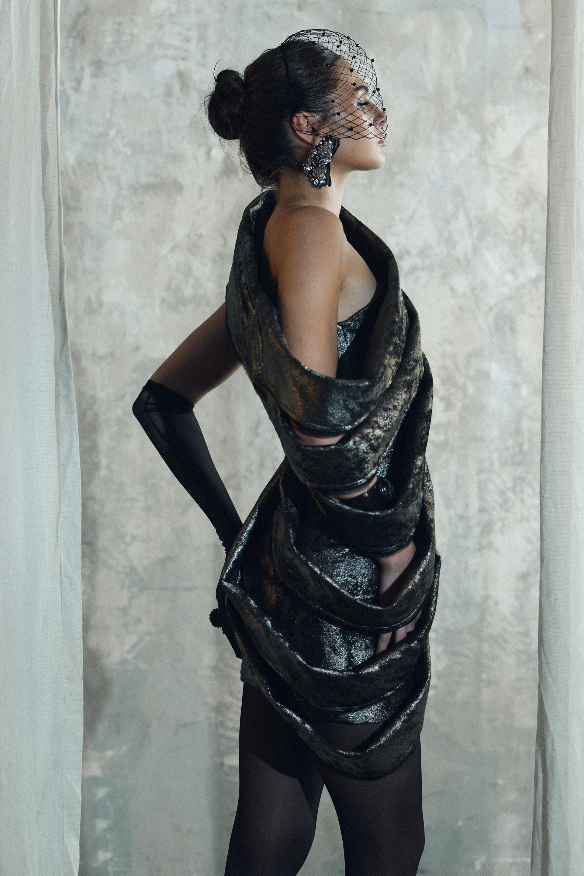 Designed for women who embody luxury, sophistication, and high fashion, the collection combines crushed metallic velvet, delicate lace, sheer veiling, and luminous textures to create depth, movement, and atmospheric richness. Each piece is crafted with precision to evoke confidence, allure, and emotional presence, elevating eveningwear into a refined expression of strength and elegance.