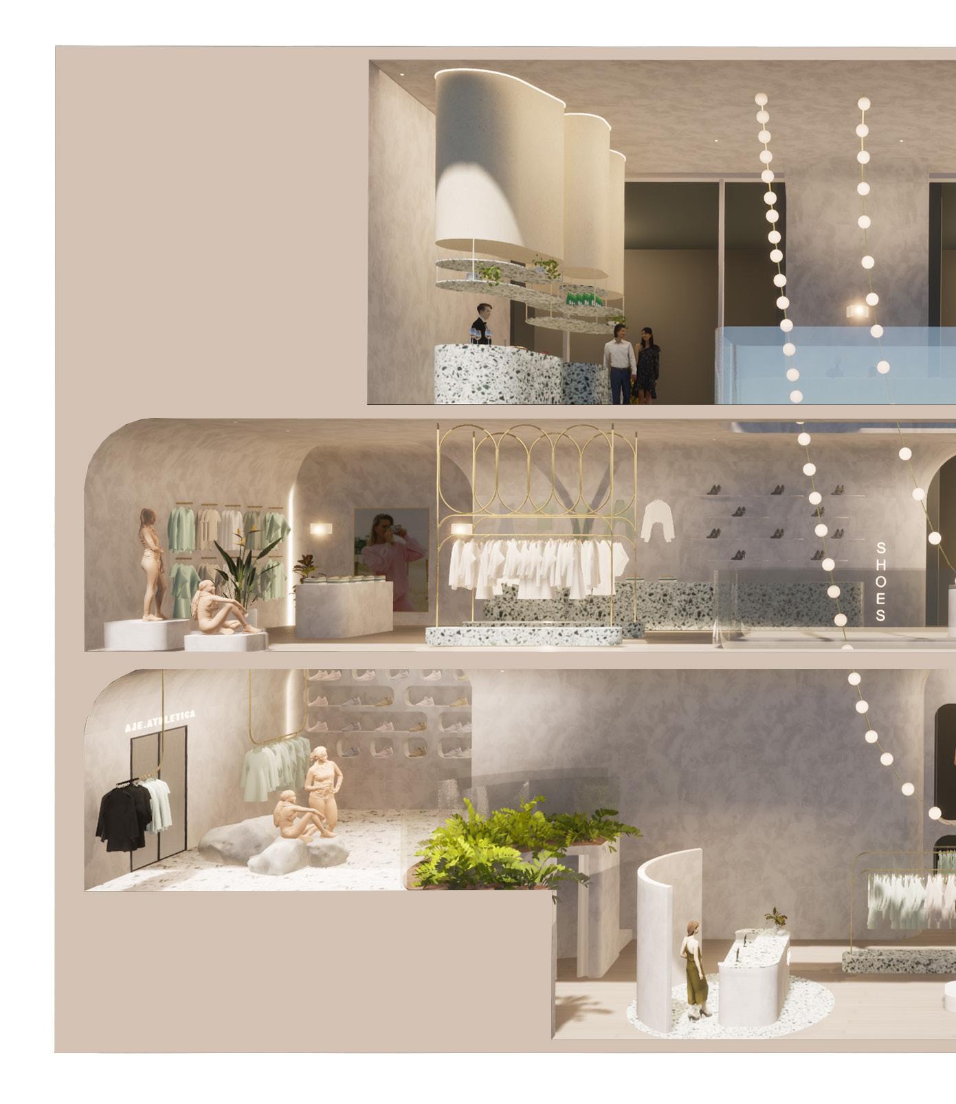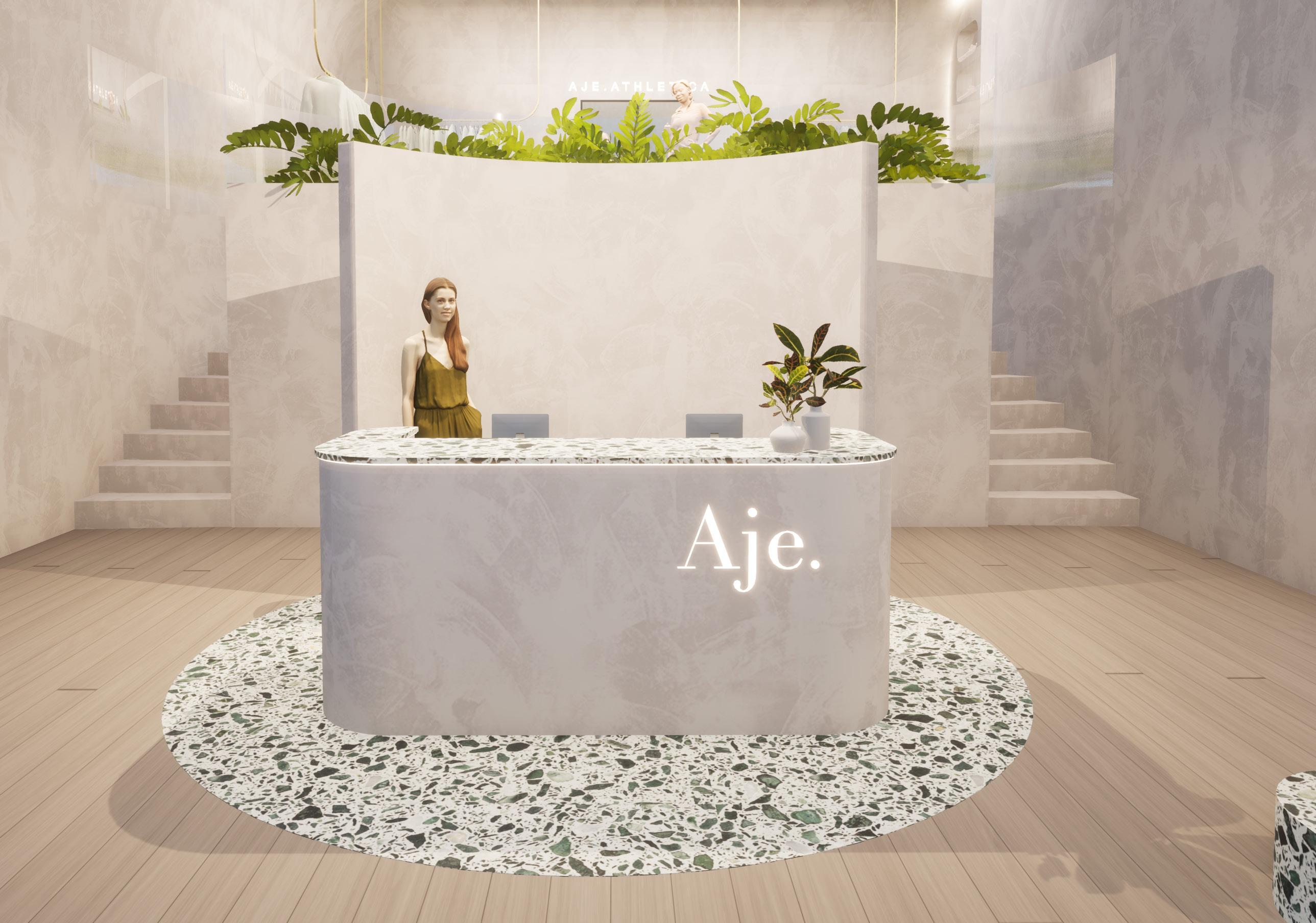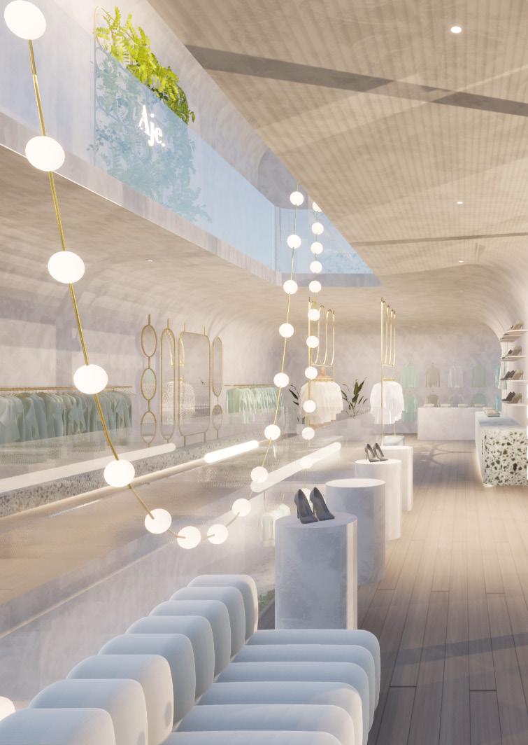 Aje as a brand focuses on an effortlessly chic look and design for their branding and clothing. The brand was created on the east coast of Australia by two young entrepreneurs. Many of the collections have a focus on the mix of the coastal and urban lifestyles of Australia. Through soft whites reflecting sandy beaches, greens, oranges and pinks reflecting the coral reefs and flora that lines the coast of Australia. Blue accents showcasing the clear sunny skies and refreshing ocean water. Curved cave like shapes encompass the floors and walls of the space reflecting the headlands that line Australia’s east coast.