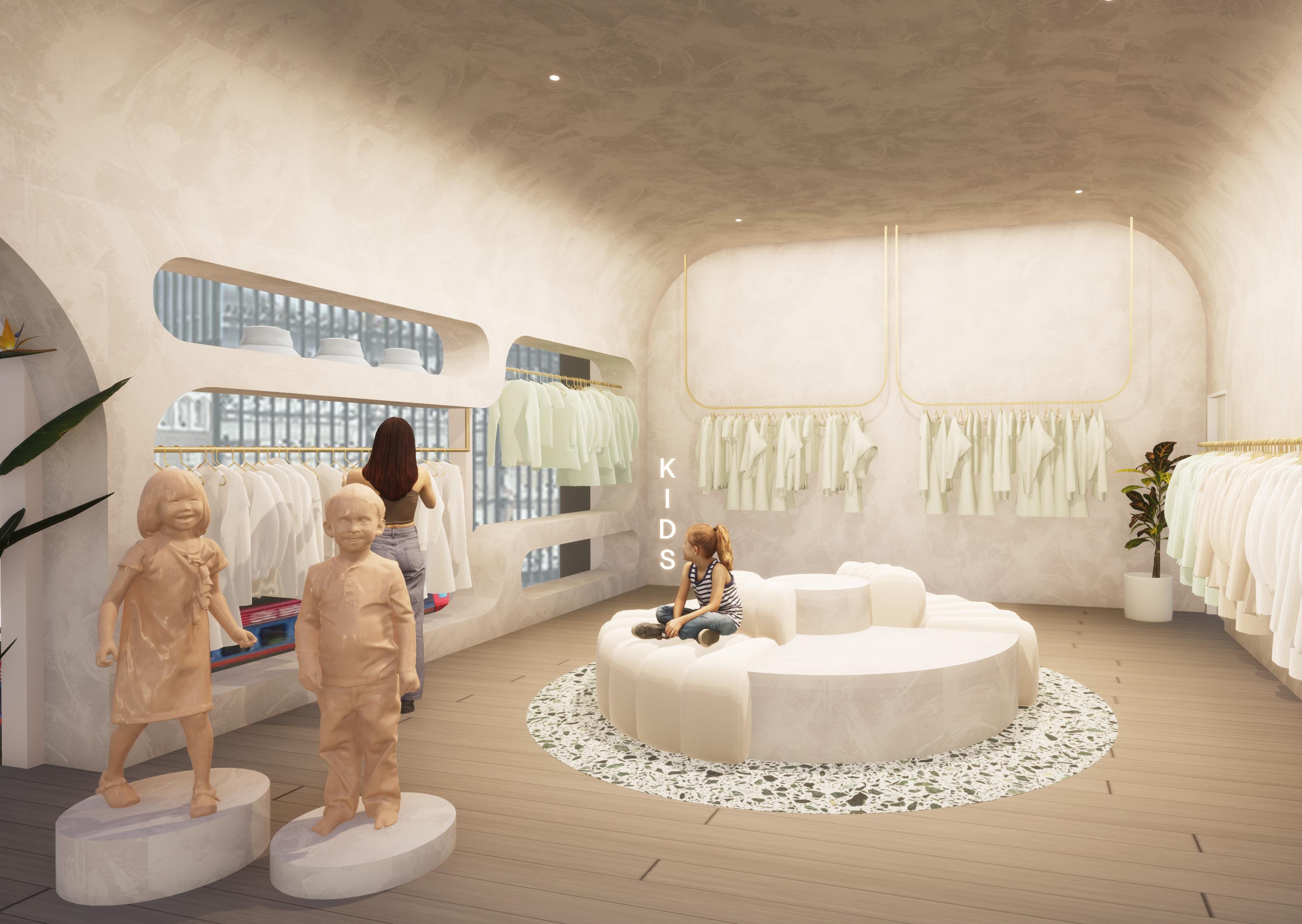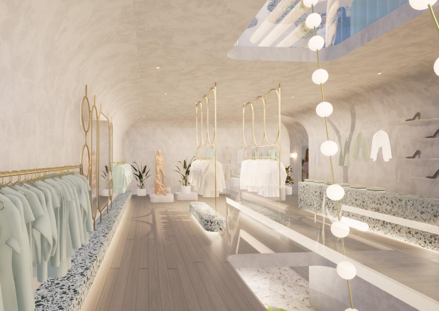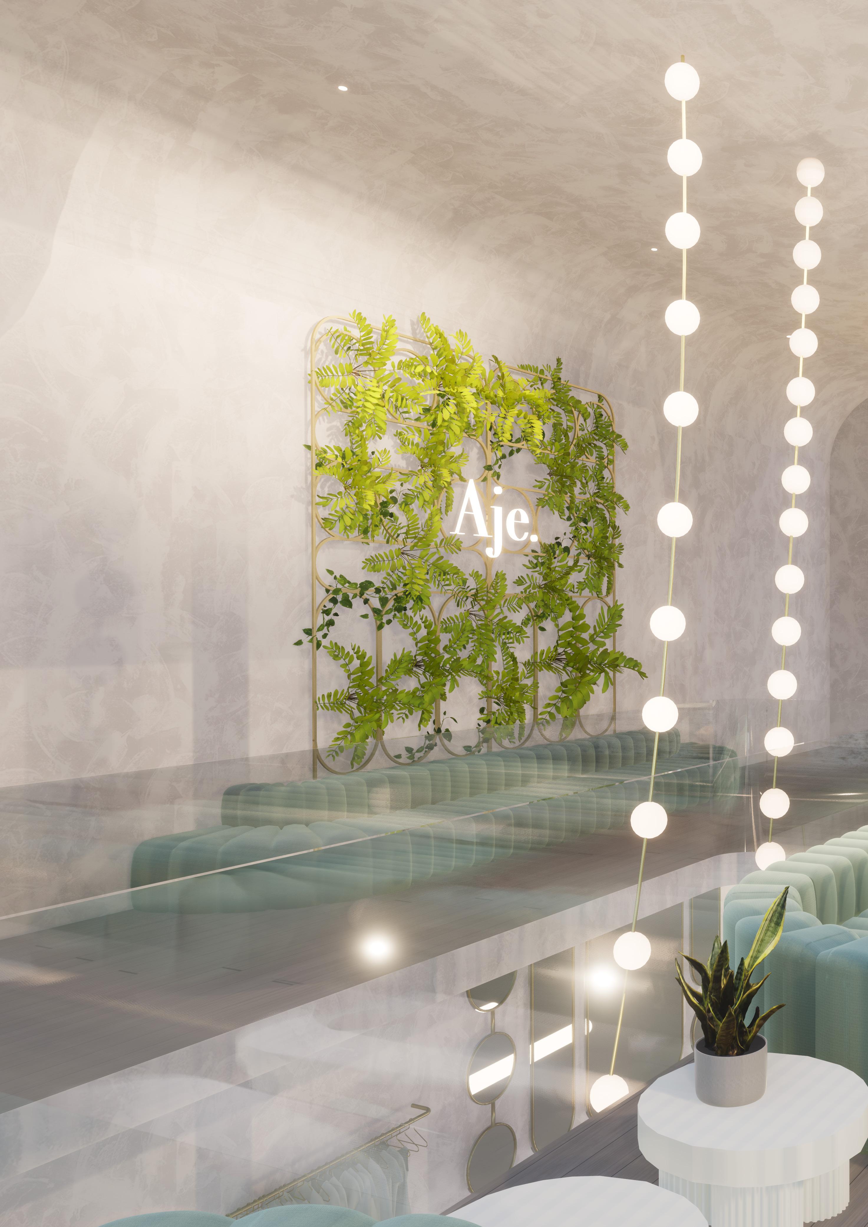 Aje as a brand focuses on an effortlessly chic look and design for their branding and clothing. The brand was created on the east coast of Australia by two young entrepreneurs. Many of the collections have a focus on the mix of the coastal and urban lifestyles of Australia. Through soft whites reflecting sandy beaches, greens, oranges and pinks reflecting the coral reefs and flora that lines the coast of Australia. Blue accents showcasing the clear sunny skies and refreshing ocean water. Curved cave like shapes encompass the floors and walls of the space reflecting the headlands that line Australia’s east coast.