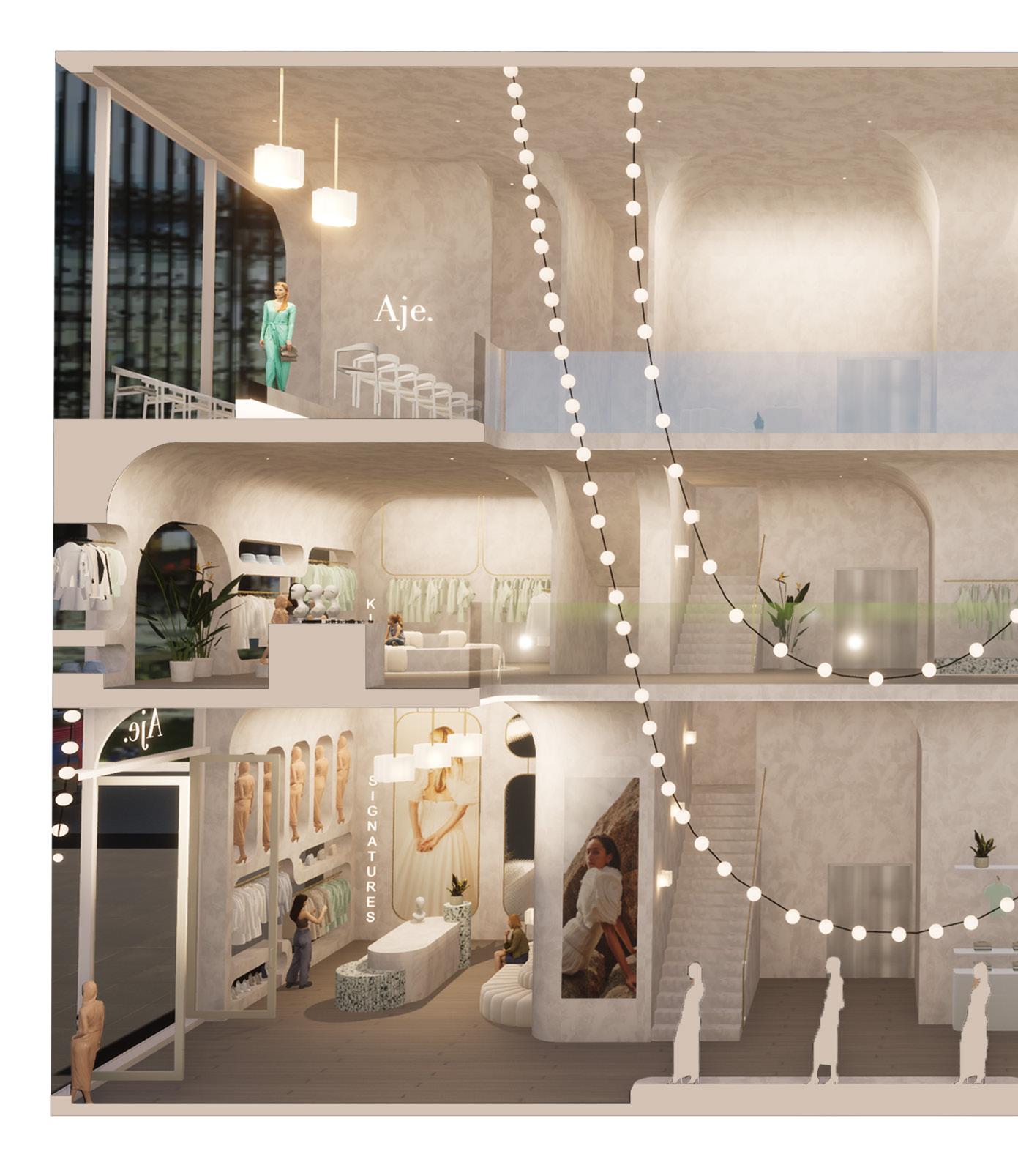 The project brief is to create a flagship, double story retail space for the brand Aje. The project also includes a third level for exclusive access and space to hold events and host VIP clients.