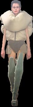 (€200) is made from cactus leather and is adjustable via sliders at the back. It allows the aluminium sleeve (€500) to hang from the side, merging hardness with an excessive amount of formlessness from the soft nature of the dress. This outfit is styled with the white
