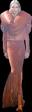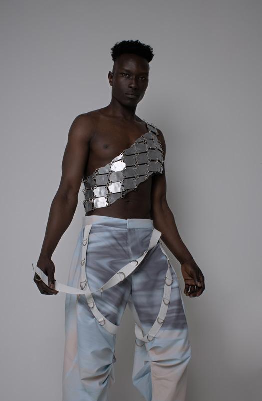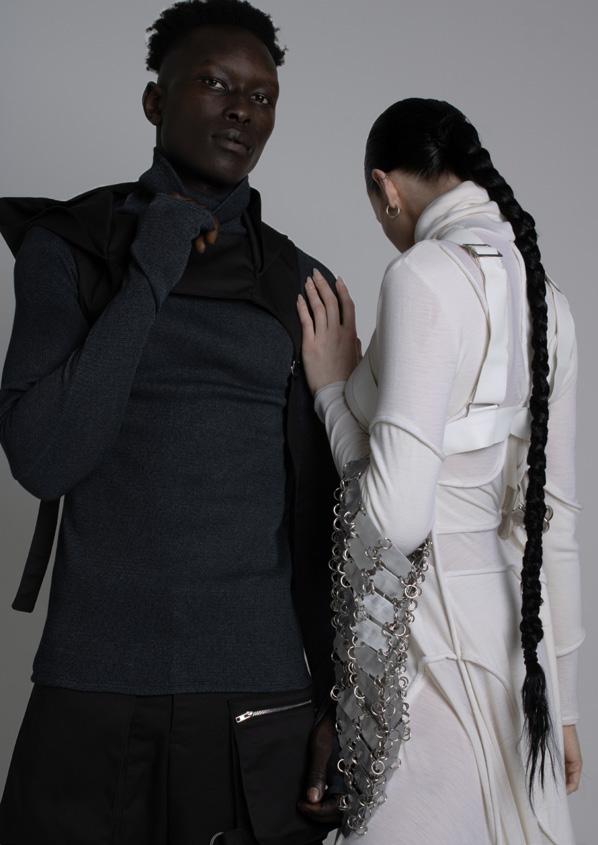 be. Reassociation of materiality is evident in the collection through cactus leather; innovative use of this previously powdered fabrication has taken form of unworldly shapes. We are refining the idea of planetary thinking and utilising the earth’s creations as a point of sustainability. A dichotomy of the soft yet structured nature of the cactus leather is paired with the rugged aluminium extracted and produced from the Earth’s minerals. This aluminium takes form in different shapes and sizes to represent the growth and regression of our world. Textured merino wools and soft cottons add an aspect of softness to tie the collection together while instilling a dystopian element to reflect the aluminium. A custom-printed polyester brings elements of utopia through the print and light colours used, while the design of this piece is created to distort the body. Long and bold silhouettes distort the body, giving the illusion of deformation of being, while the tight merino wool piece refines the body to bring it back to reality.