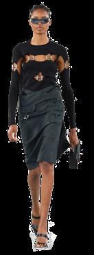 Repeated use of fabrications for different pieces creates continuity and a monochrome look. These pieces can be layered and interchanged to create new and unique outfits while still giving a utilitarian and dystopian impression. The Cropped Pocket vest (€ 300) and Calyptic Skirt (€ 830) use a grey cotton-elastane blend. Unique hardware details are seen through the exposed zips of these pieces and the continual use of D-rings in the body of the skirt and at the waistband. They link to the rugged aluminium, which industrialised the collection in a post-apocalyptic way. On this body, the aluminium is found in the from of a crop top (€ 1200), mimicking an interation of the hero, alumninium dress.