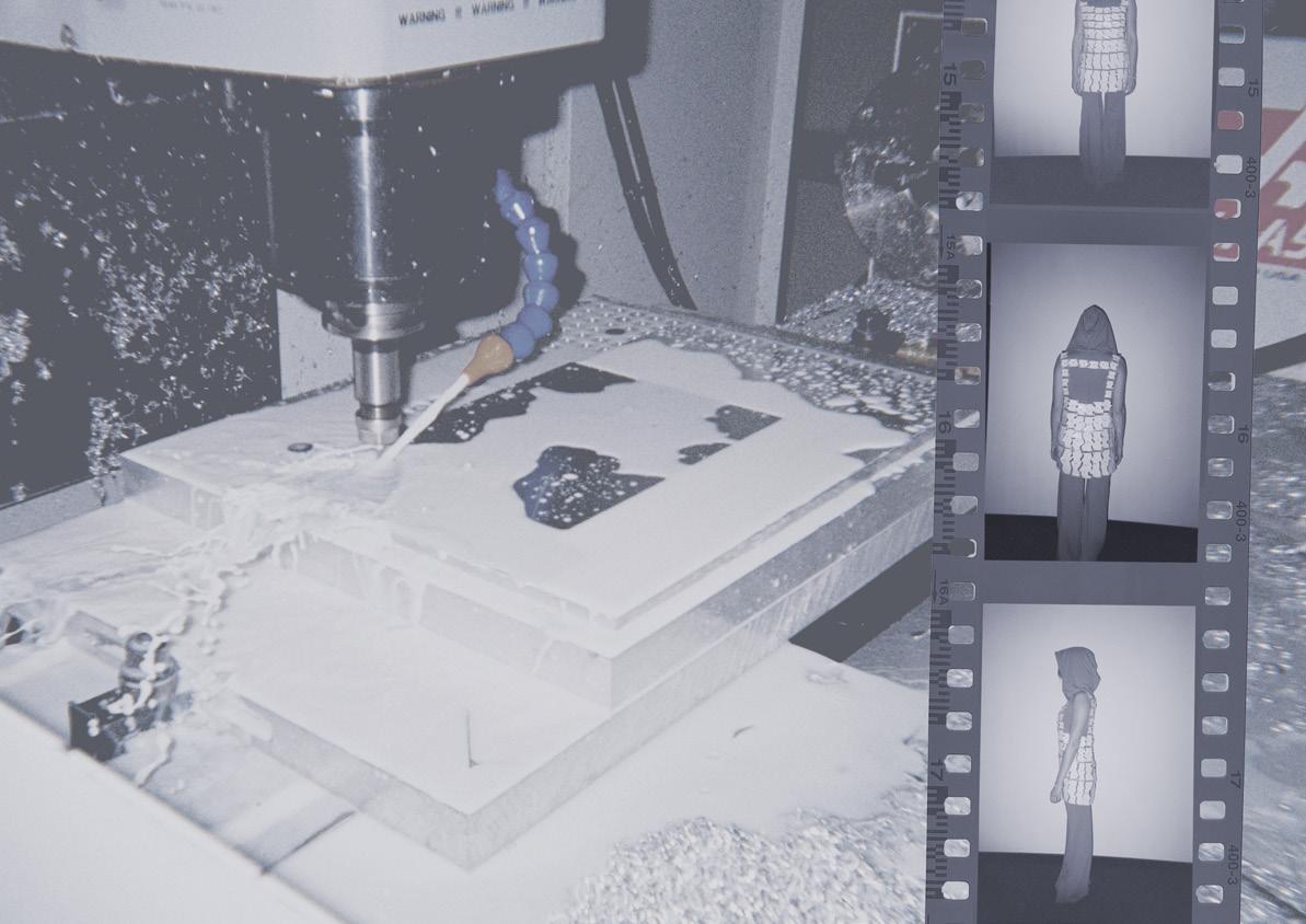 Photographer- Adam Epps Model- Isobel CelesteSoft fabrics are clashed with harsh industrial materials to create an illusion of reality. Together, they distort the intention of what clothing should be made out of. Explored through intricately cut aluminium, the ragged material was extracted and produced from the Earth’s minerals, taking the form of a new product. Repeat use of ragged edges and curves are found in the texture of charcoal merino wool. Wool again is a natural material and looks soft and sleek against aluminium. A custom-printed, splashproof polyester takes the form of pant, distorted with exaggerated fullness, further distorting the wearer themselves. This print is a distorted