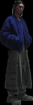 New light and optimism bring colour to the mix of charcoals and darker shades. A custom print of a distorted photo brings a utopian sense to a dystopian atmosphere. The Neo Multi Pant (€ 750) is made from this fabric and features a wide leg silhouette with panels at the side seams and white cactus leather straps with silver hardware details.