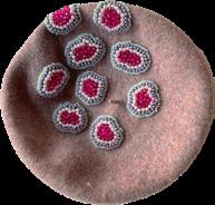 The look is accessorised with a granny square balaclava designed and crocheted by me, and a pair of checkerboard tights hand beaded with hundreds of purple pearls.
