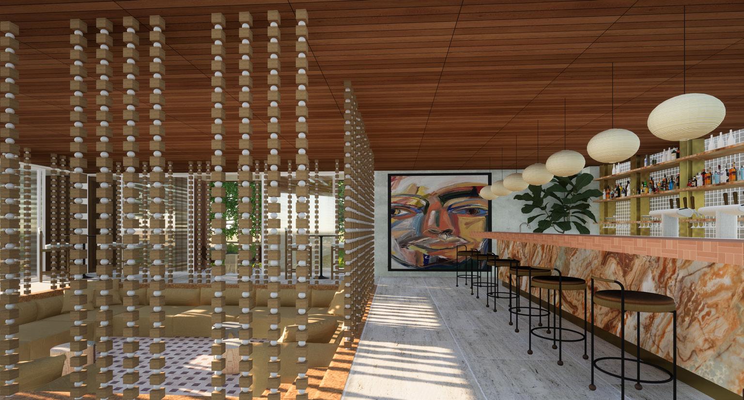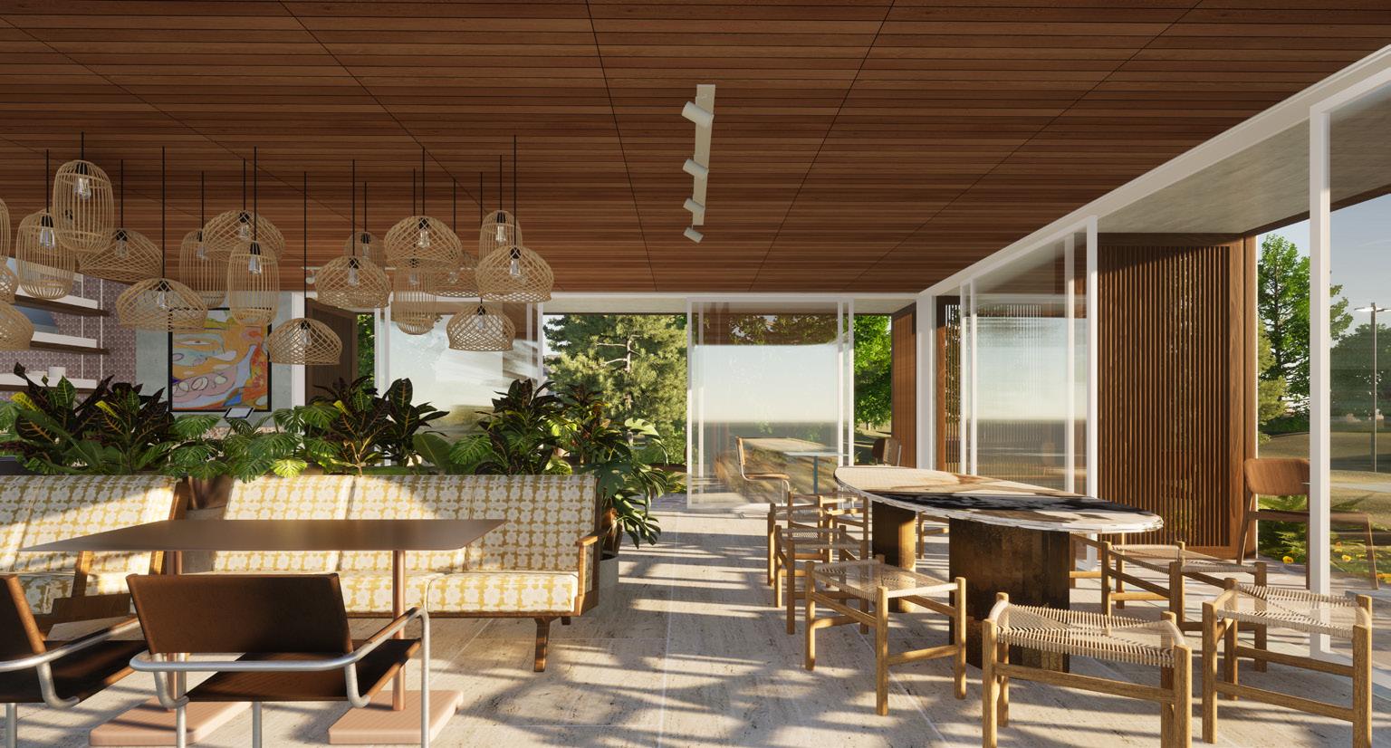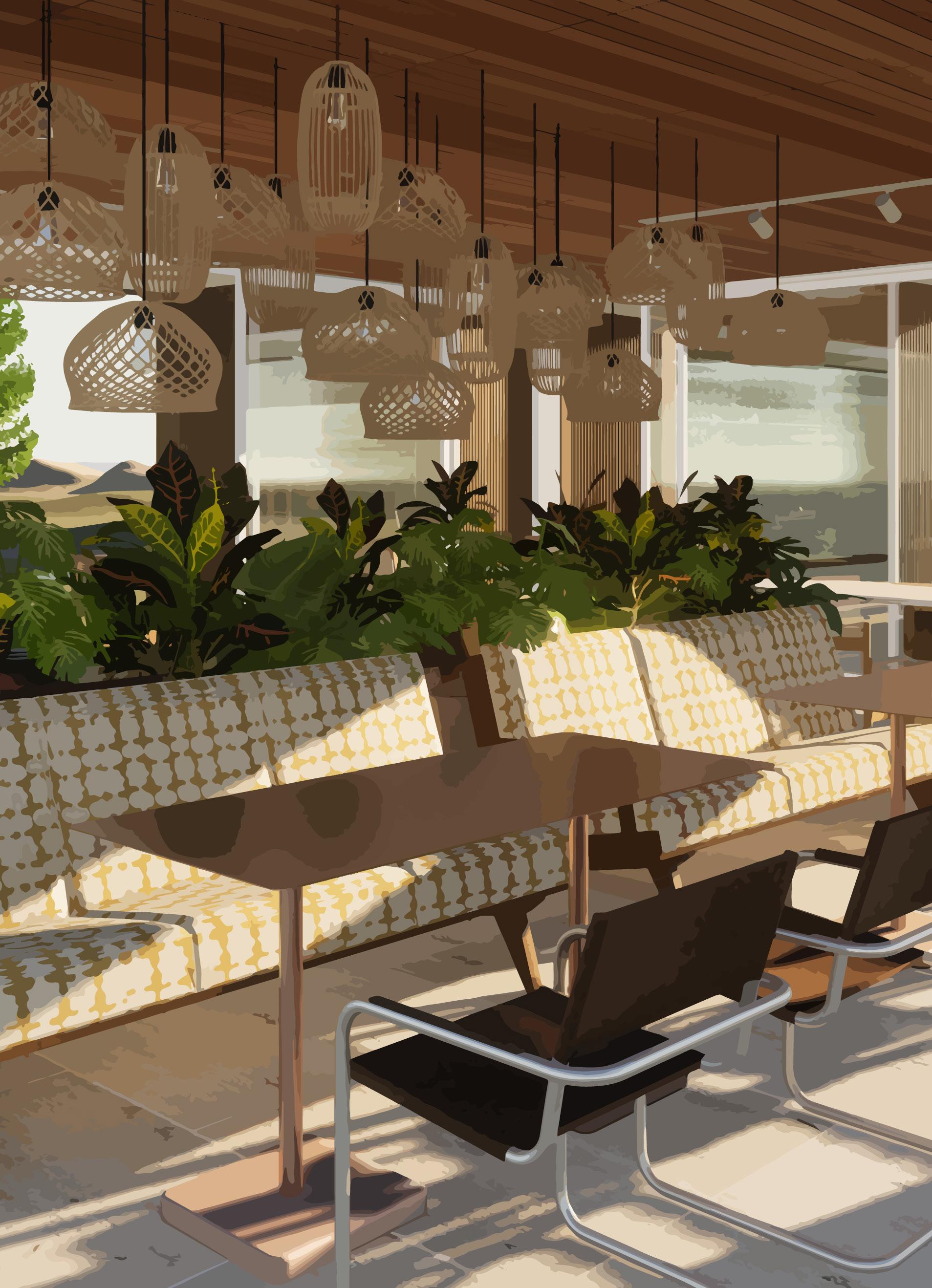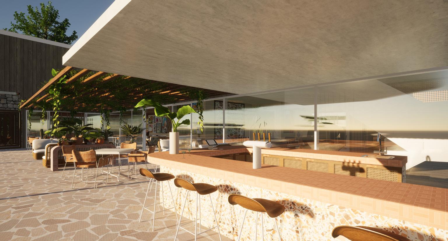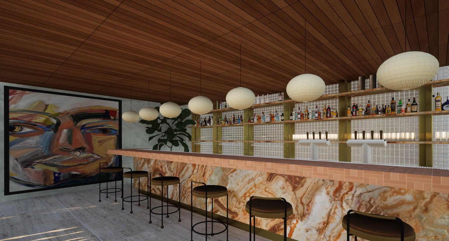 The concept will be demonstrated through juxtaposition between curves and edges, varying levels, a nostalgic colour palette, local art, ambient lighting and mid-century modern furnishings and fixtures. To accentuate the mid-century modern feeling, influences crazy paving, wallpapers, sculptural lighting and rattan will be applied with a contemporary twist through engineered wood, laminex, polished concrete and fluted glass.
