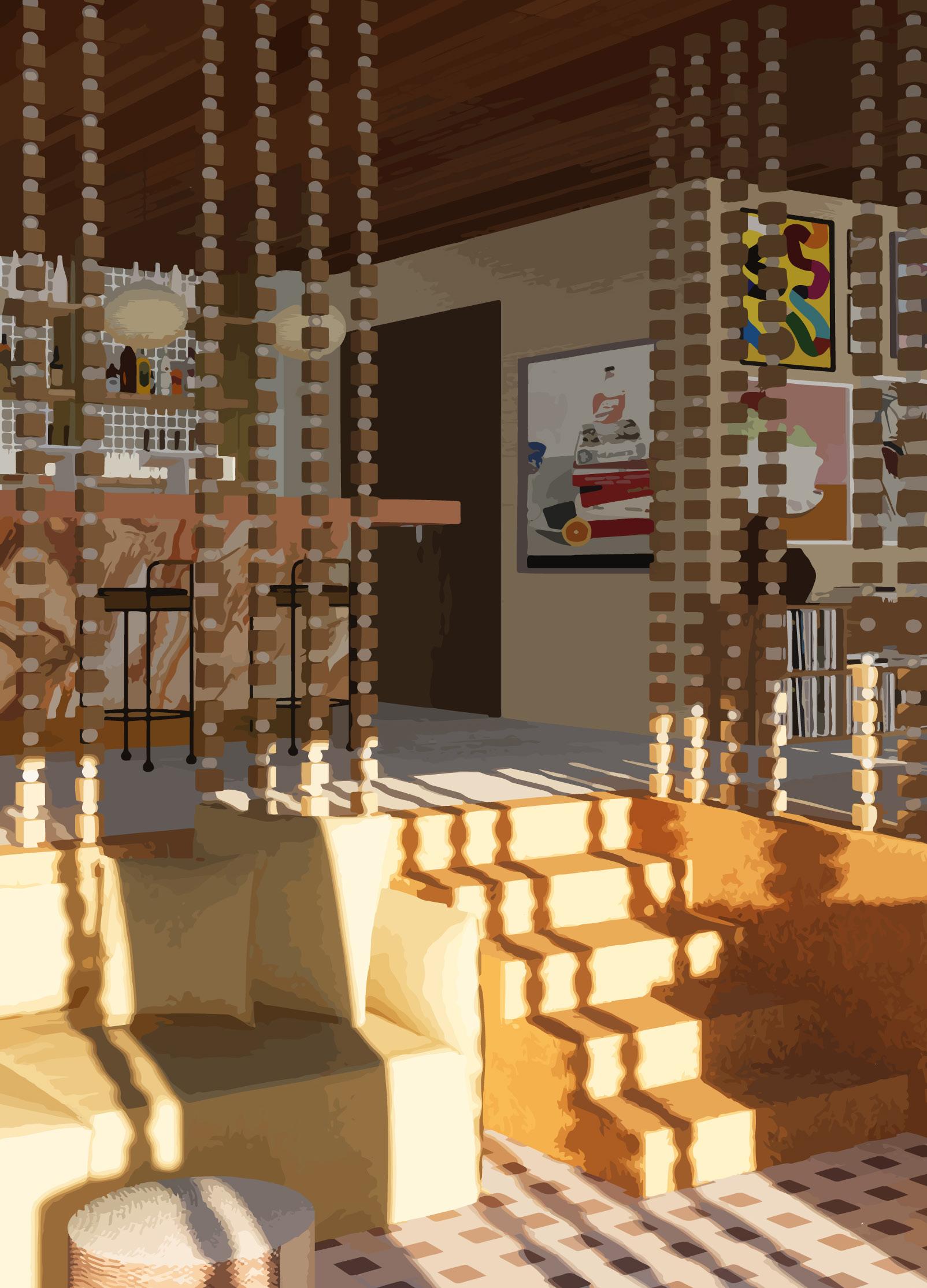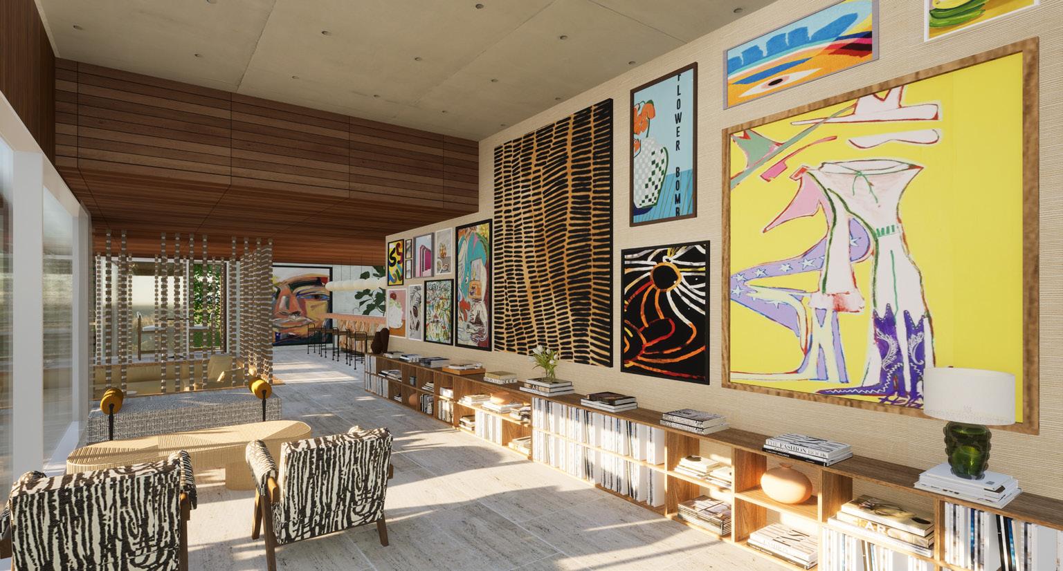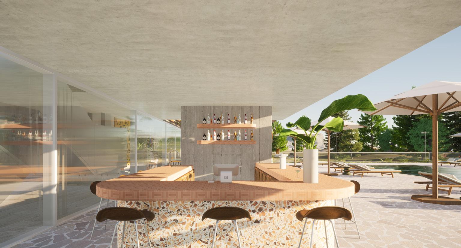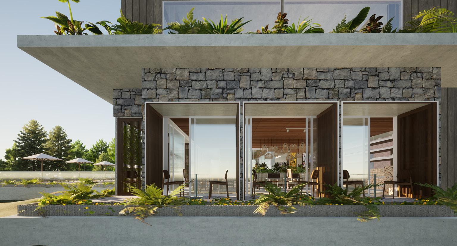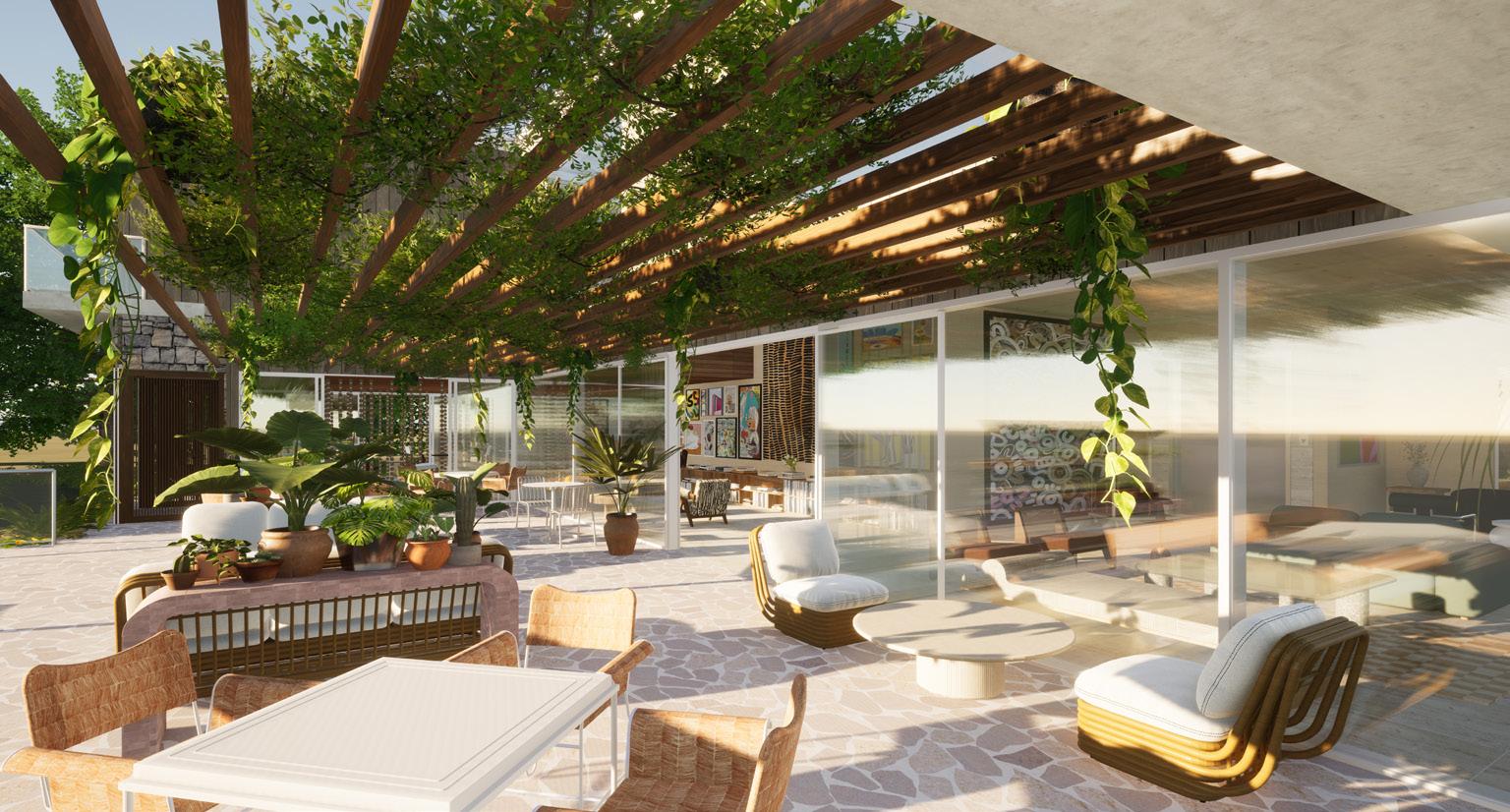 The concept will be demonstrated through juxtaposition between curves and edges, varying levels, a nostalgic colour palette, local art, ambient lighting and mid-century modern furnishings and fixtures. To accentuate the mid-century modern feeling, influences crazy paving, wallpapers, sculptural lighting and rattan will be applied with a contemporary twist through engineered wood, laminex, polished concrete and fluted glass.