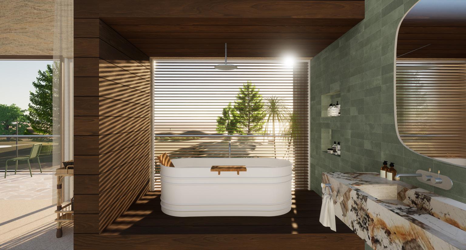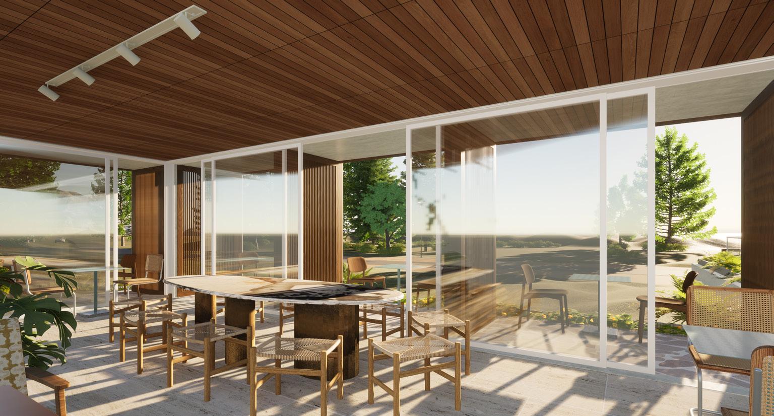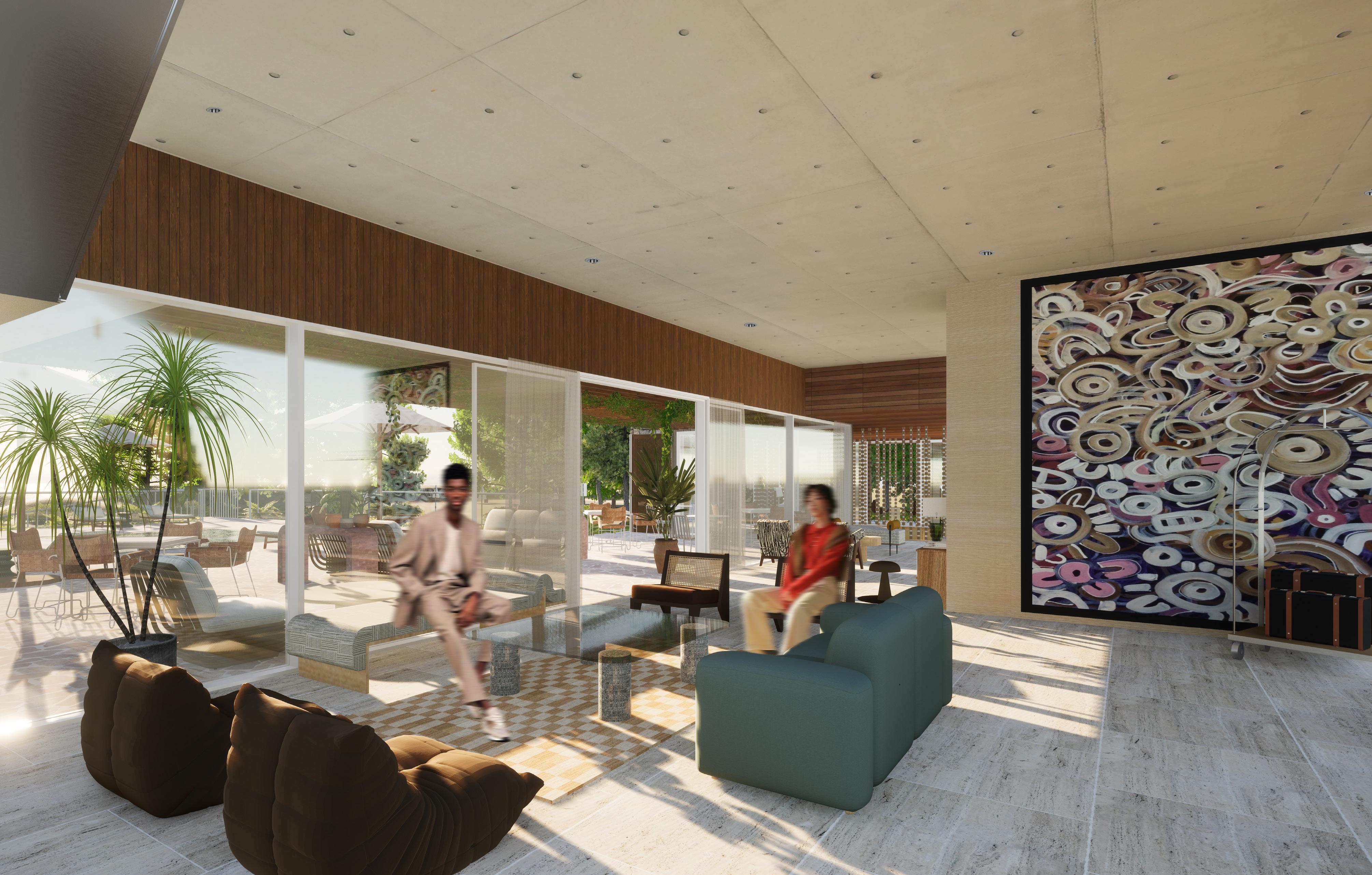 The project is committed to, and will implement this process to Ace Hotel’s workflow/framework when developing the design. It focuses on three elements, nature, people and design - these elements together create a ternary relationship where emotions and feelings connect to biophilic design. Performance is related to the architecture and urban design while comfort stems from passive design. With these three factors, Ace Hotel Barrenjoey will have an ecocentric approach of respecting the natural landscape, honouring the land’s history and connecting with the surrounding environment. The hotel will feature an abundance of aboriginal artwork, from artists such as Maria Watson-Trudgett, Glenys James, Cecily Napanangka Marshall, Emma Nangari Roepke, Karen Napaljarri Barnes and Vivienne Nakamarra Kelly. Sustainability of the hotel will be achieved by installation of solar panels and two green roofs on the first floor to minimise energy usage and impact on the surrounding environment. Sourcing local building materials and furnishings is also a top priority, with 100% of all building materials and 70% of all furnishings and fixtures sourced locally from Australia. The proposed site will also consider the aesthetics towards the landscape with 90% of vegetation on the site being Australian species, ensuring to blend in and not disrupt the pristine coastline.