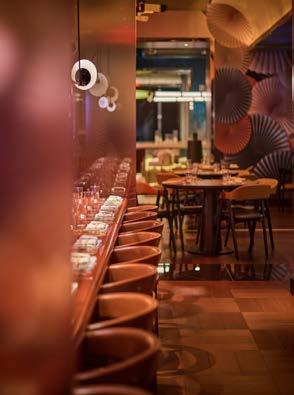 Small to medium-sized gatherings may be accommodated in the area to the right, where soft creams have re placed the red tones and the wagasa wallpaper designs have returned. While participating in the restaurant’s idea, the range of finishes in the space has demonstrated a powerful representation of each aspect. These were seen not just via the elements of the walls and ceilings, but also in the furniture options. such as the restaurant’s many seating options, which vary from booth seats to dining table chairs in a wide spectrum of colours. To bal ance out the aspects from the harsh to the softer touches of the restaurant, the space also has a variety of straight lines and curves.