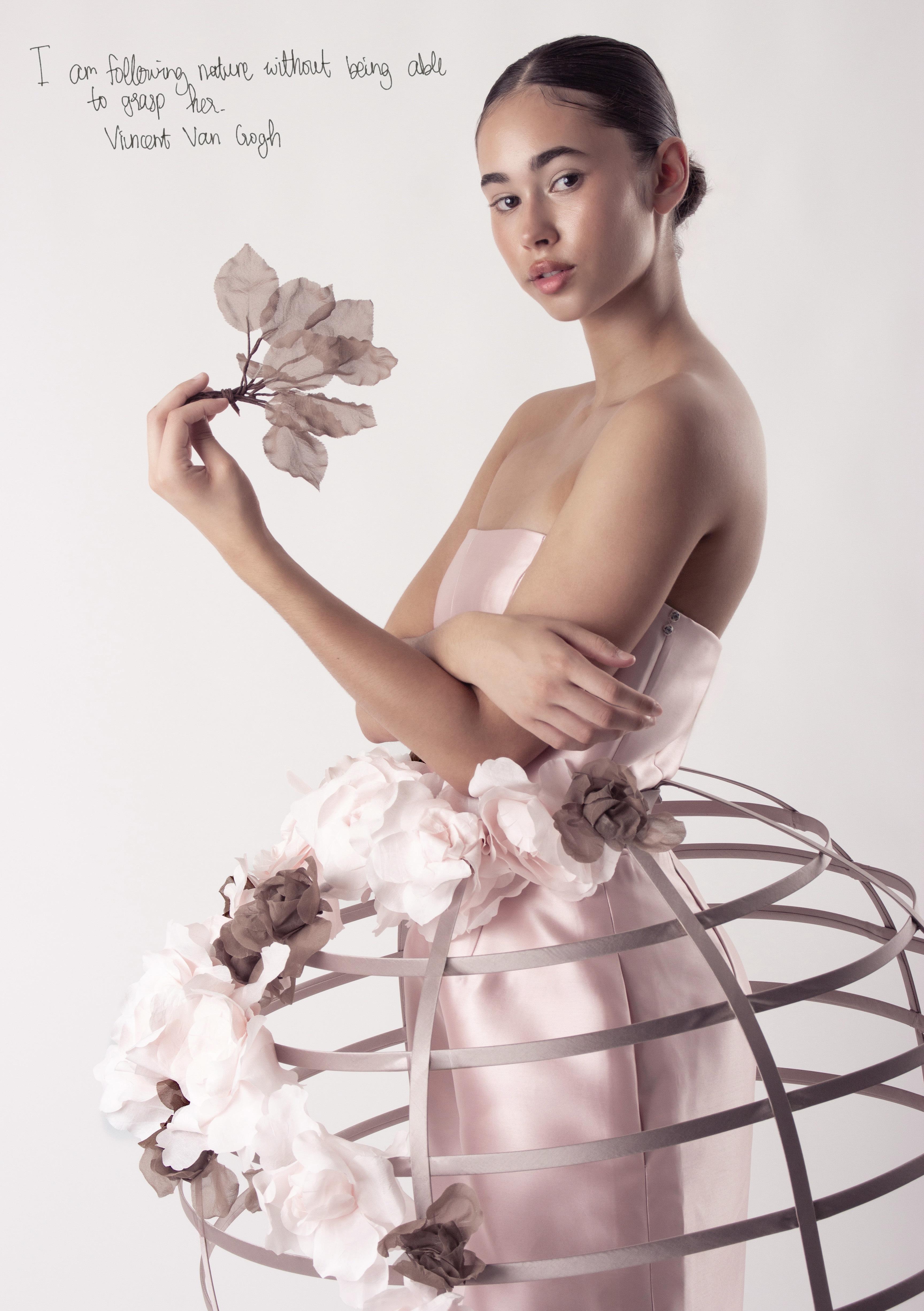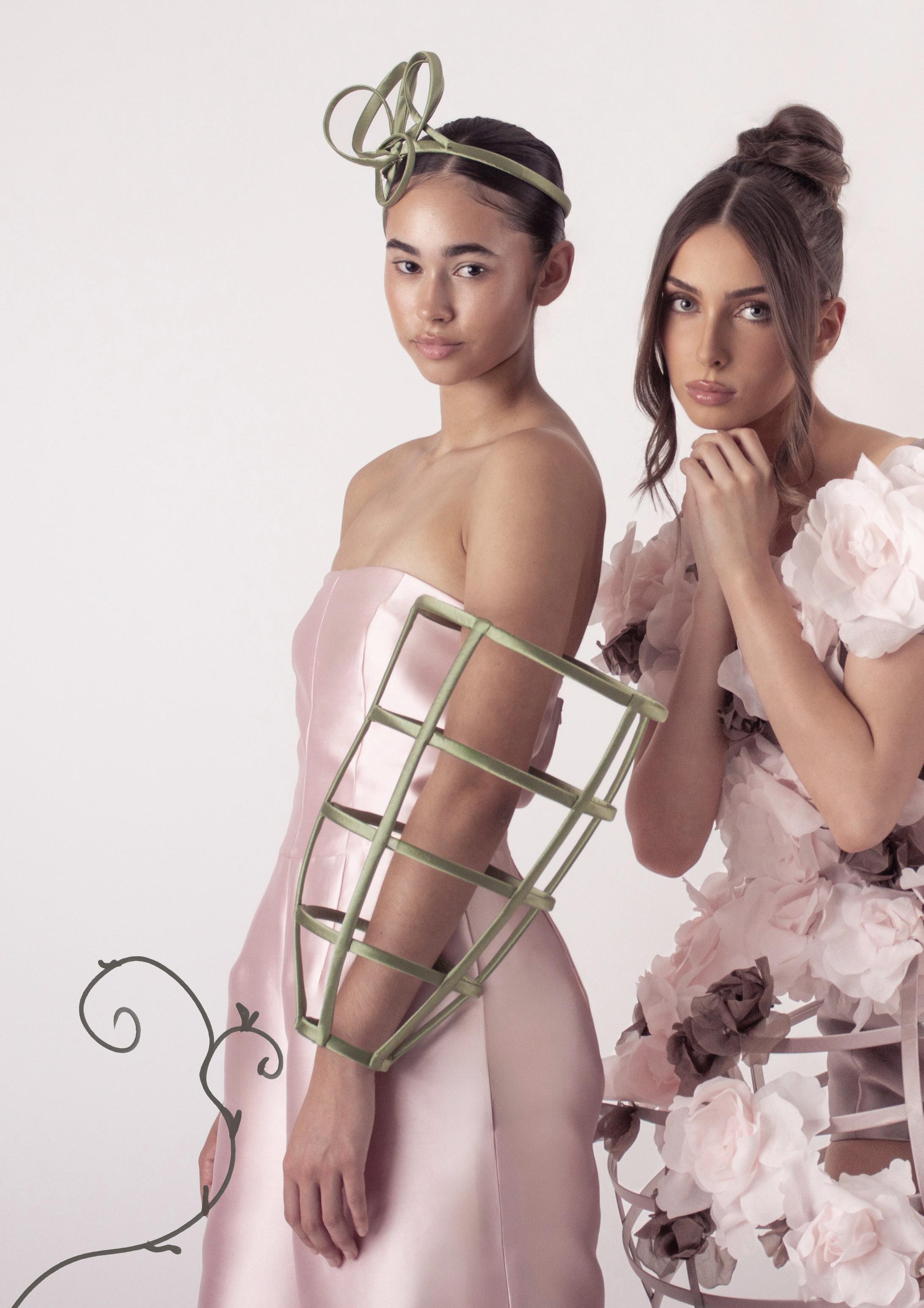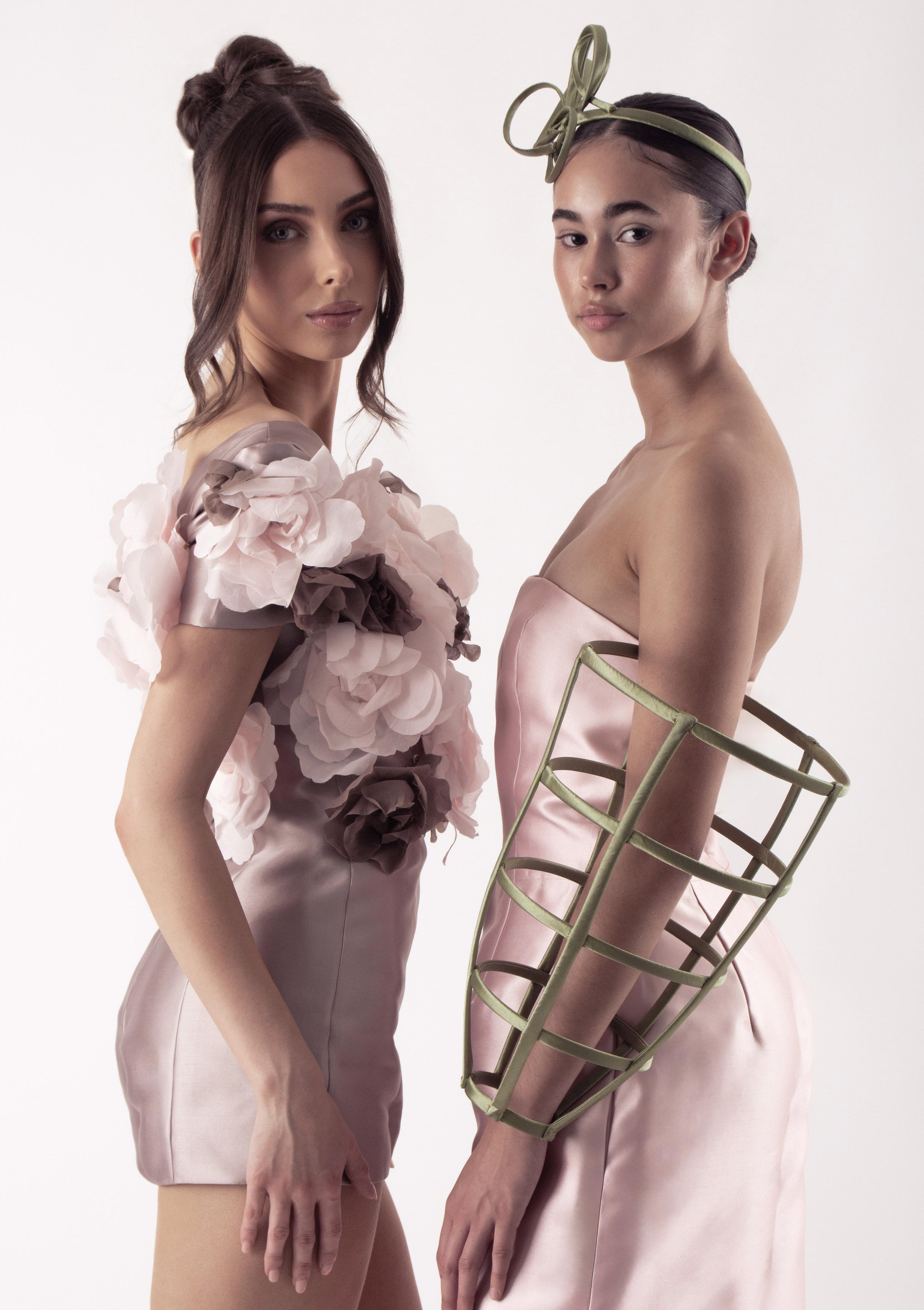 Consisting of three main looks, Roseatte, Petale, and Vigne; the collection captures the life cycle and symbolism of a rose in bloom. Roseatte stands as the hero piece, embodying the concept of emergence, beauty, and self-assured femininity. From this central idea stem the complementary designs. Petale, a fitted jumpsuit featuring a couture created cage sleeve, displays structure refined into lightness, such as the layered geometry of unfolding petals. Vigne, a mini princess-line dress accompanied by a customhandmade headpiece, embodies the organic nature of growth and the delicate curves of climbing vines. Together, these three looks form a cohesive collection that embodies a blossoming identity, each contributing to the truest form of transformation in a feminine form.