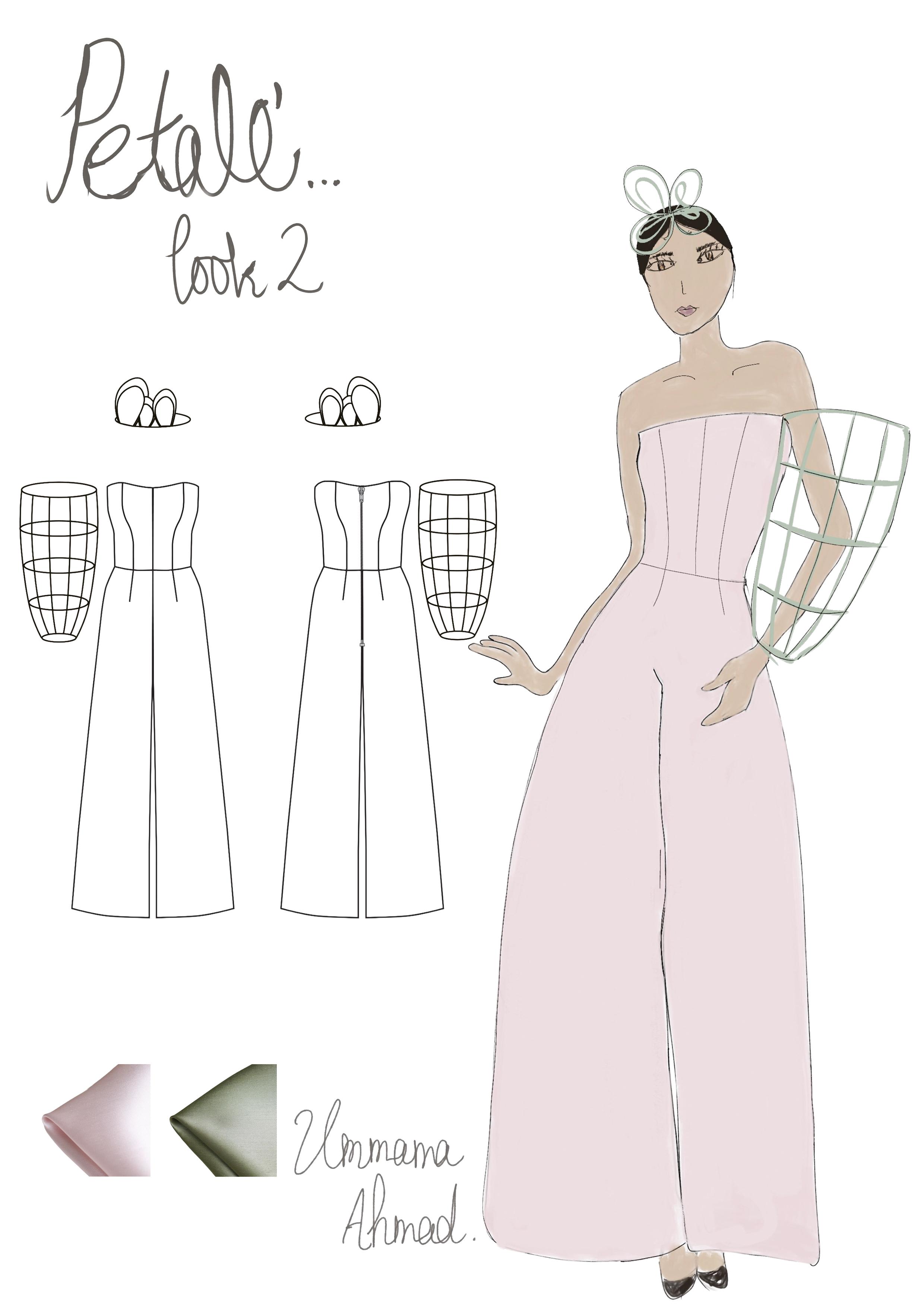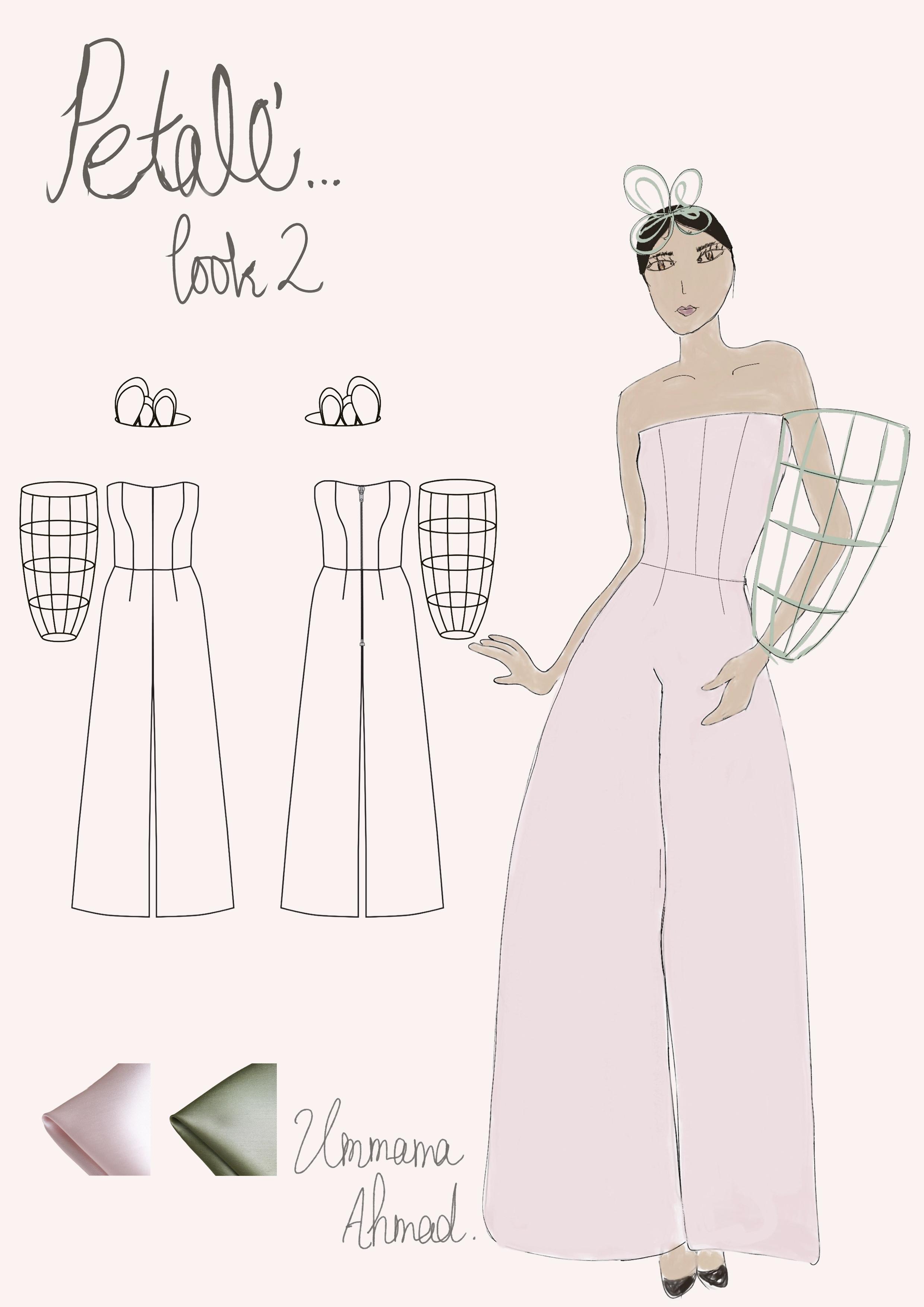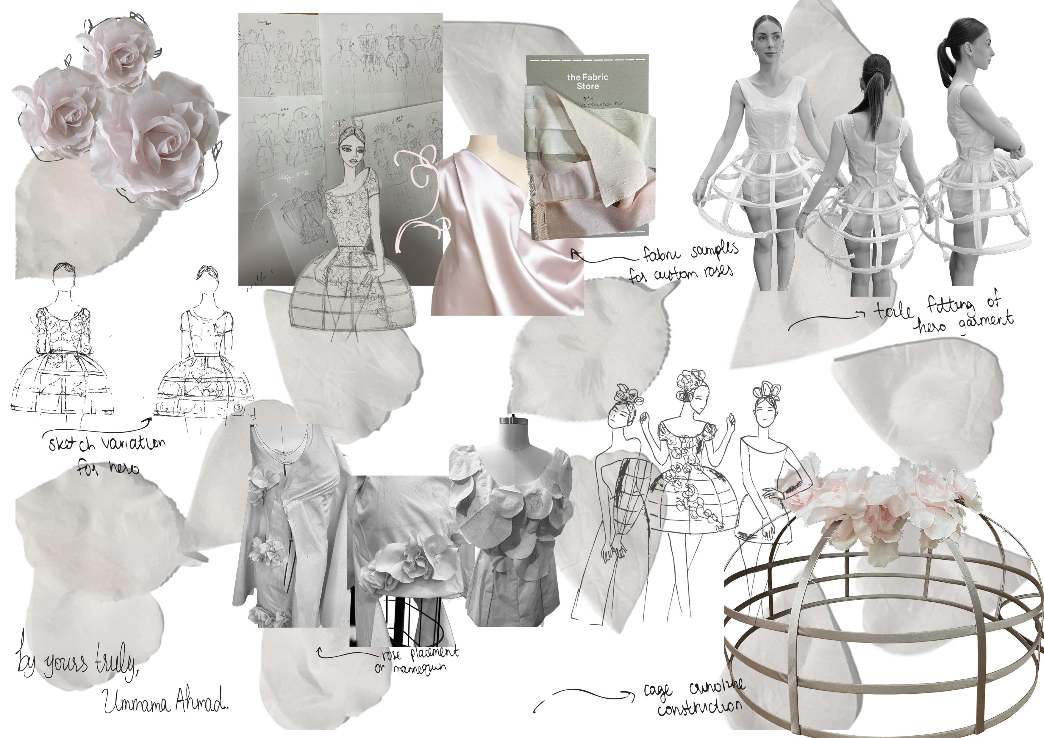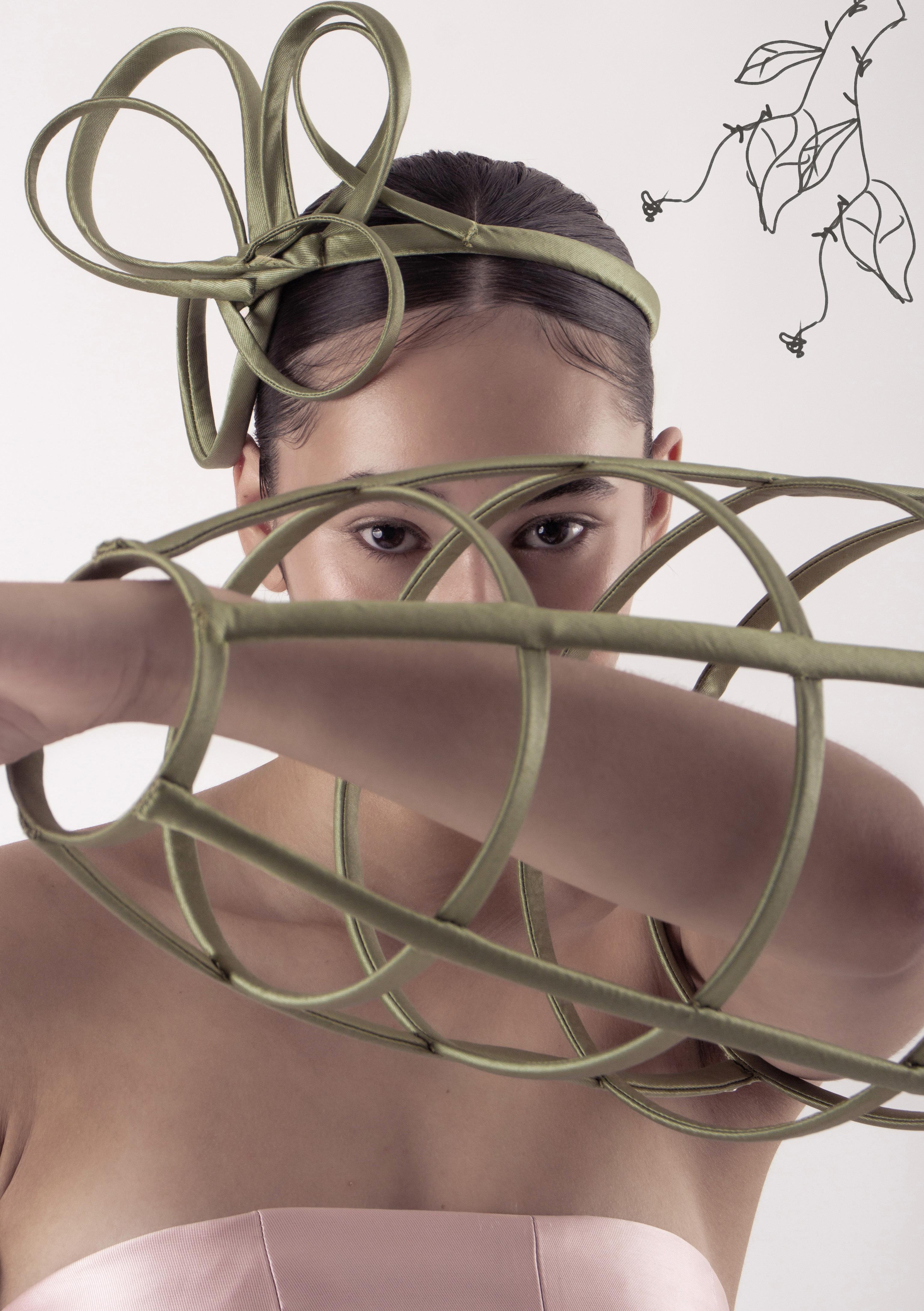 Consisting of three main looks, Roseatte, Petale, and Vigne; the collection captures the life cycle and symbolism of a rose in bloom. Roseatte stands as the hero piece, embodying the concept of emergence, beauty, and self-assured femininity. From this central idea stem the complementary designs. Petale, a fitted jumpsuit featuring a couture created cage sleeve, displays structure refined into lightness, such as the layered geometry of unfolding petals. Vigne, a mini princess-line dress accompanied by a customhandmade headpiece, embodies the organic nature of growth and the delicate curves of climbing vines. Together, these three looks form a cohesive collection that embodies a blossoming identity, each contributing to the truest form of transformation in a feminine form.