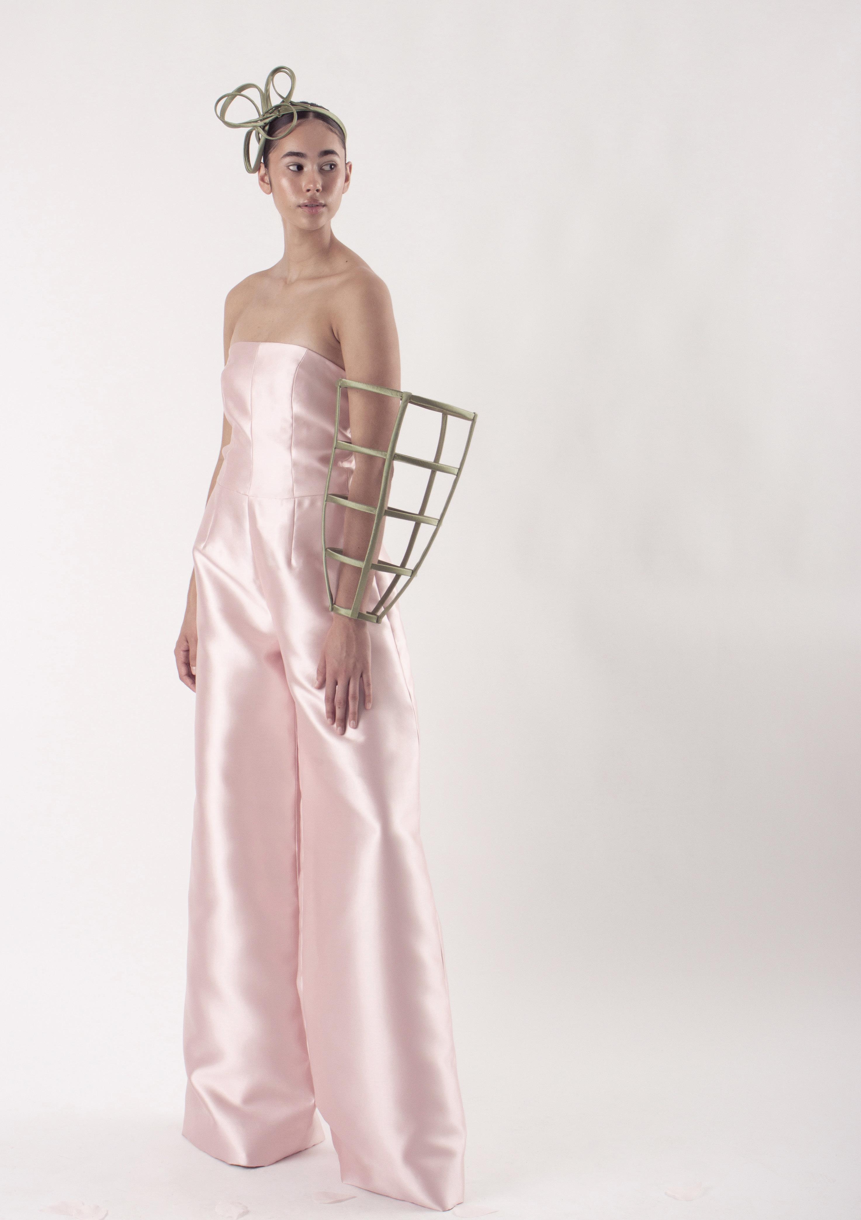 Jumpsuit with wide leg pants, cage sleeve and custom bespoke headpiece