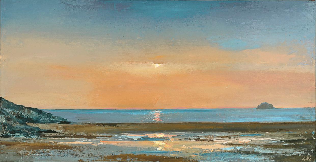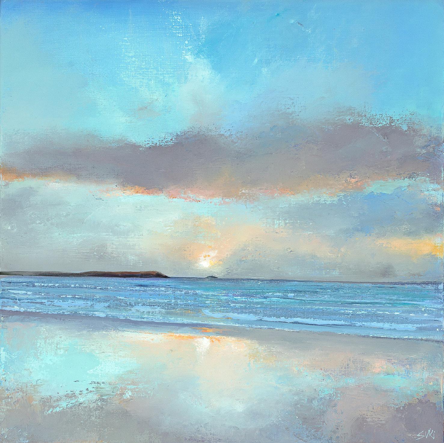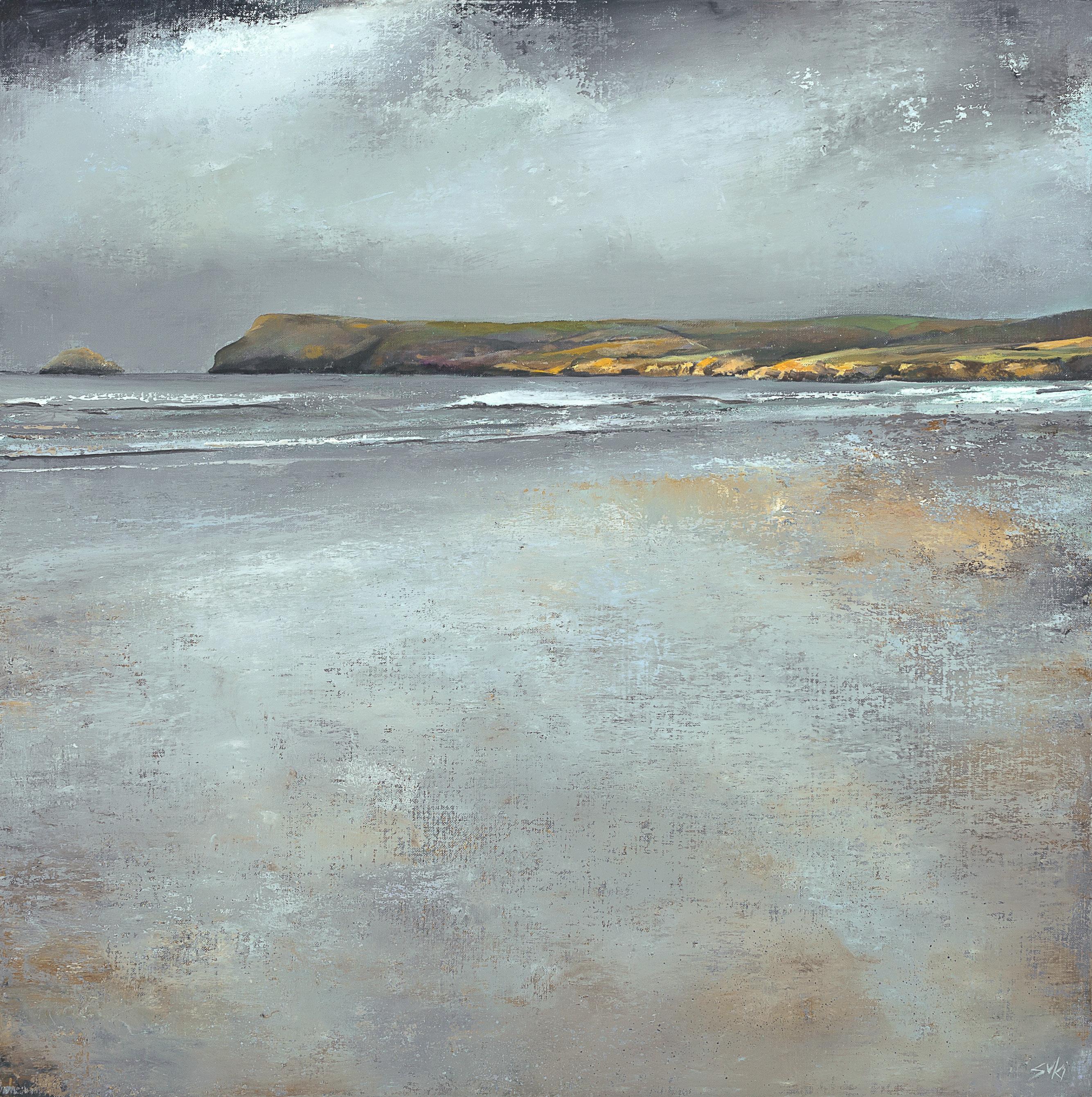 Working with a palette knife and brush, Suki creates richly textured imagery and powerful compositions, with low set or dramatically high horizons that convey the awe-inspiring grandeur of the space where land meets sea, lit by the hazy Cornish sunshine which radiates through layers of rain and cloud. Looking out across sands at low tide and taking in spectacular views of Pentire and Stepper Point, these paintings capture the blue tinted light of Cornwall’s ever shifting skies, reflected on wet beaches and rolling ocean waters.