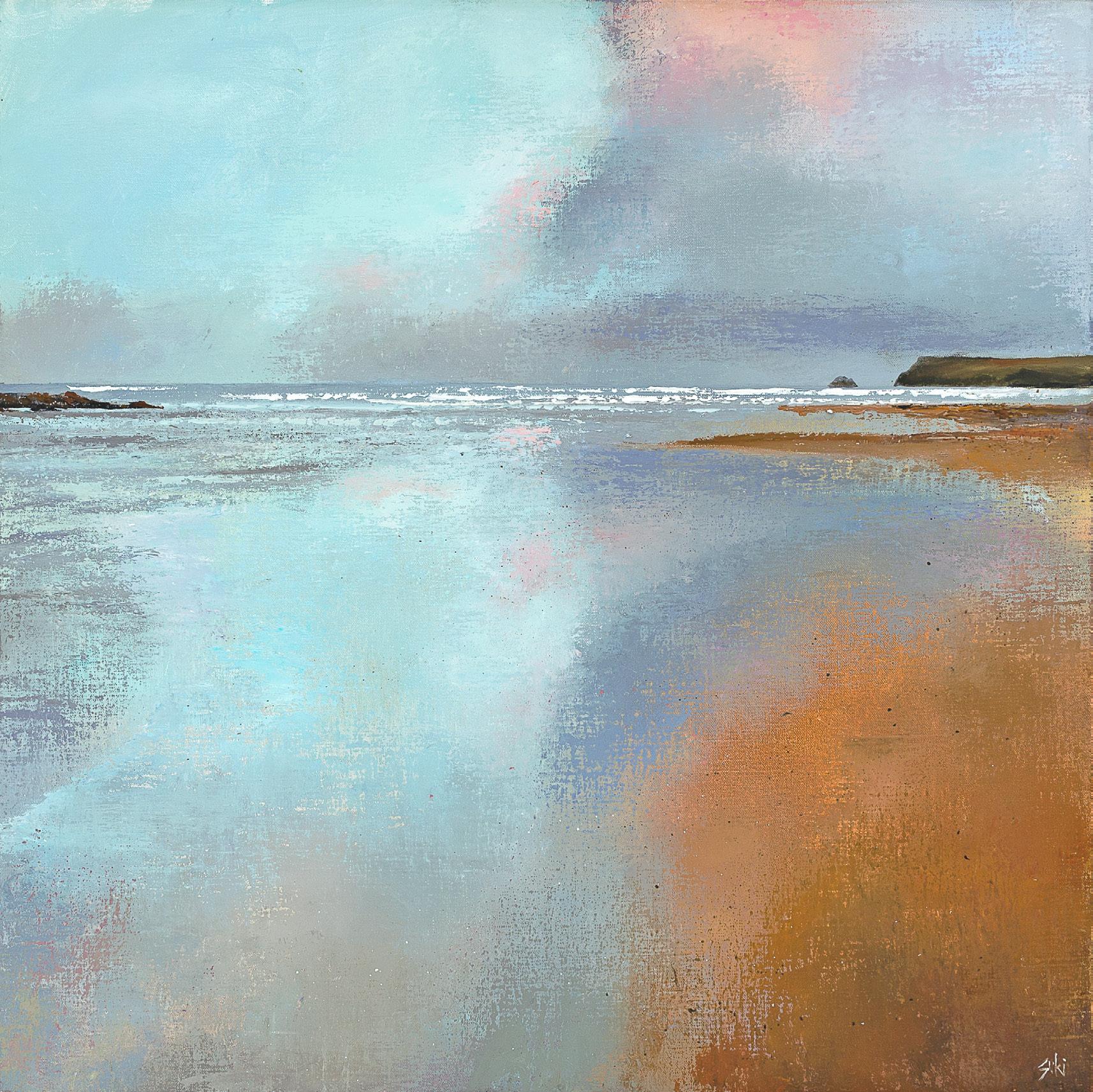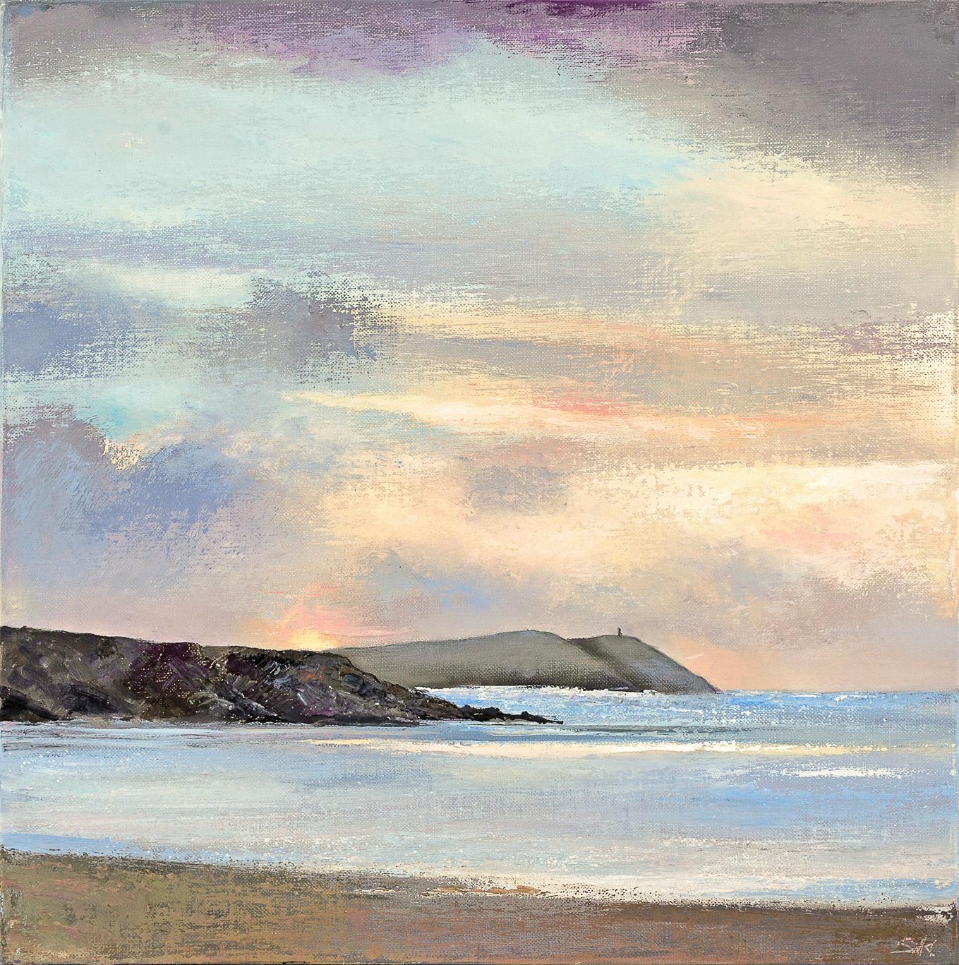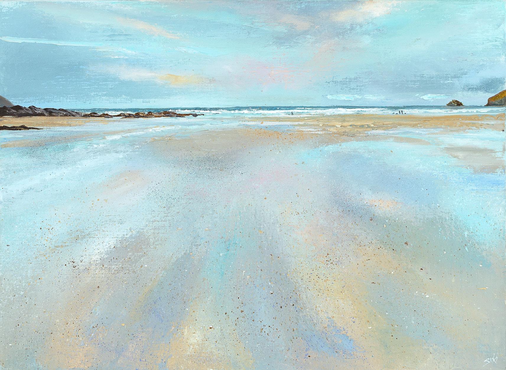 Working with a palette knife and brush, Suki creates richly textured imagery and powerful compositions, with low set or dramatically high horizons that convey the awe-inspiring grandeur of the space where land meets sea, lit by the hazy Cornish sunshine which radiates through layers of rain and cloud. Looking out across sands at low tide and taking in spectacular views of Pentire and Stepper Point, these paintings capture the blue tinted light of Cornwall’s ever shifting skies, reflected on wet beaches and rolling ocean waters.