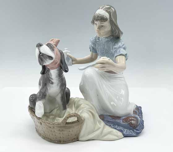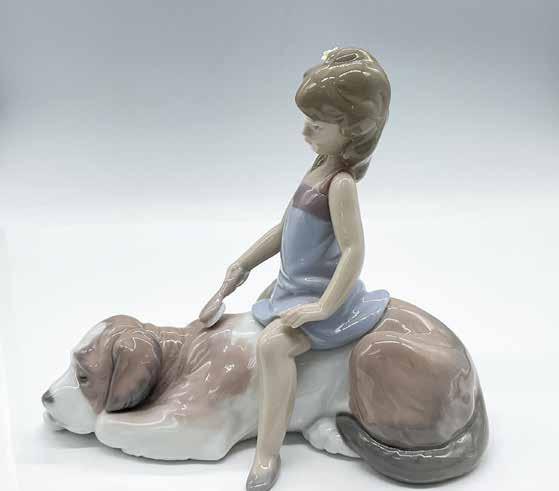 Lovely glossy figurine of a young girl softly brushing her sleeping dog. She has a dainty yellow flower in her hair. Lladro backstamp.