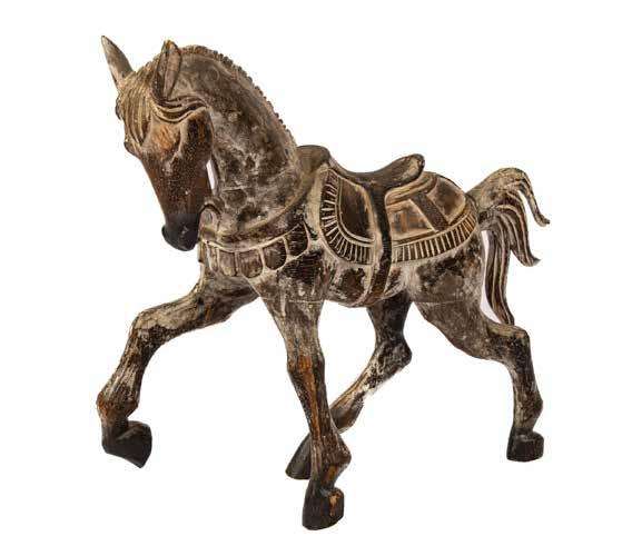 This horse sculpture is finely carved with detailed craftsmanship and finished in a natural-looking whitewash.
