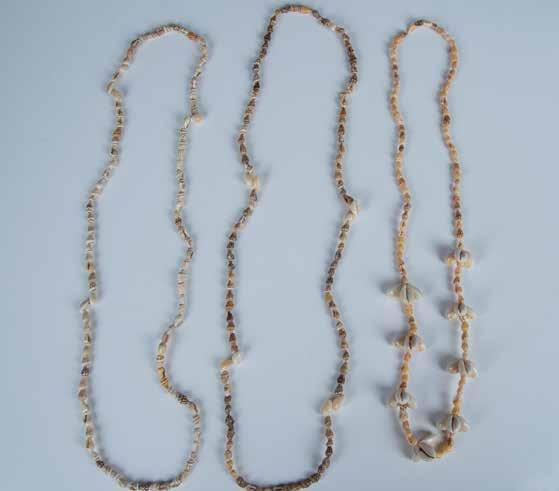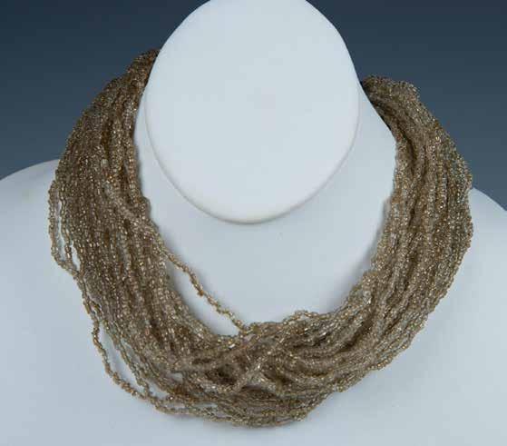 Two of the beaded necklaces are identical. Round discs with dangling strands on a suede cord. The pin is a similar style with more detail. The other necklace is a coiled ceremonial basket pendant on a silver tone chain. Beaded pendants: 2”dia. with 3.50”L bead strands. Suede cord: 18”L. Pin: 3.25”L x 1.50”W. Ceremonial basket necklace drop: 10.50”L.