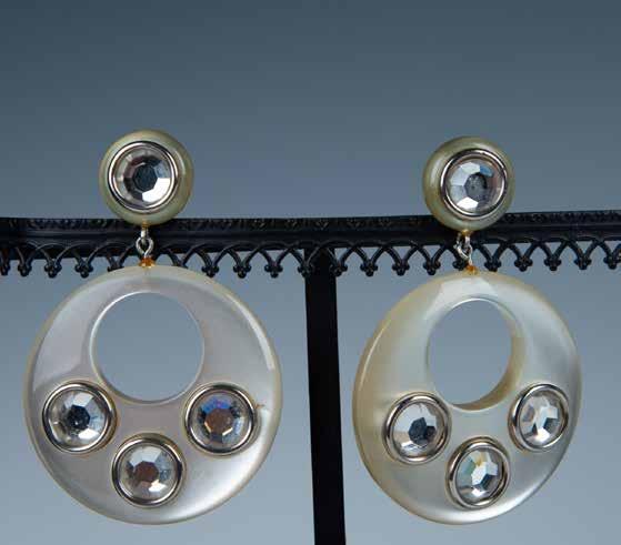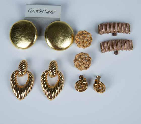 Two pair dangling, two pair enamel hoops and a retro groovy white diamond shape. All earrings are clip back.