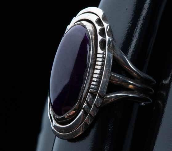 Beautiful Southwest Native American ring that features an oval sugilite stone set in hand crafted sterling silver with a geometric tribal pattern. Stamped R.B. Sterling on the back. Size 7.25. 6g.