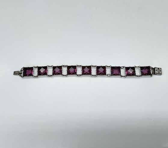 Beautiful Southwestern Native American bracelet with hand crafted sterling silver links featuring a geometric pattern made from inlaid purple sugilite. The artist mark is on the box tab clasp. When laid out, it measures approximately 7.25”L. 22g.