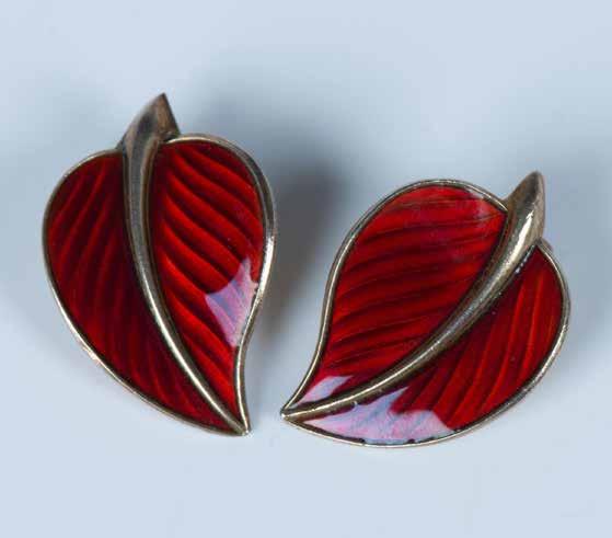 Beautiful clip-on earrings featuring red enameled leaves with goldwashed sterling silver backing. Stamped 925S Norway Sterling on the backs. 14g.