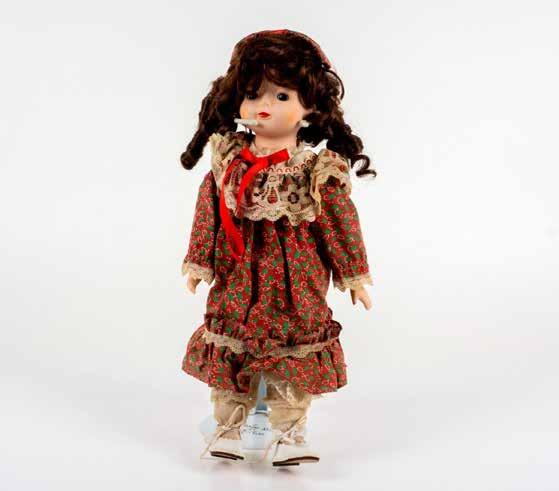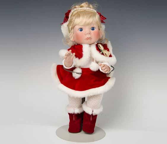 A brunette-hair doll in a red dress and bow with green holly and white lace. This item has a Heritage Mint Ltd. Collection base included. Doll: 16.5”H. Base: 4.5”L x 4.5”W x 7.5”H.