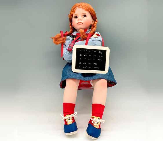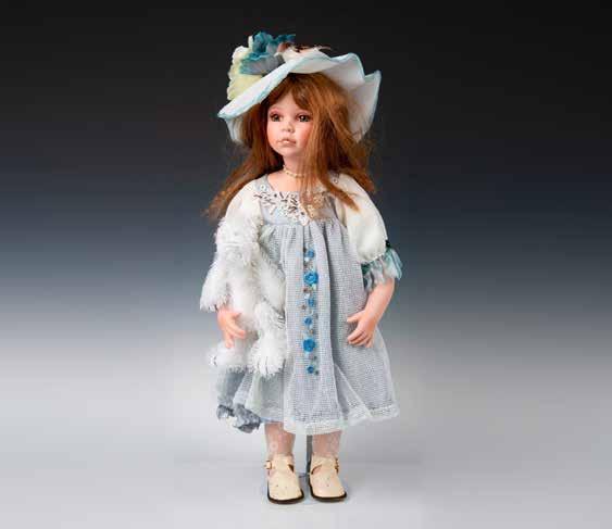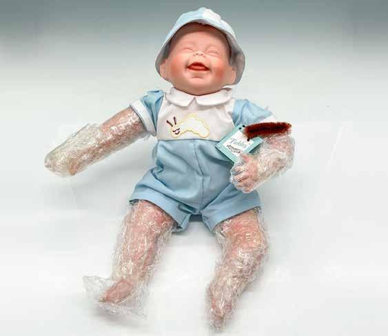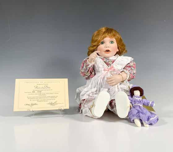 Doll with a hat and plush white elephant. Certificate of Authenticity included. She comes in her original box, which measures 27”L x 10.25”W x 5.5”H.