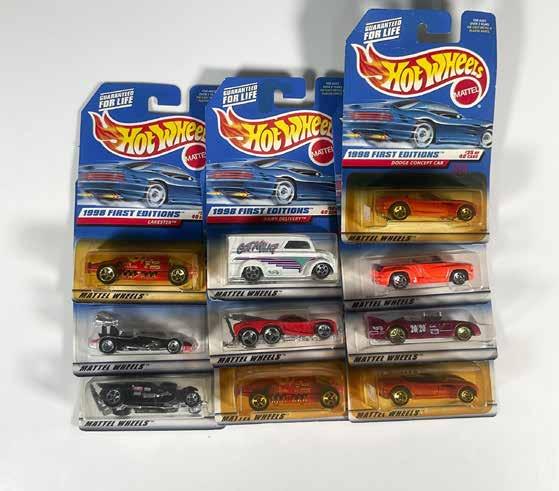 A set of 10 Hot Wheel toy cars that consist of the Dodge Sidewinder (3 of 45), 2 copies of the Dodge Concept Car (35 of 40), the Double Vision (40 of 40), the Dairy Delivery (10 of 40), 2 copies of the Lakester (12 of 40), the Tow Jam (25 of 40), the Super Modified (27 of 40), and the Super Comp Dragster (22 of 40). Marked 1998 First Editions. Each item has its original box. Dimensions of the original box: 6.5”L x 4.25”W x 1.5”H.