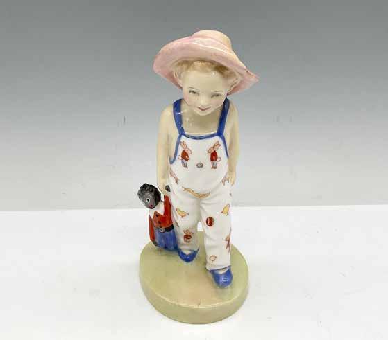 Glossy, hand painted figural dressed in patterned dungarees with doll. Royal Doulton backstamp.
