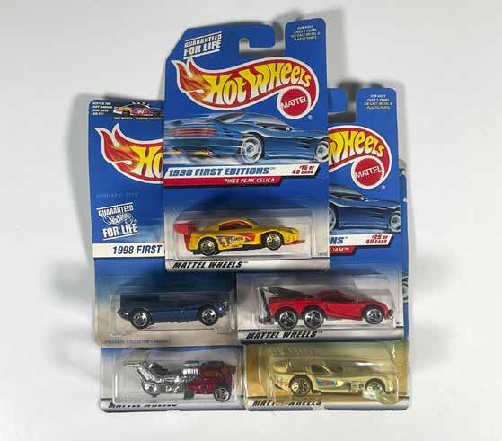 A set of 5 hot wheels toy car that consist of the Pike Peak Celica (15 of 40), the Panoz GTR-1 (19 of 40), the Tow Jam (25 of 40), the Jaguar D-Type (6 of 48), and the Whatta Drag (36 of 40). Marked 1998 First Editions. Each item has its original box. Dimensions of the original box: 6.5”L x 4.25”W x 1.5”H.