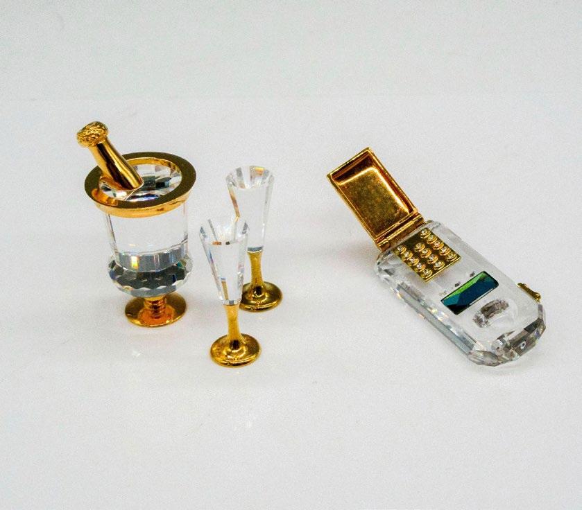 Clear crystal that is gilded on champagne bucket with glasses. Flip telephone with gold toned keypad and green crystal rest. Swarovski backstamp. This item has its original box: 2”L x 3.25”W x 1”H. Largest piece: 0.50”W x 1.5”H.